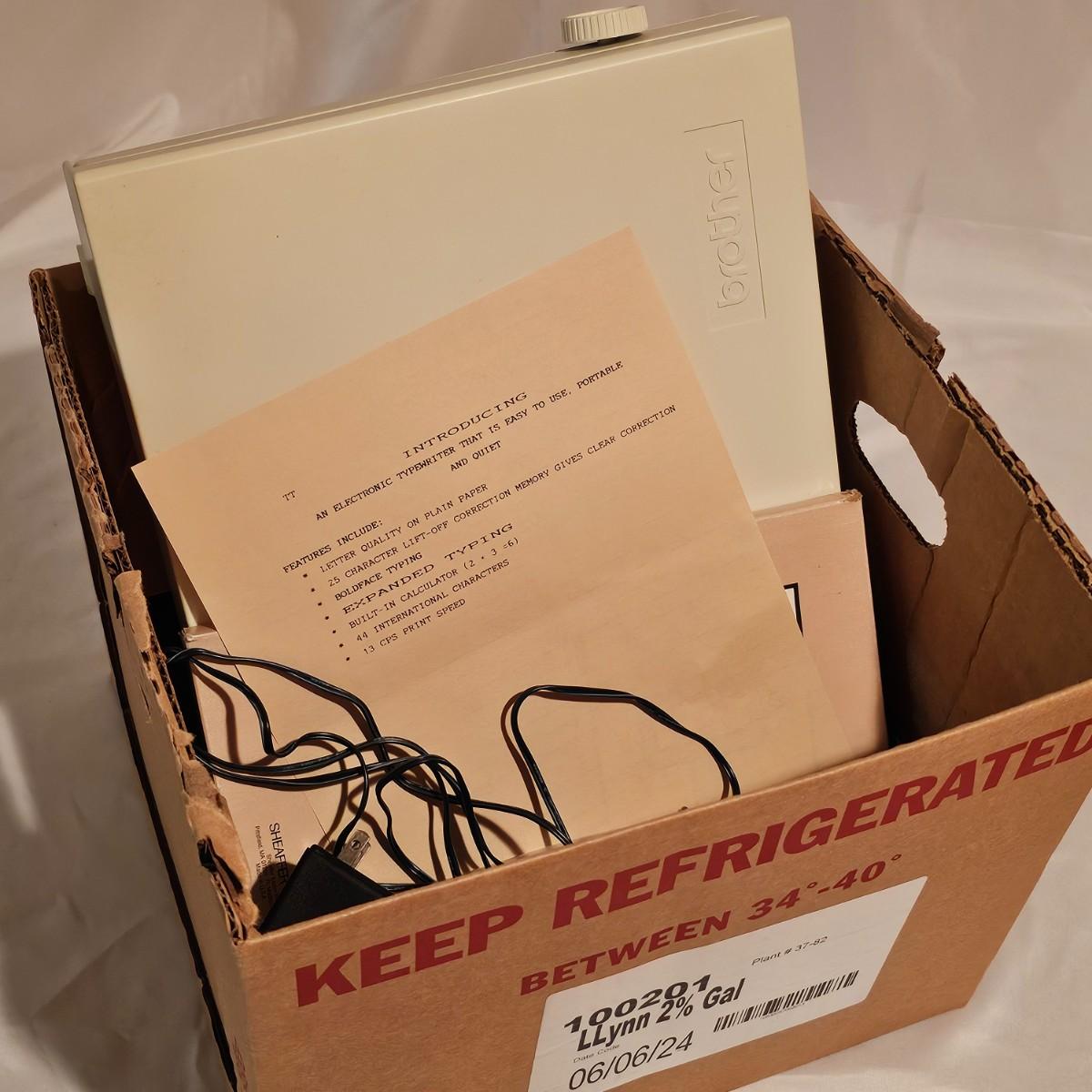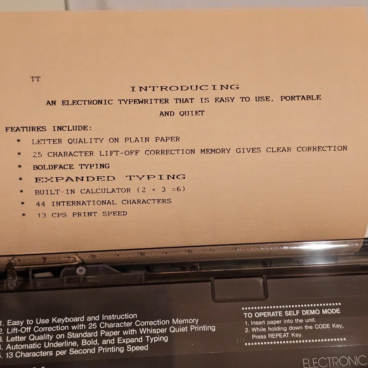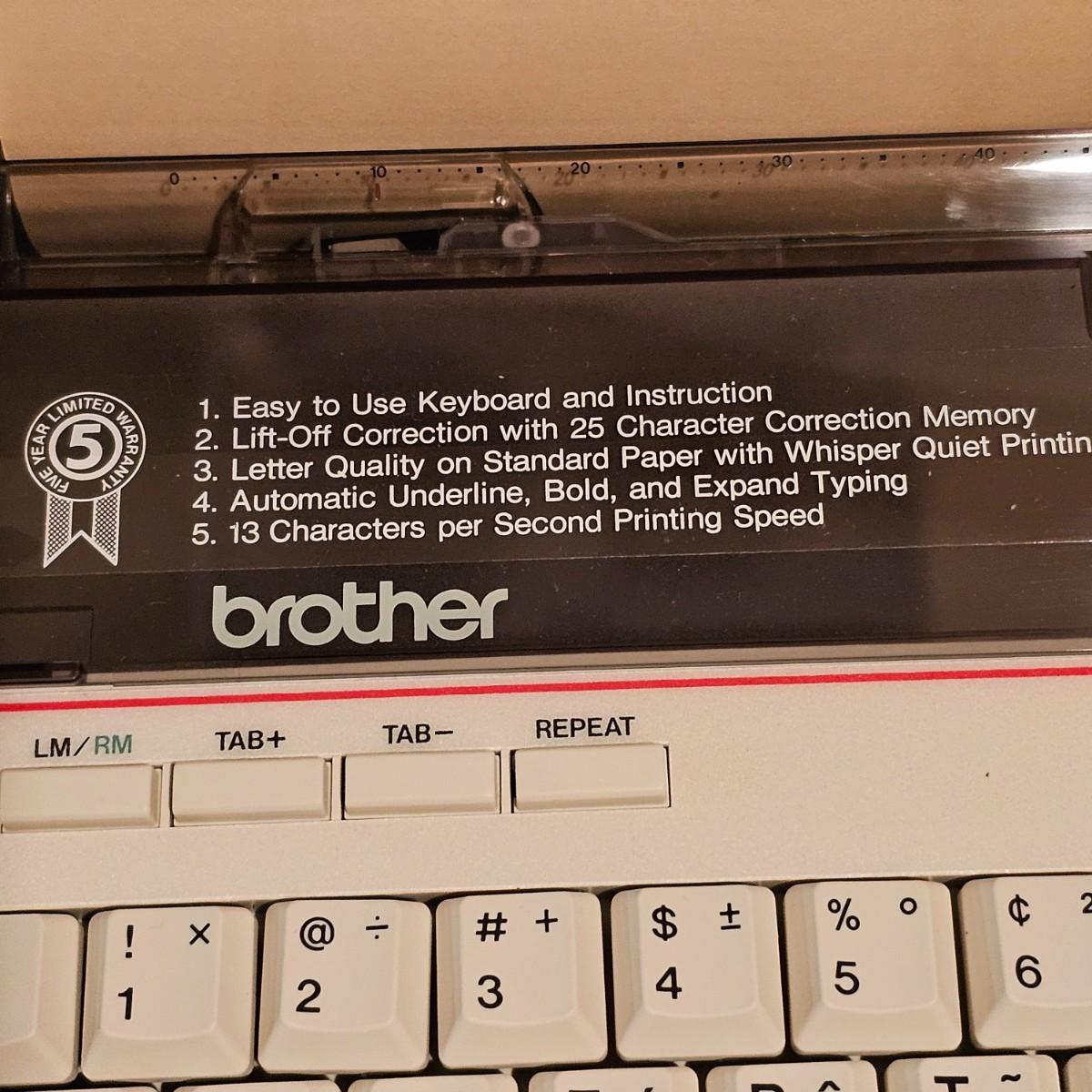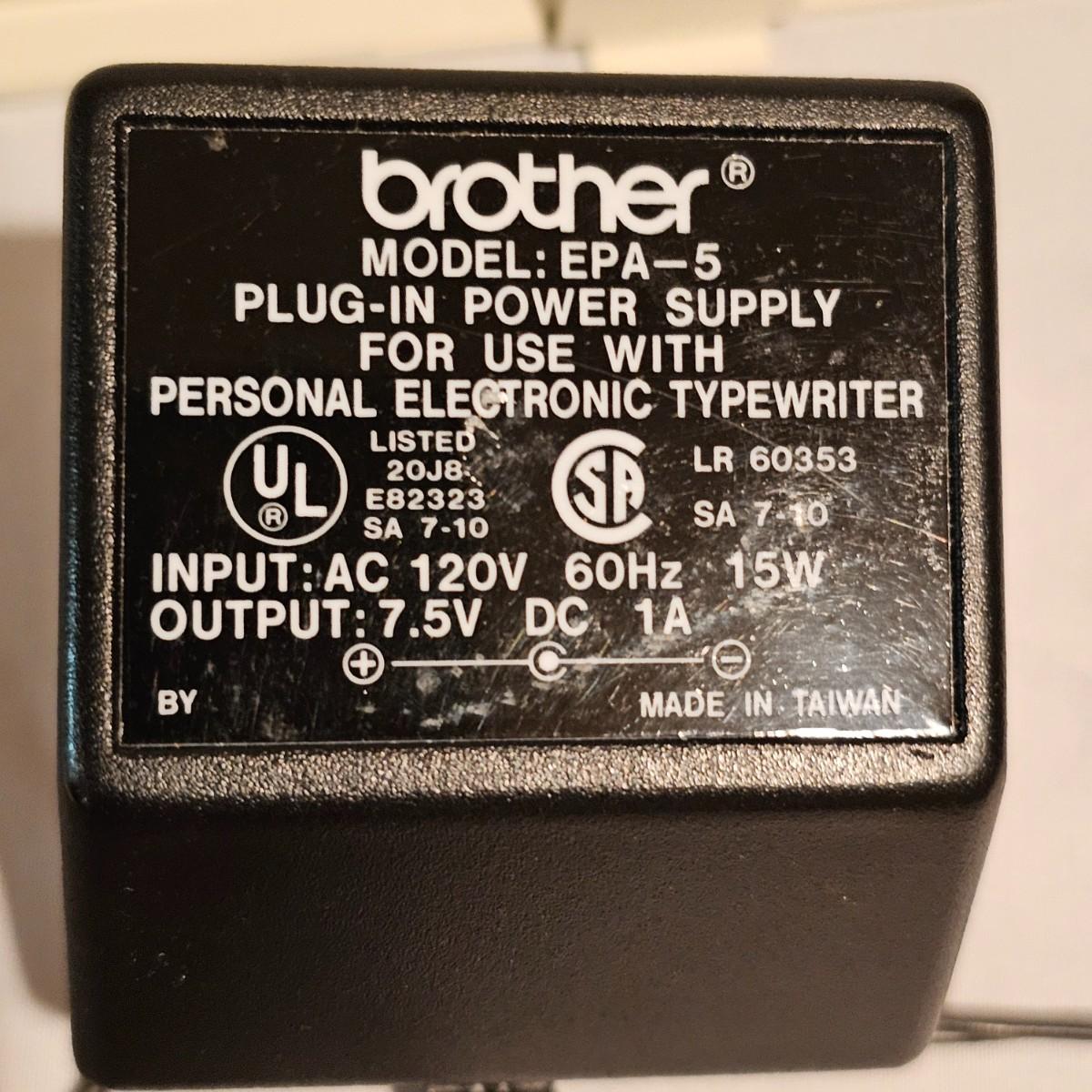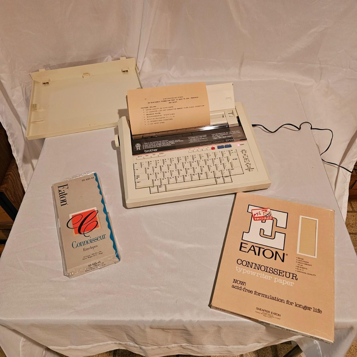 Compact portable Brother electronic Typewriter with power supply, cover and more. Runs on standard electric with power brick or batteries. Unit tested and powered on when plugged in with AC power. Includes a pack of typewriter paper and one pack of envelopes. See photos for details. Shipping available.