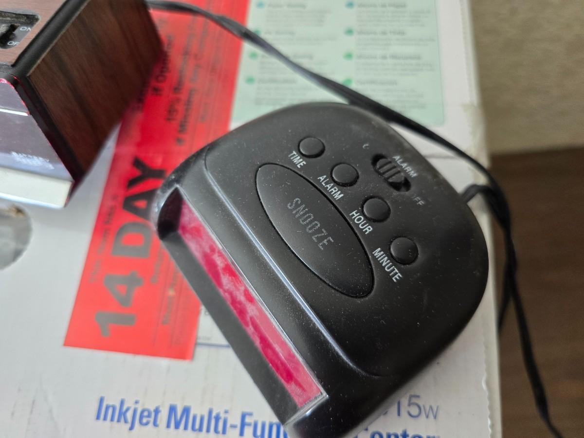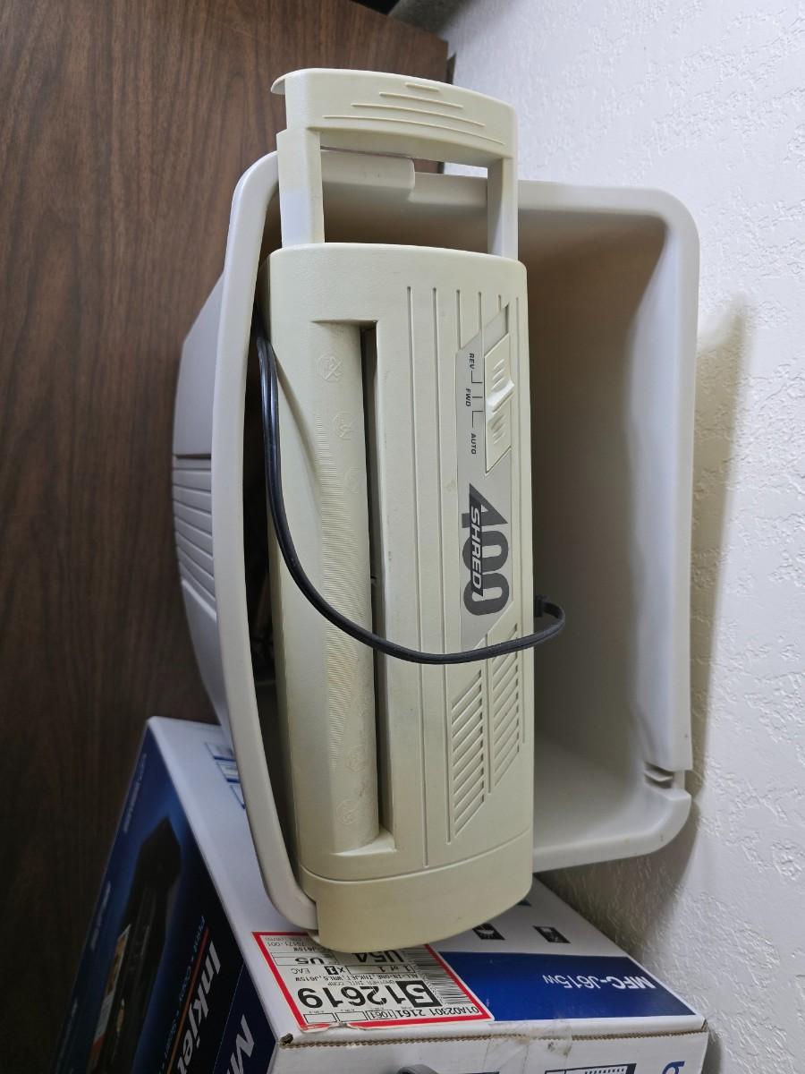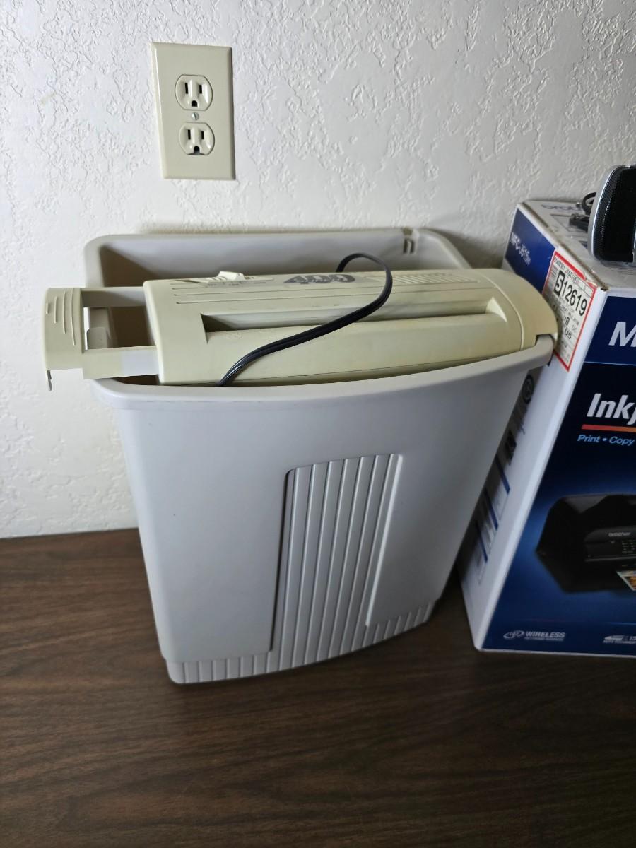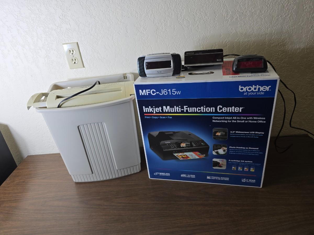 Brother Inkjet multi-function center / printer and a paper shredder with an assortment of alarm clocks