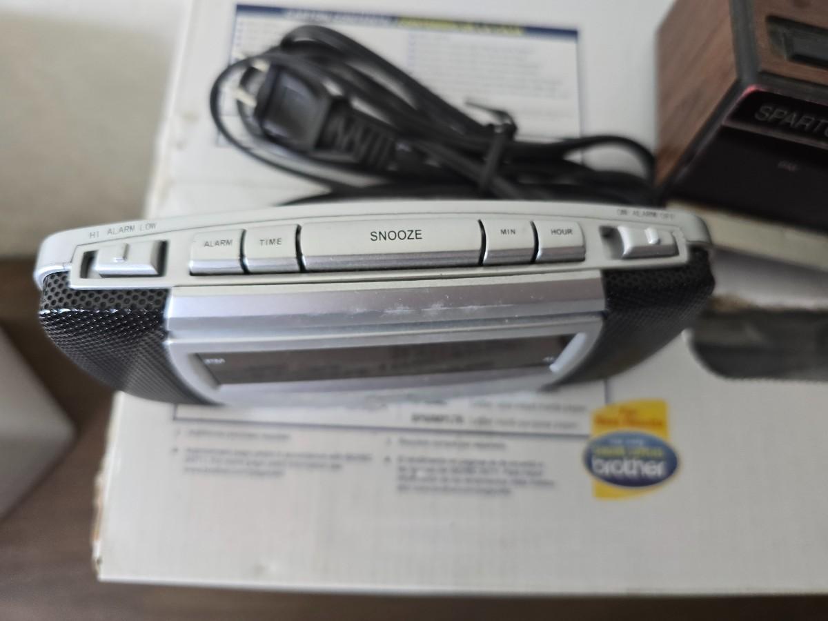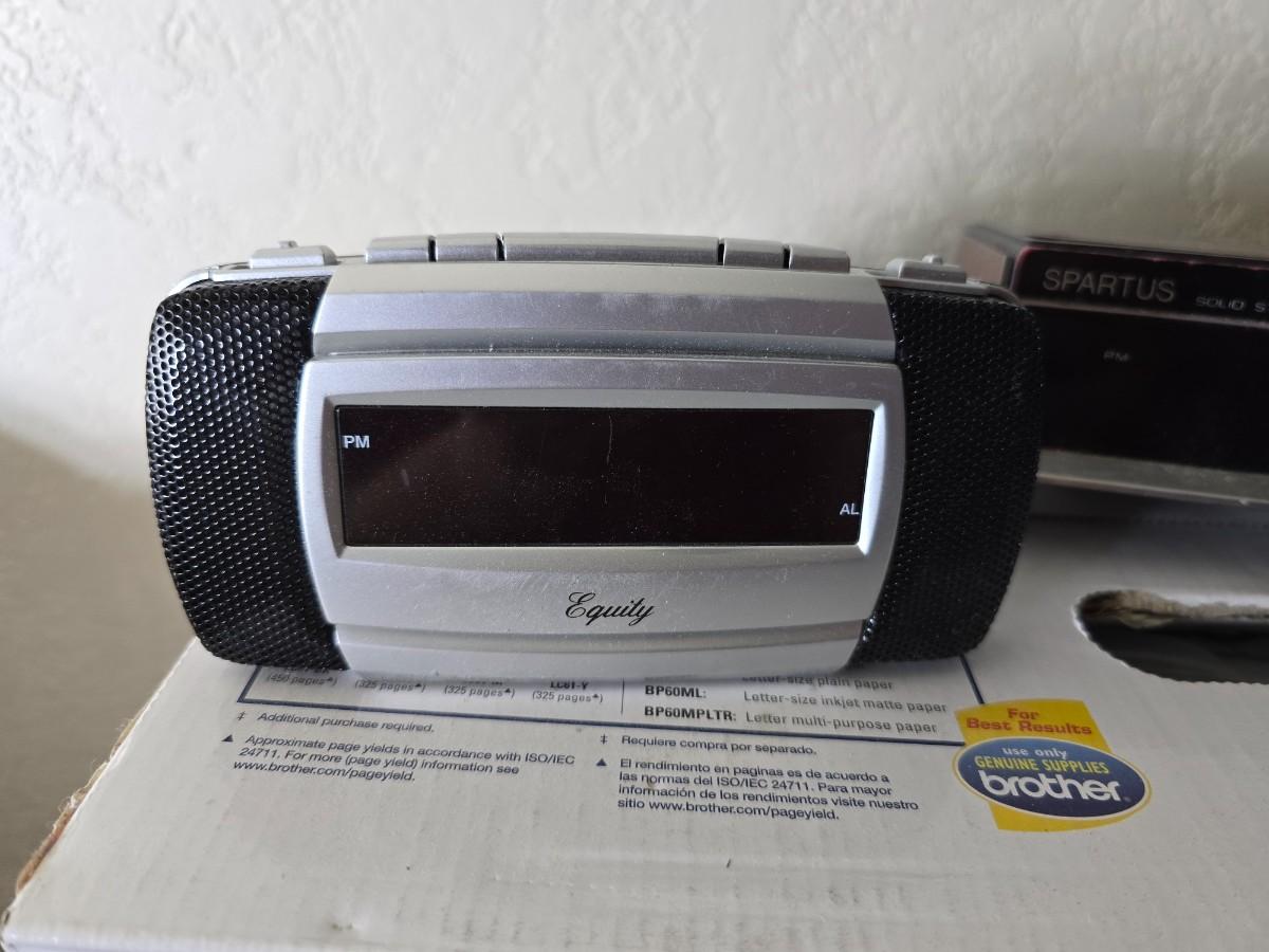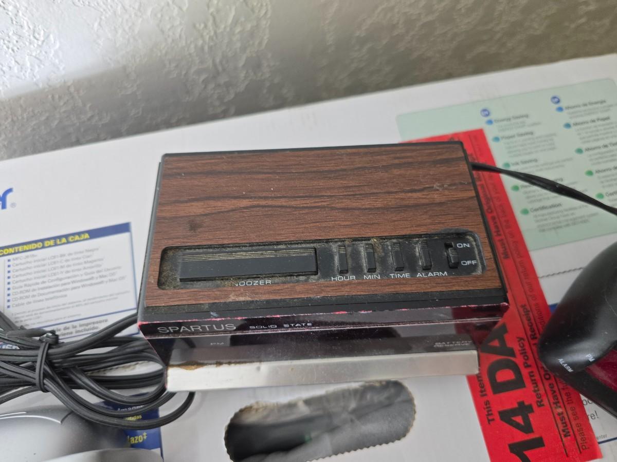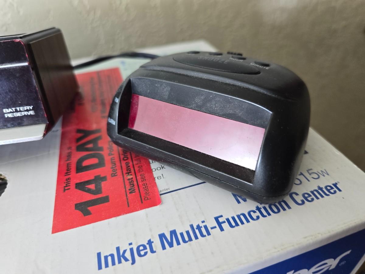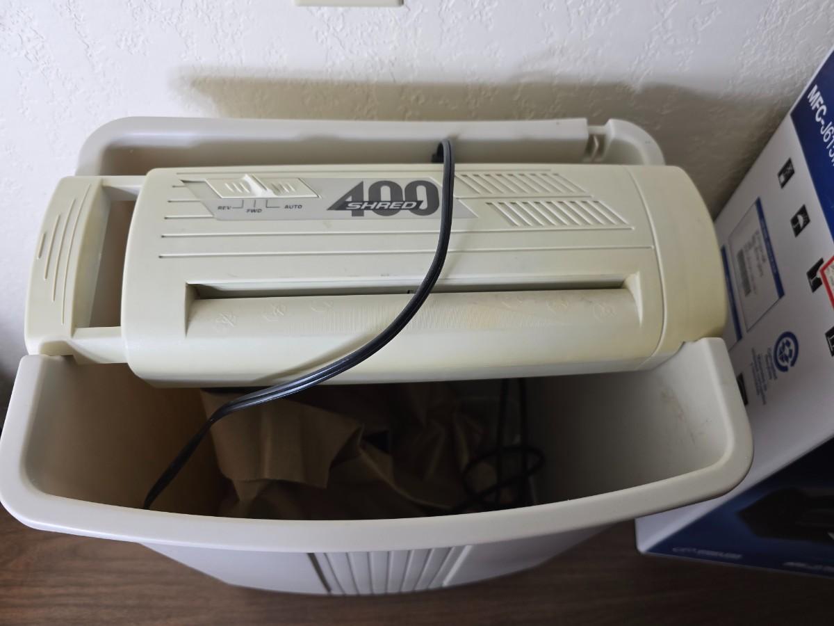 Brother Inkjet multi-function center / printer and a paper shredder with an assortment of alarm clocks