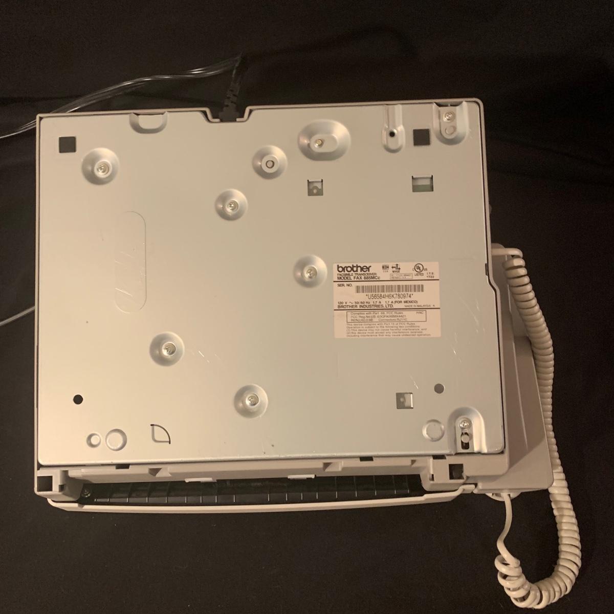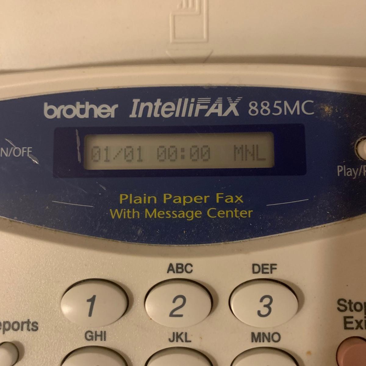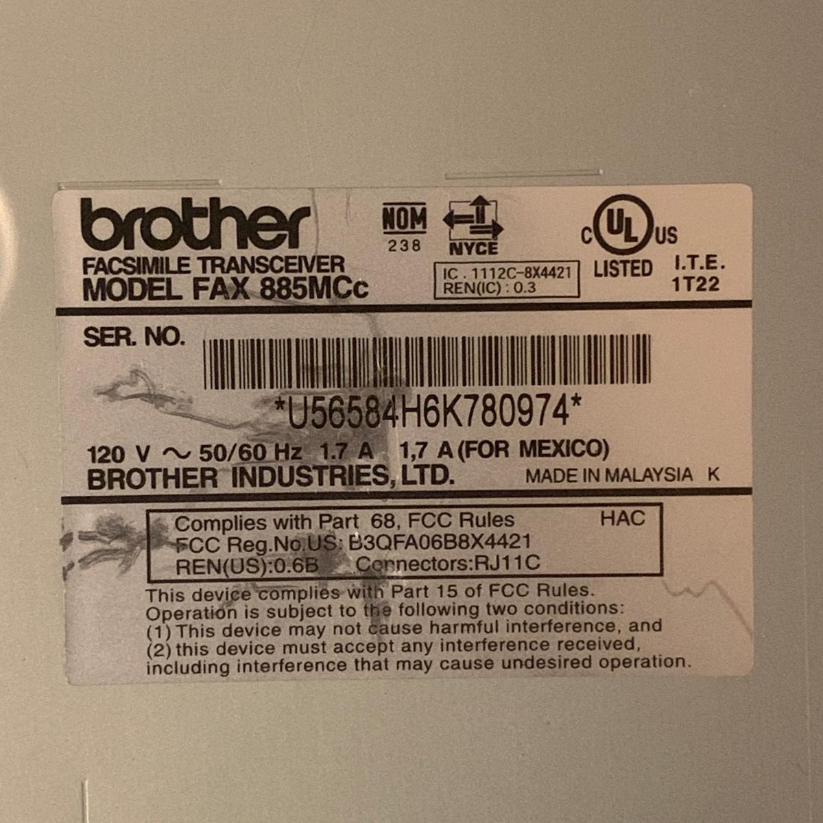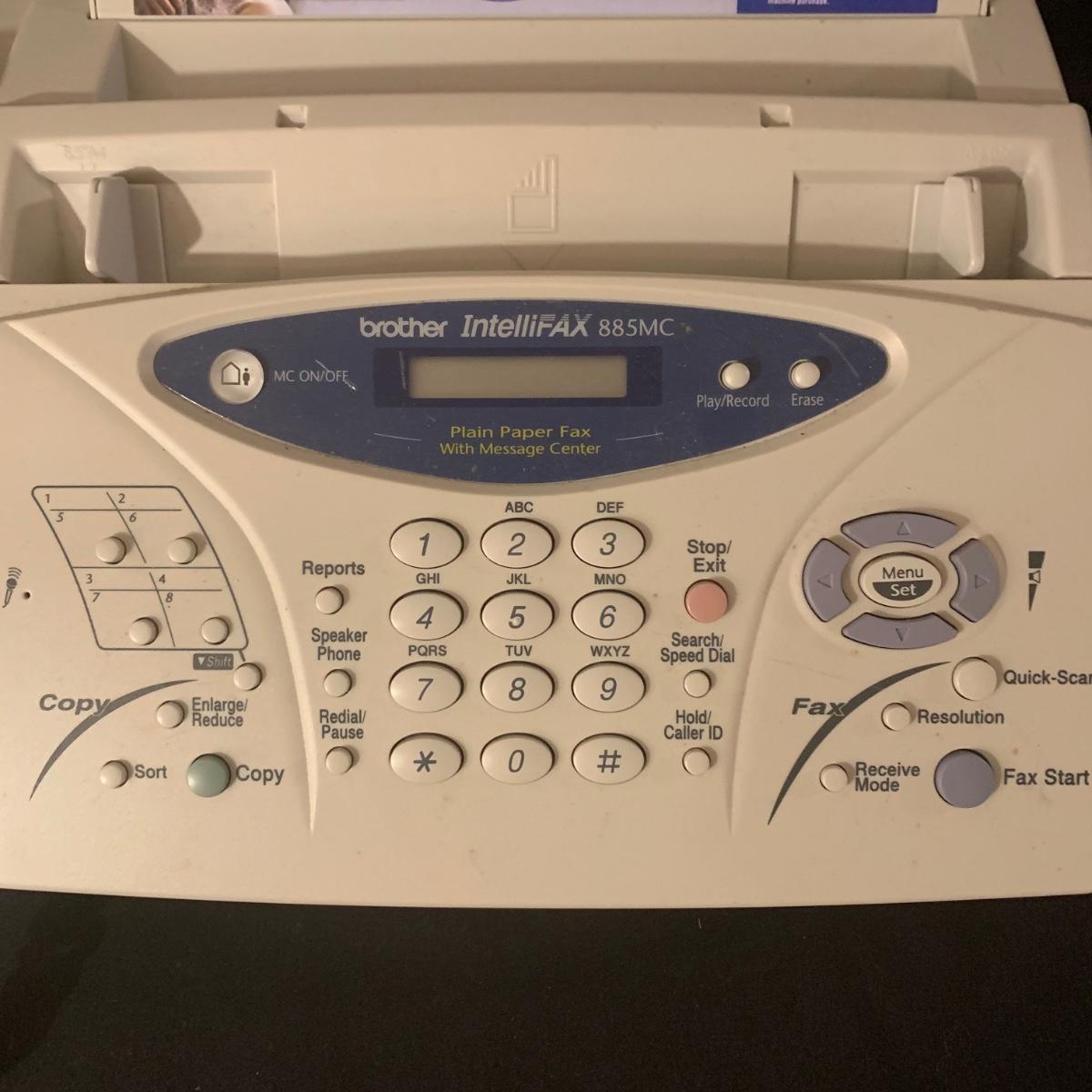 Brother IntelliFAX 885MC fax machine. Machine powers on and appears to be in good condition. Unable to test functionality. Item measures, 13.25”L x 10.5”W x 11”H and comes with both phone and power cords. Phone handle is sticky, but should be able to be cleaned. Model number: 885MCc