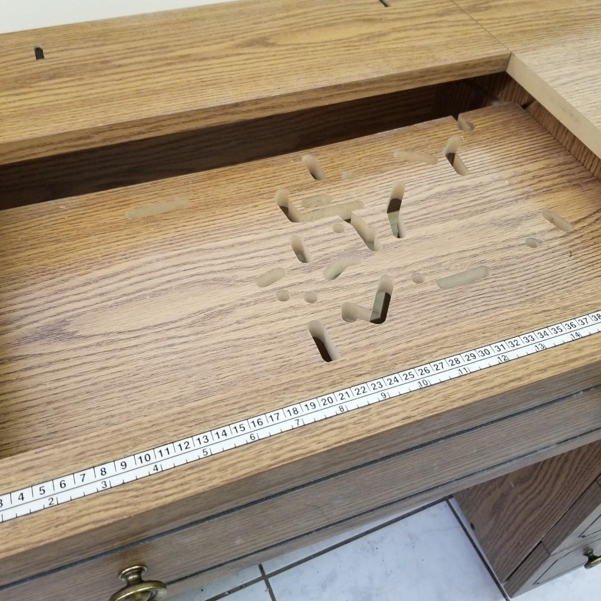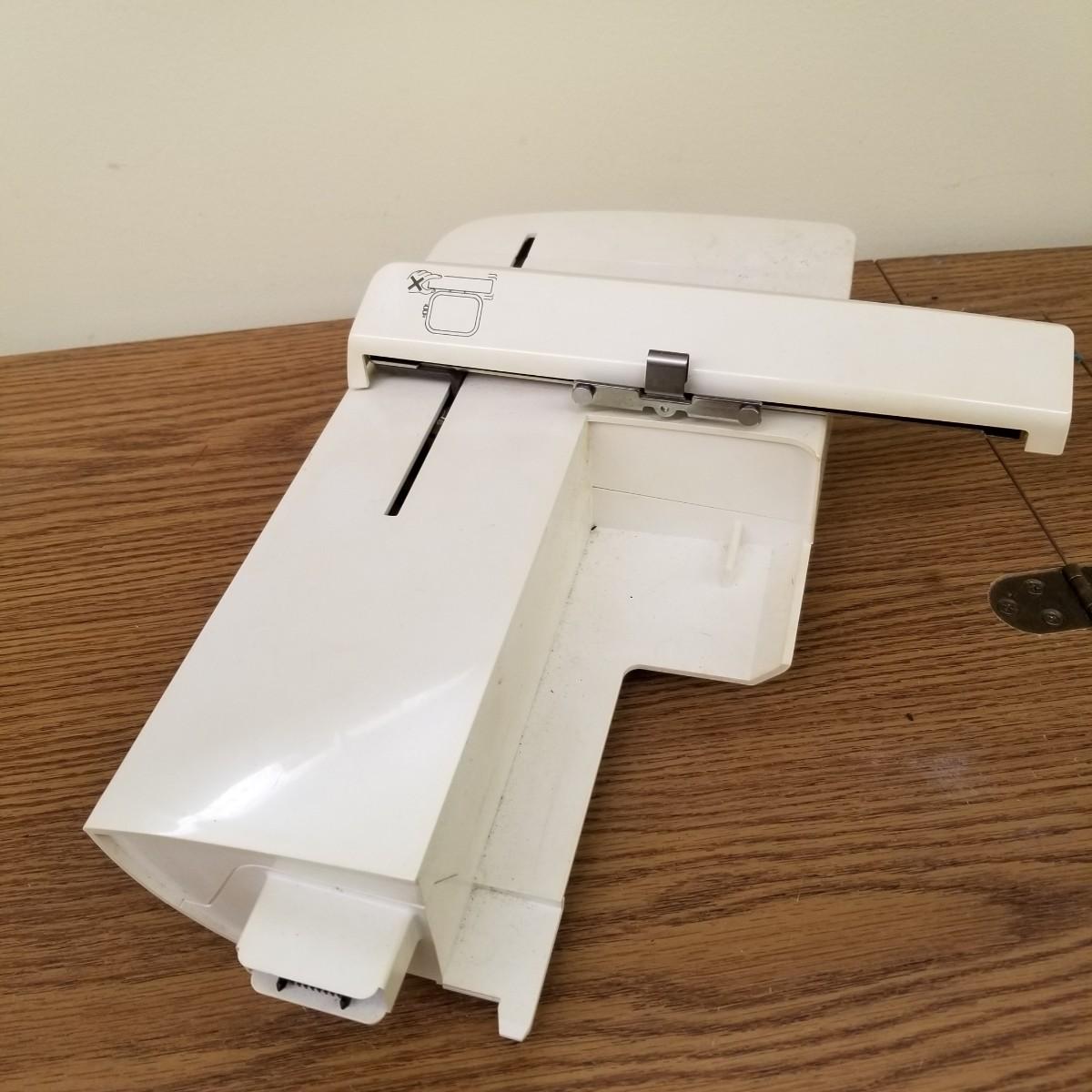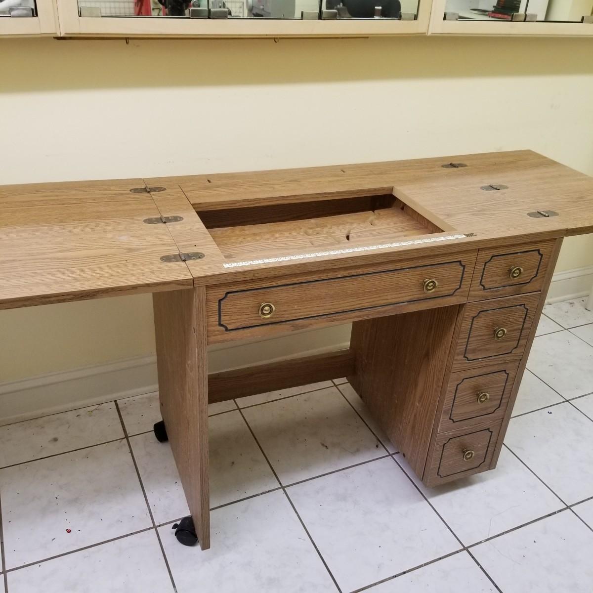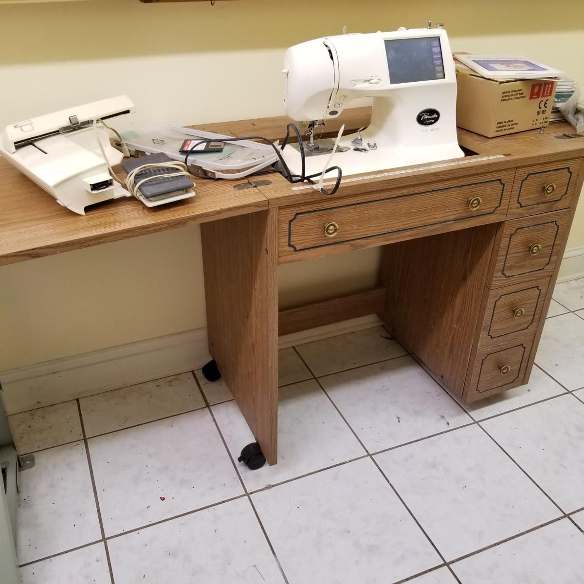 A complete sewing/embroidery set up, this Brother machune has lots of features. Touch screen interaction and more this comes with embroidery head, hoops and design software and drives to sync up with your laptop or pc. External drives power up but not tested with machine. Machine and embroidery arm tested working, both powered up. Has manuals, creative ideas and more plus a work station cabinet on casters. (Please note, sewing machine just sits in cabinet. Can be removed to collapse unit for storage.) Cabinet measures 63"x19.5"x29.5" open, 31.5"x19.5"x29.5" closed. See photos for details. Local pickup only.
