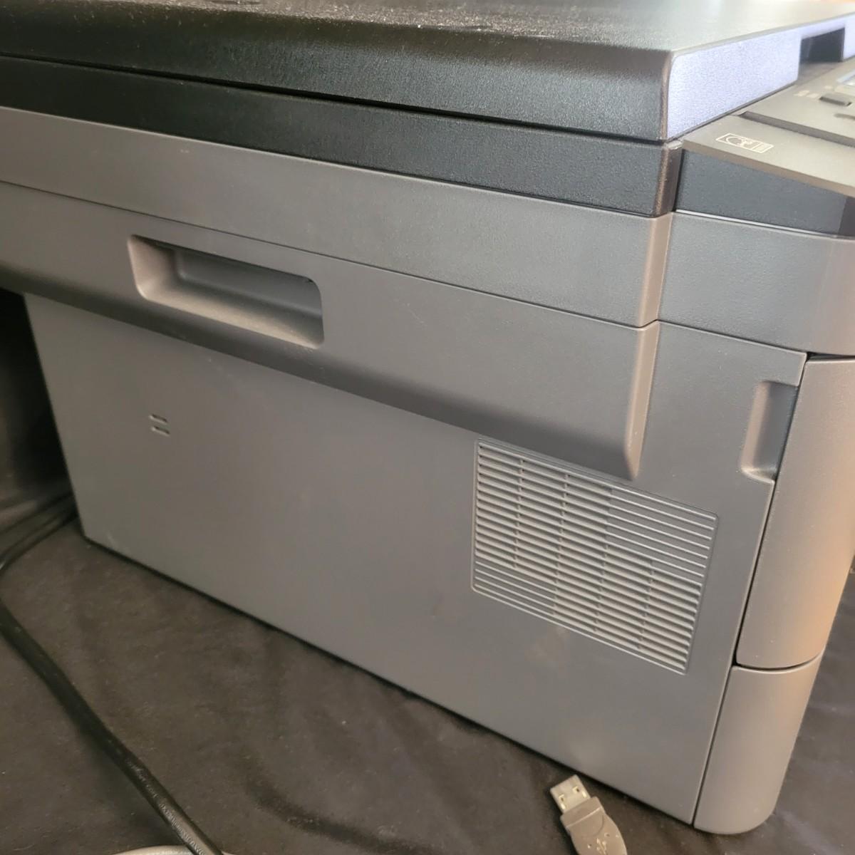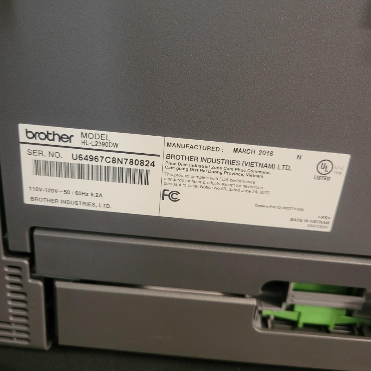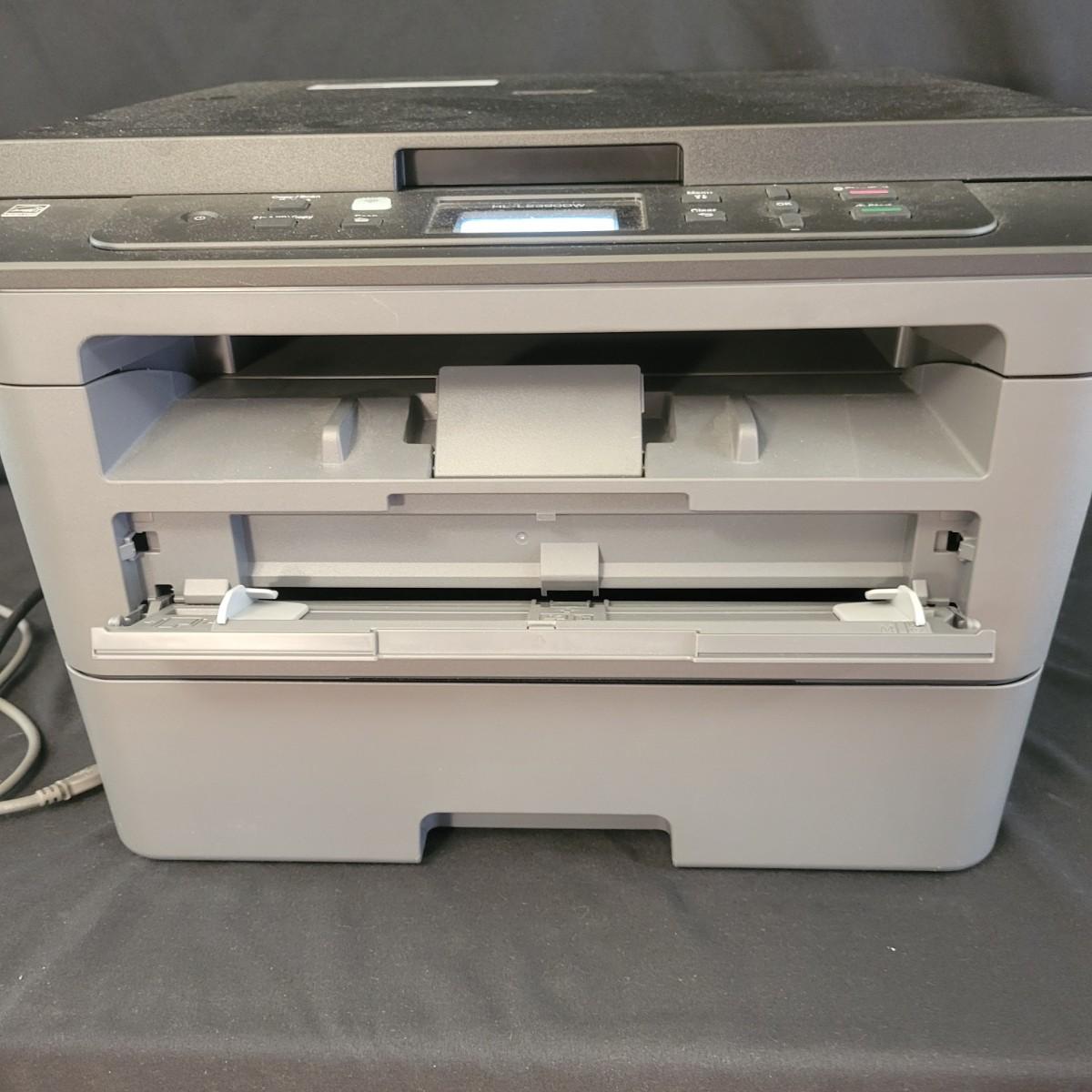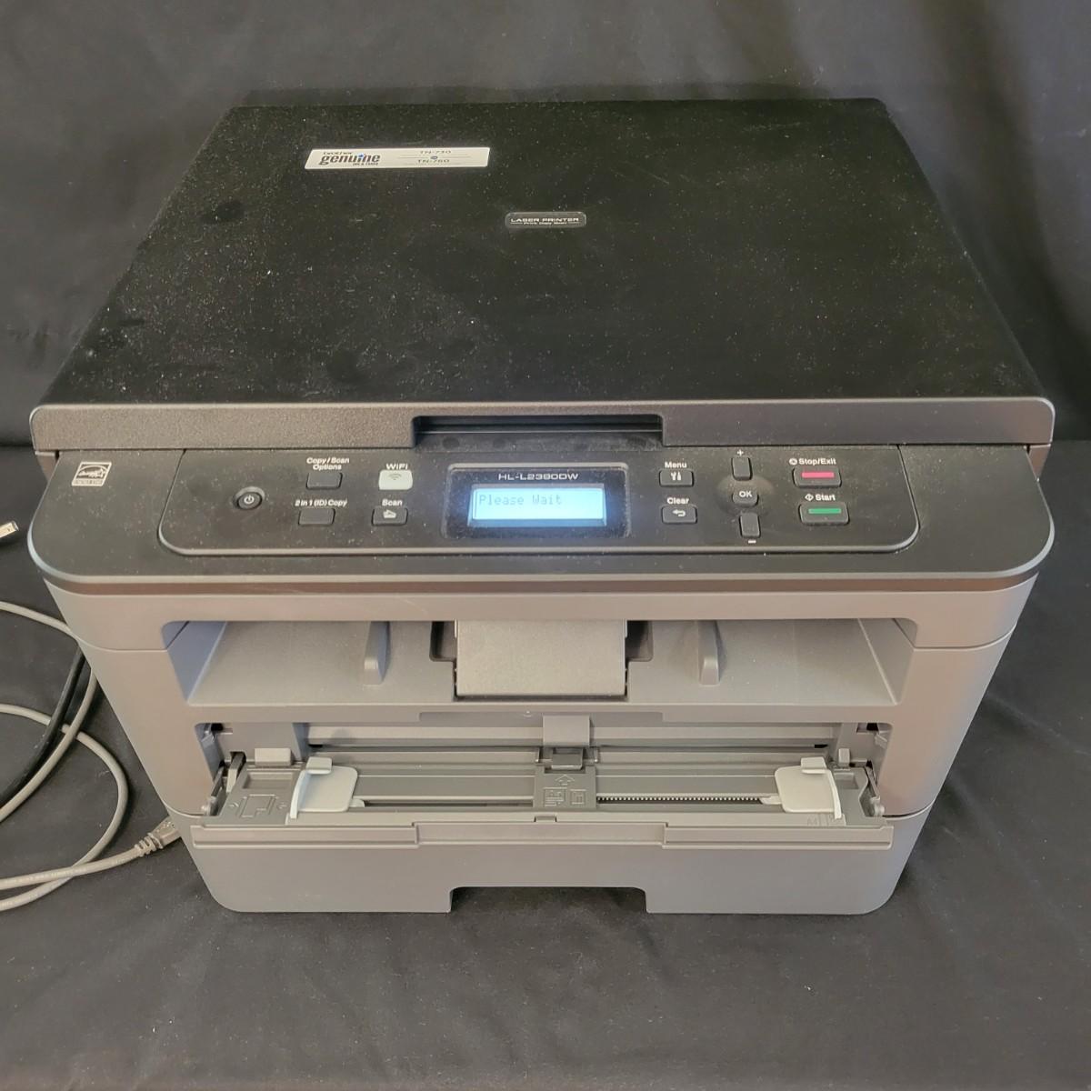 A Brother copier/scanner/printer in good condition with no notable damage and includes USB cable. This is a Brother HL-L2390DW model and measures approximately 16" x 15.5" x 10.5". Machine powered on when plugged in. Local pickup only