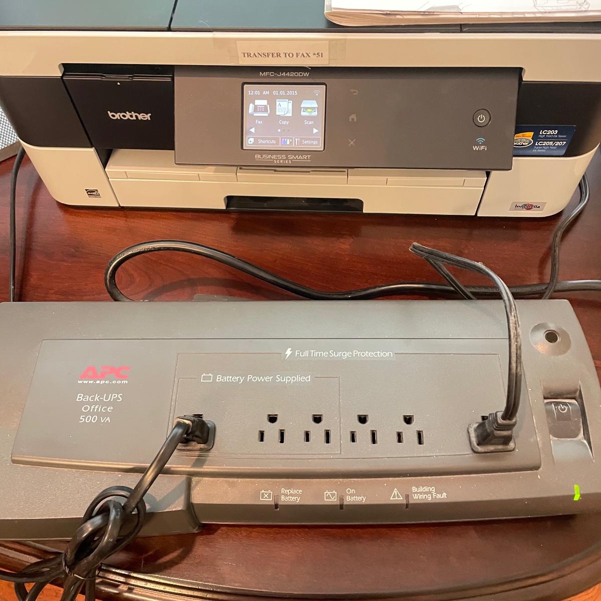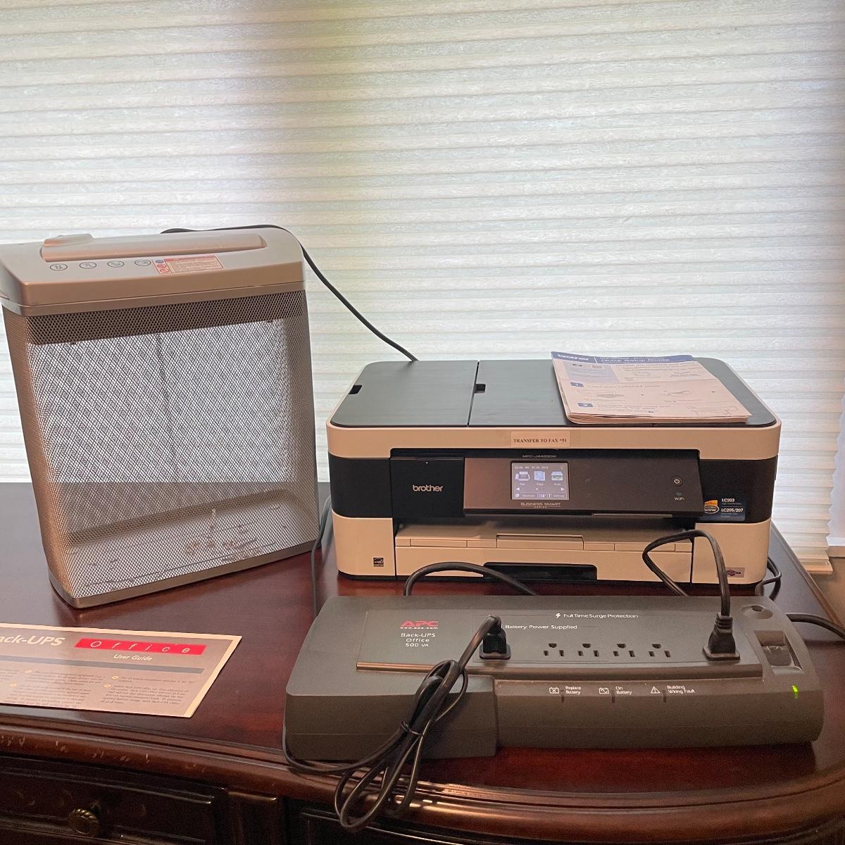 Brother printer-fax-scanner model MFC-J4420DW with Royal HT500x 5 Sheet Crosscut Shredder and APC surge protector/battery back up model BF500. All items turned on when tested. Local pick up only.