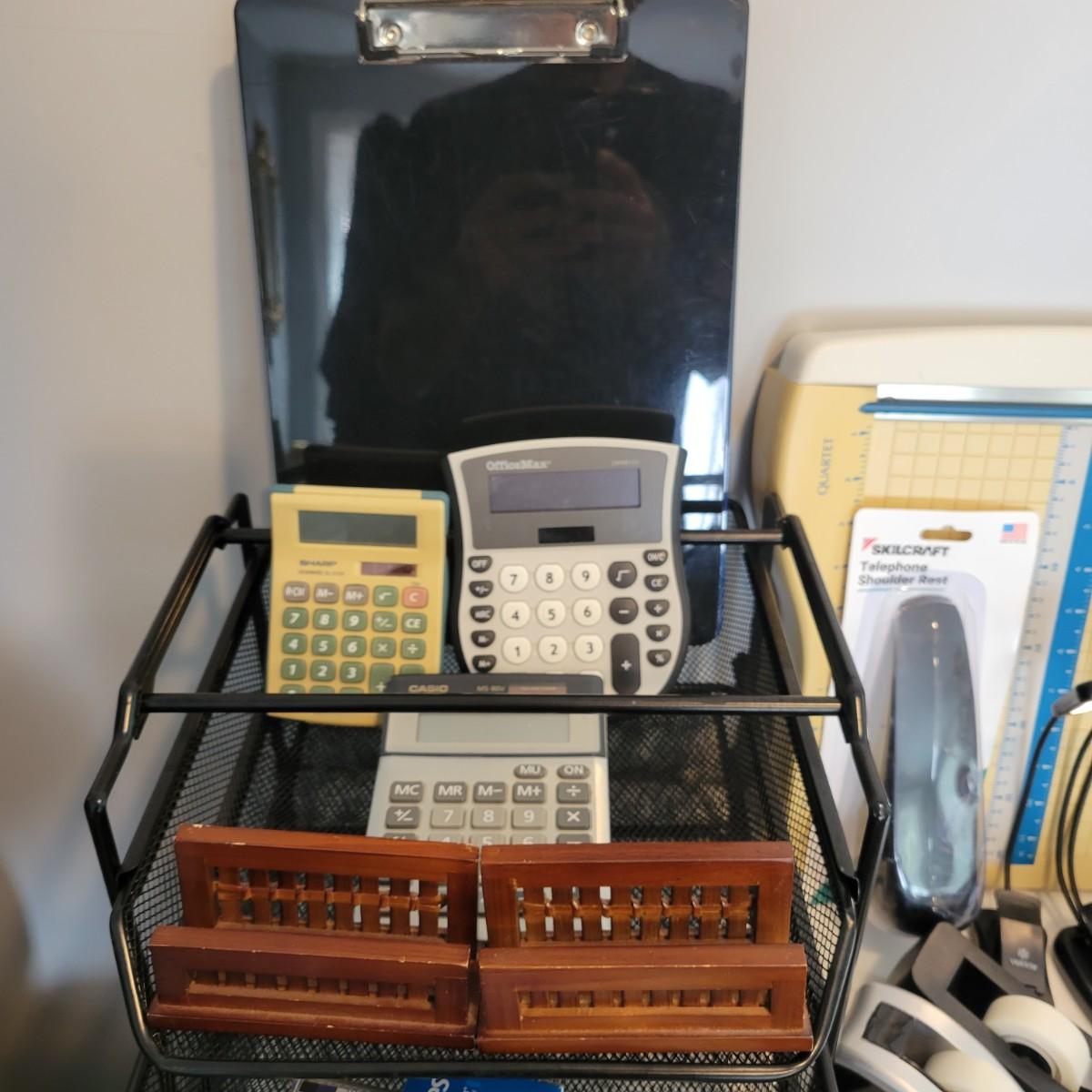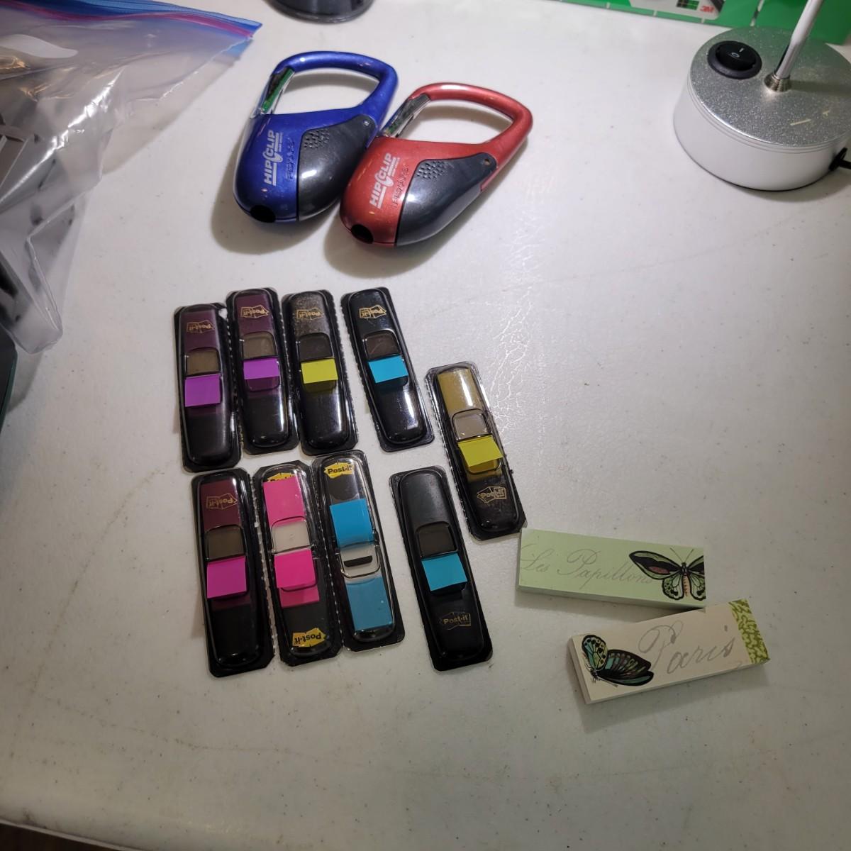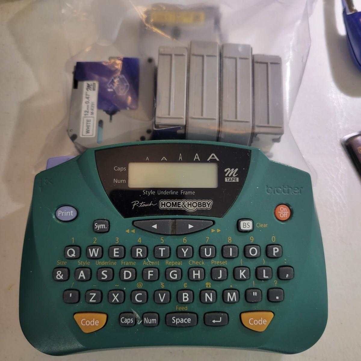 A Brother P-touch Home and Hobby label maker that powered on and includes seven additional label cartridges in different colors. Also included is an assortment of office supplies ranging from paper cutters to storage solutions and staples and rulers to envelopes. Local pickup only