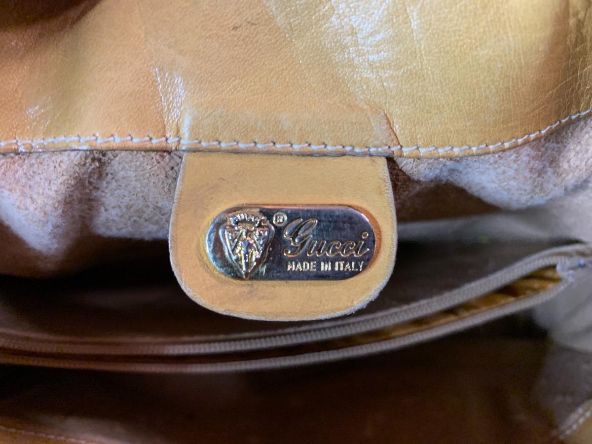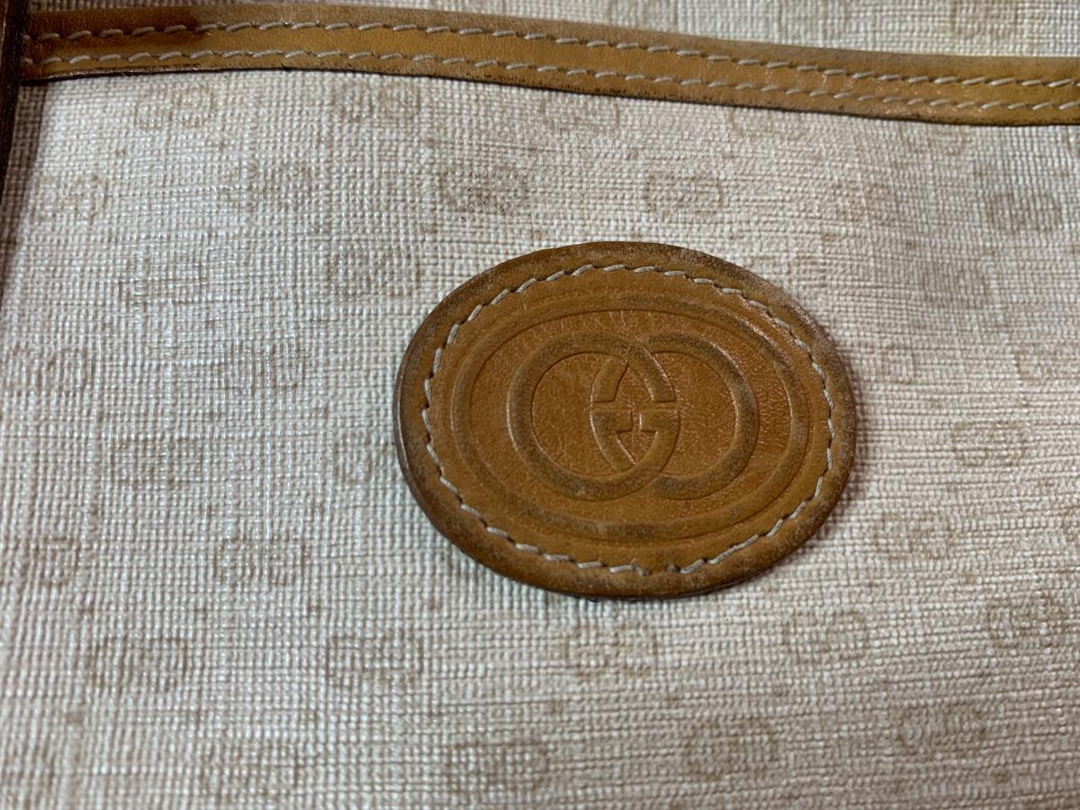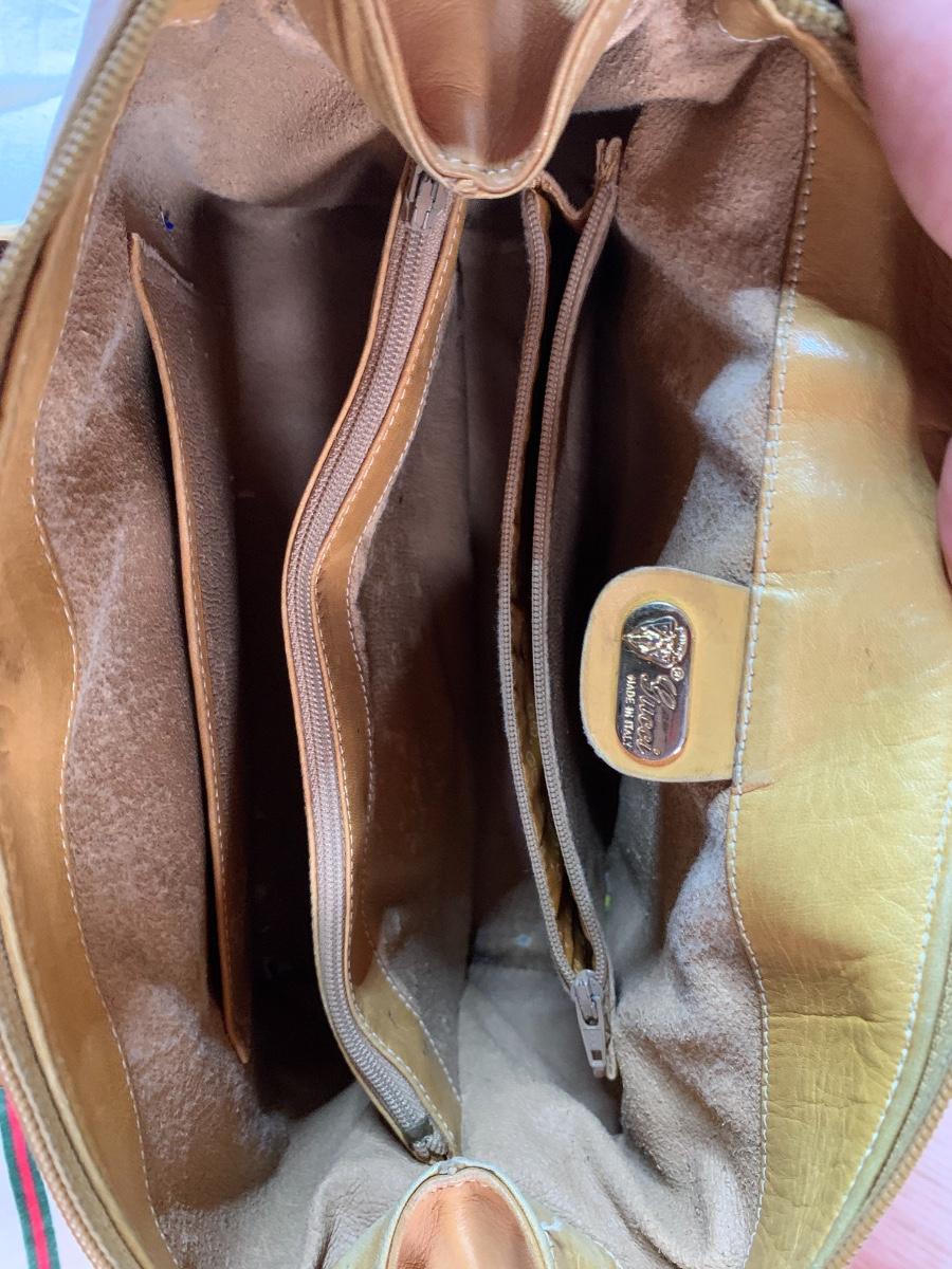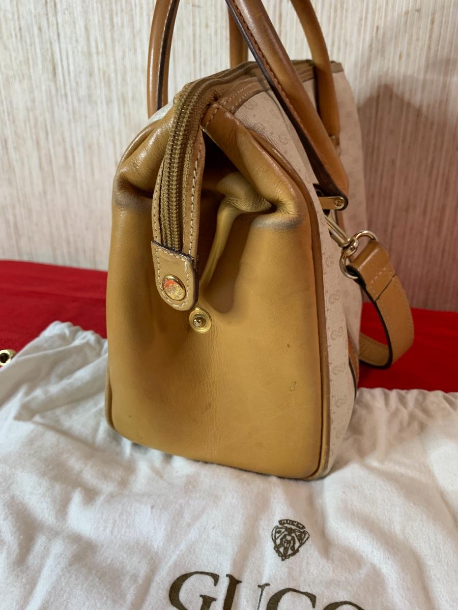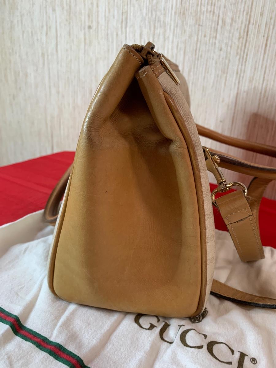 Brown and Beige Gucci purse with strap. Strap is in good condition. Overall purse is in good condition. Leather looks great, minimal patina. Stitching intact. Very attractive bag.