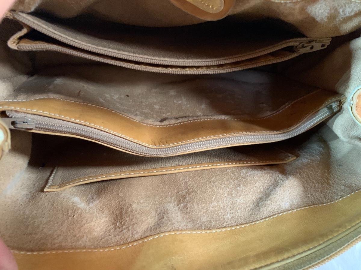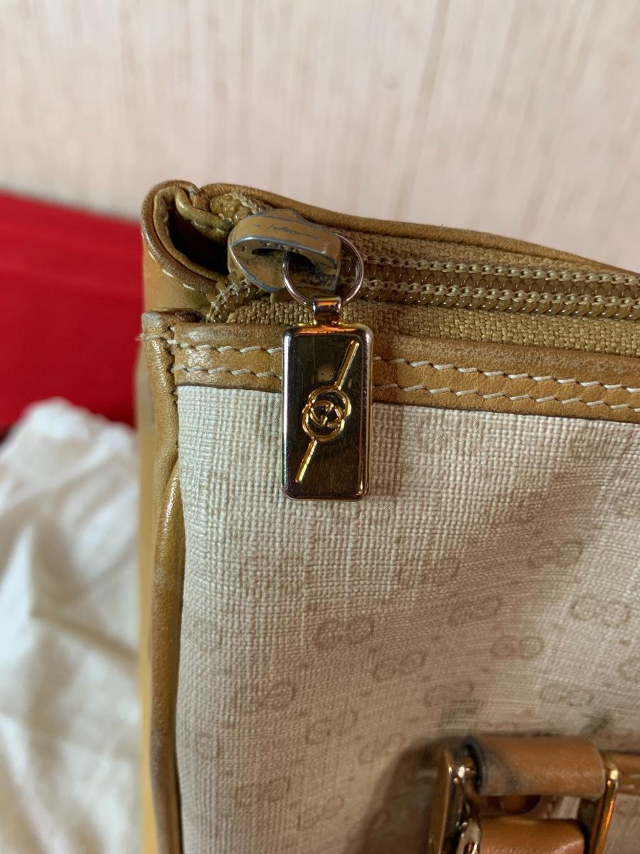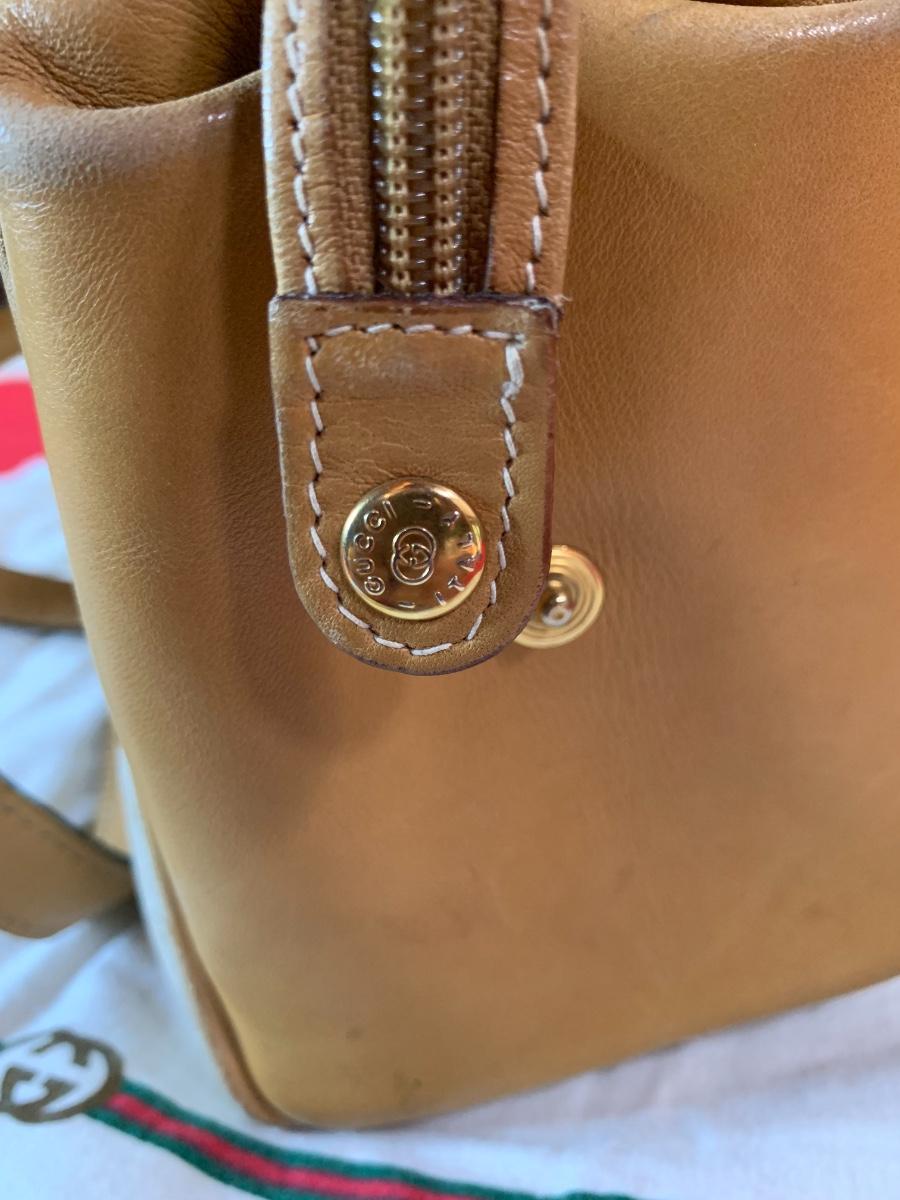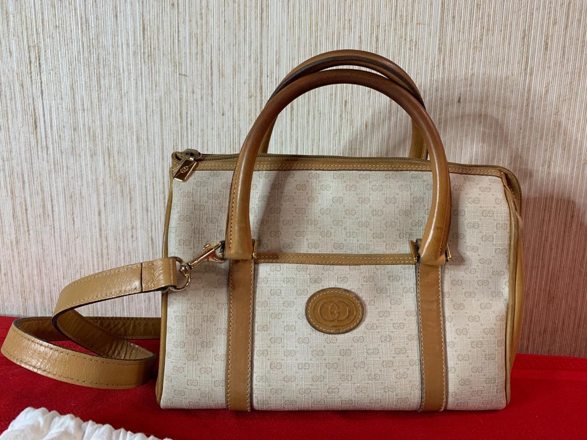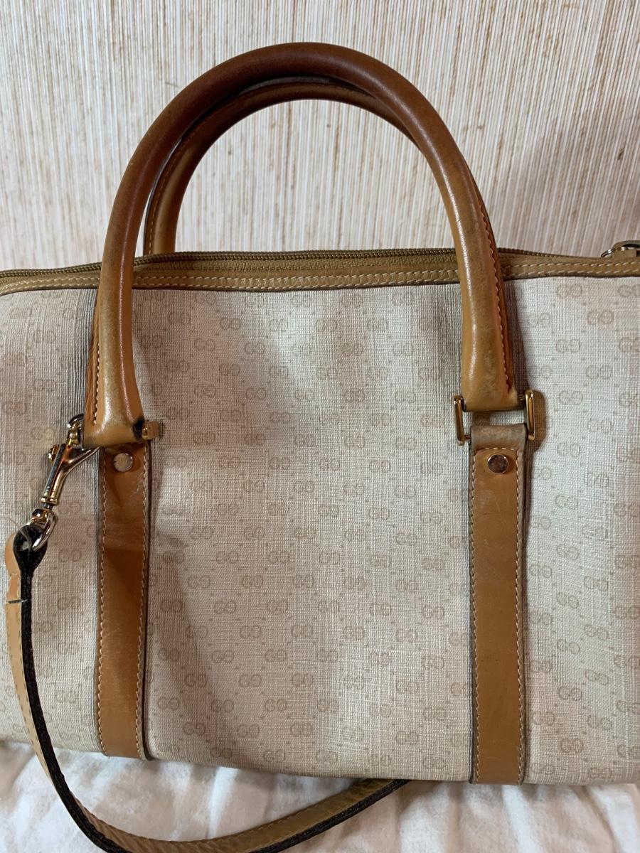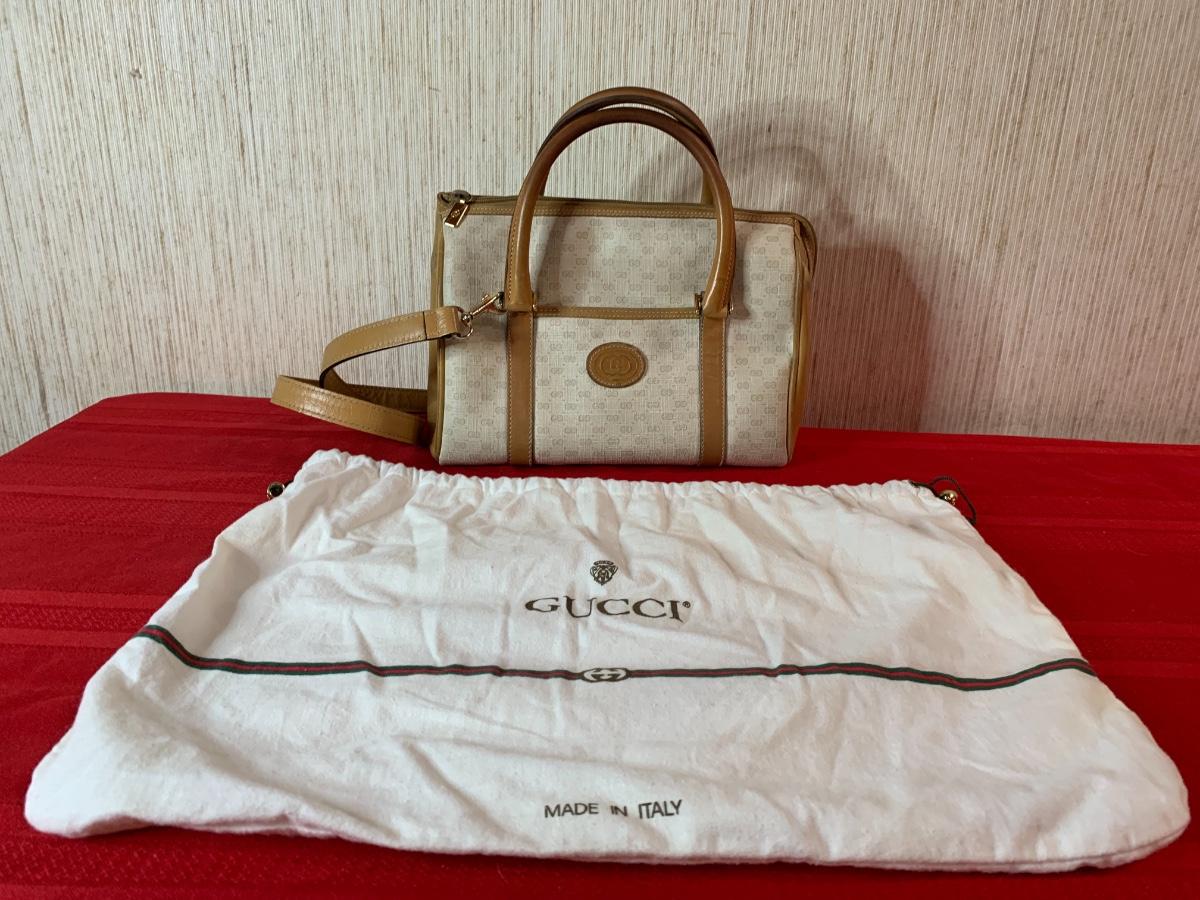 Brown and Beige Gucci purse with strap. Strap is in good condition. Overall purse is in good condition. Leather looks great, minimal patina. Stitching intact. Very attractive bag.