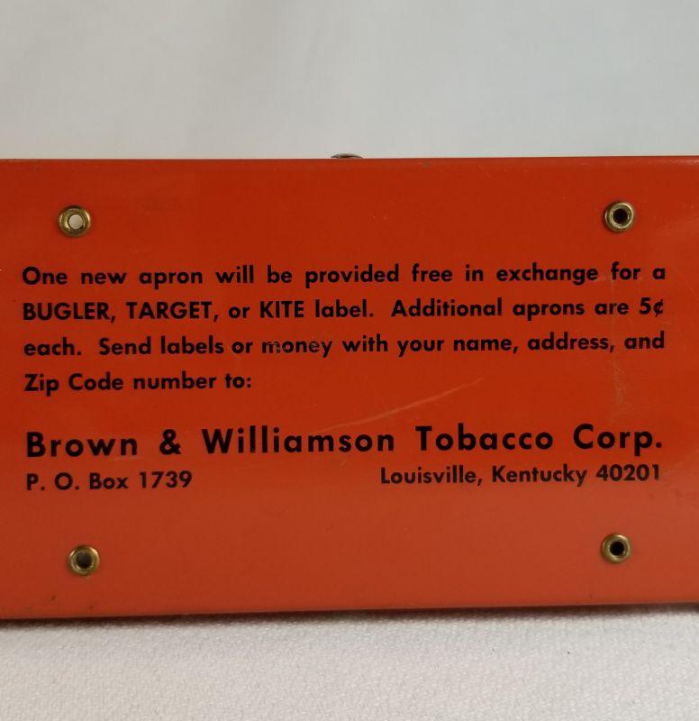 Bottom is marked: One new apron will be provided free in exchange for BUGLER, TARGET or KITE label. Additional aprons are 5 cents each. Send labels or money with your name, address and Zip Code to: Brown & Williamson Tobacco Corporation. P O Box 1739 Louisville, Kentucky 40201