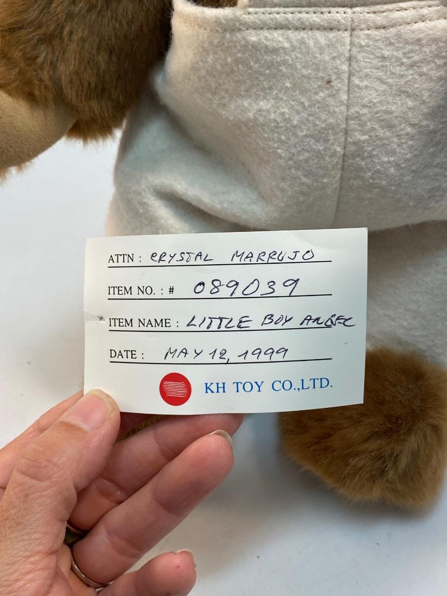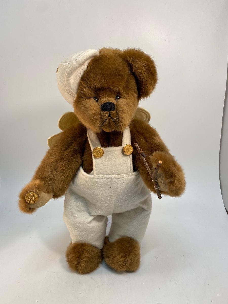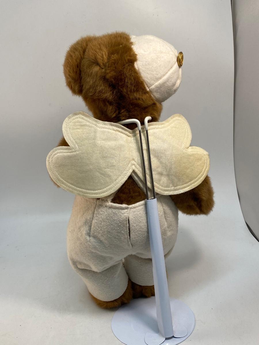 Brown Angel Boy Teddy Bear with Stand. In good previously displayed condition. Rubber band on slingshot has broken off probably from age and slight discolor to wings. About 15” size.