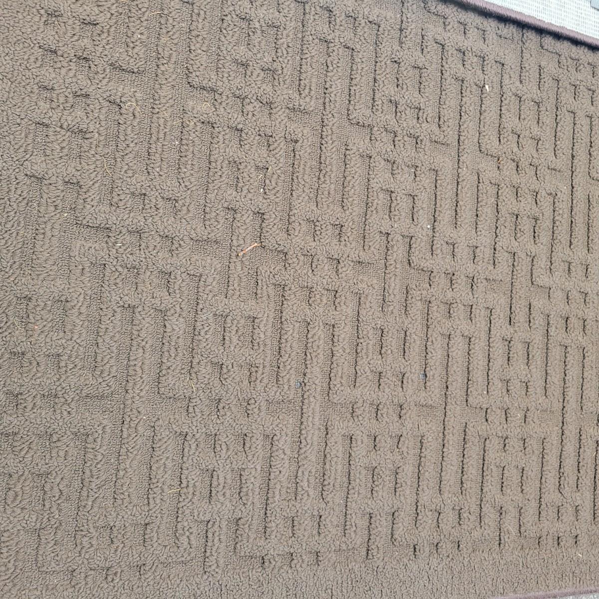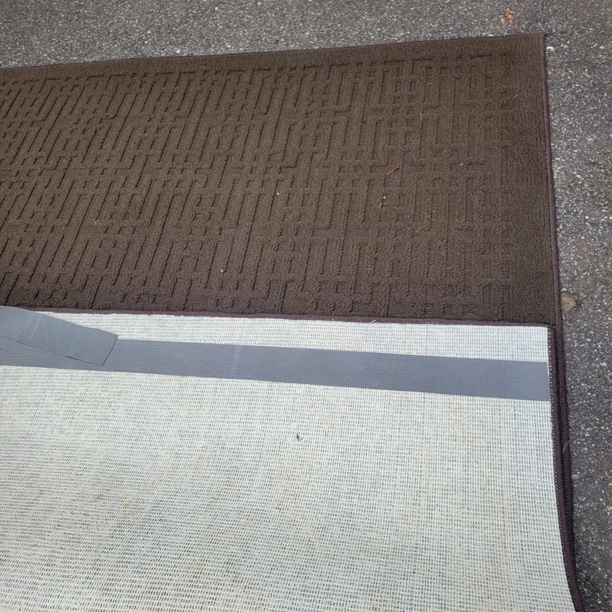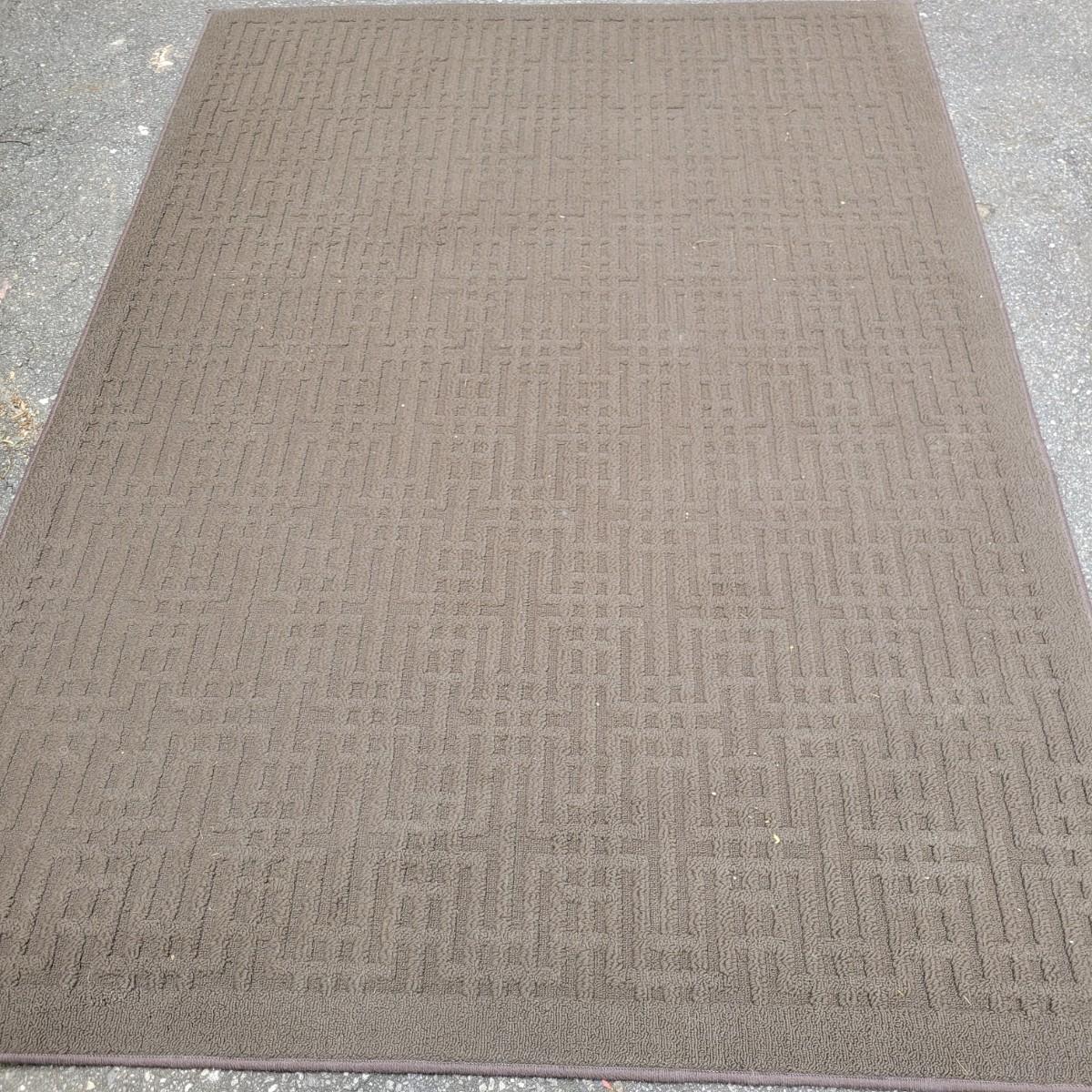 A brown area rug that has a 3D geometric pattern on it. It measures approximately 7' x 5' and has no notable damage or stains. The color of the rug is a darker brown than appears in the photos. Local pickup only