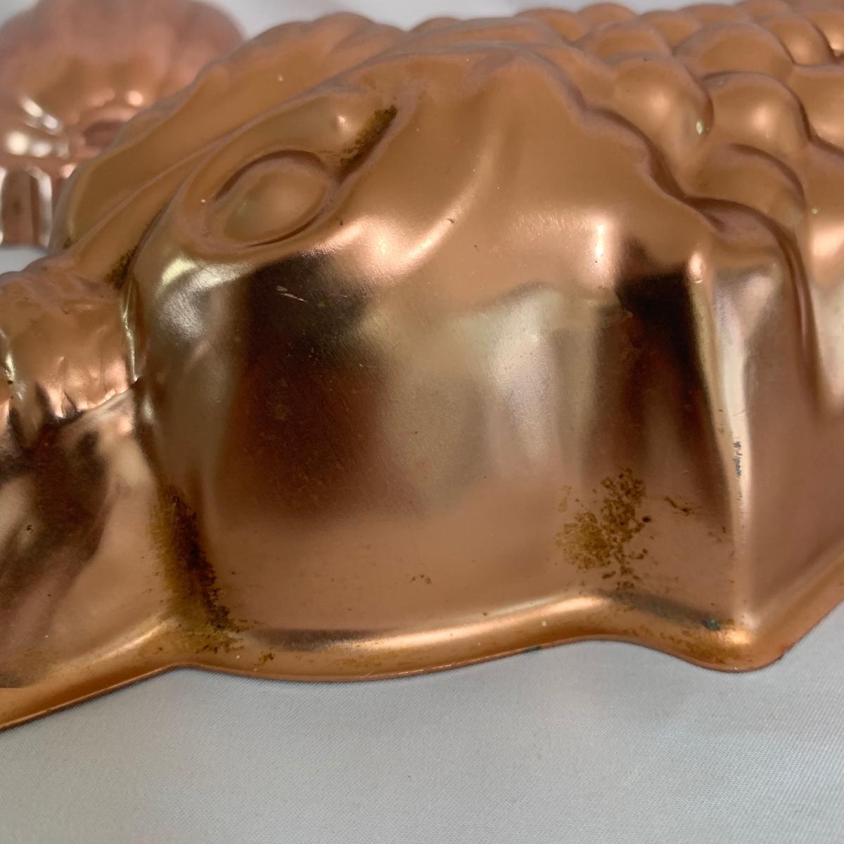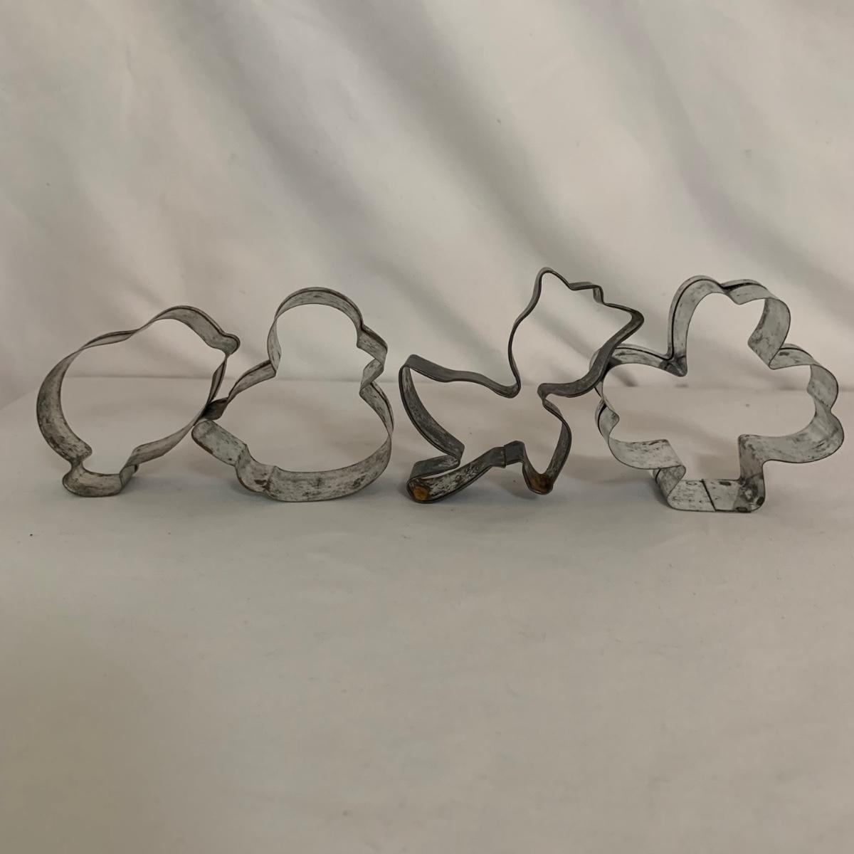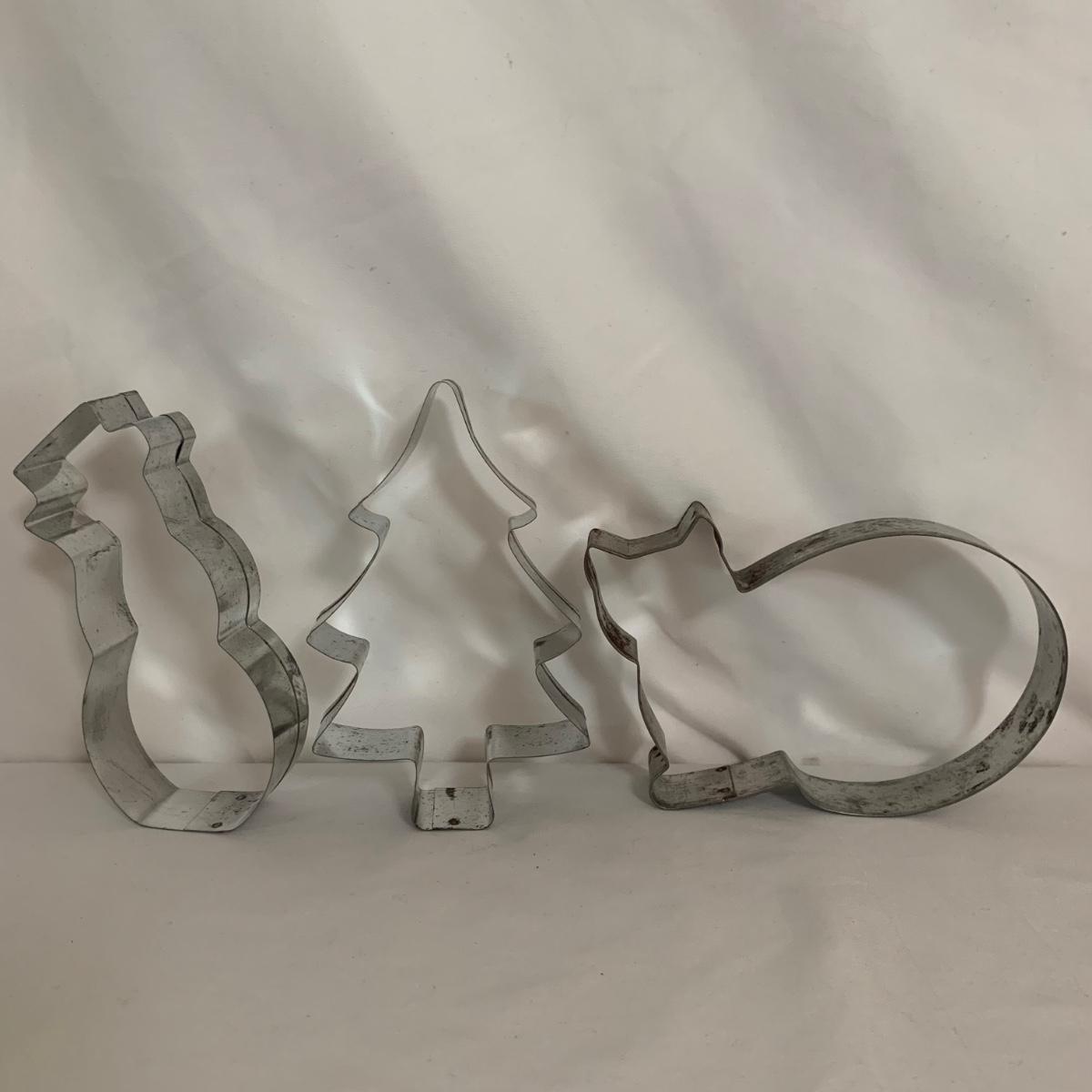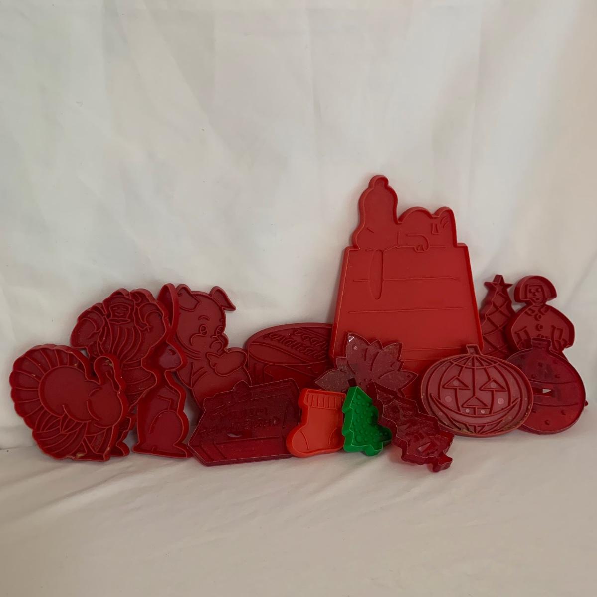 Three Christmas-themed Brown Bag Cookie Art molds in good condition, with signs of gentle use. Four copper-toned jello/cake molds, in good condition, though they have some signs of use, see photos. They have hooks to hang on the wall as decor. The corn shaped mold measures approximately 10” x 5.5” x 2.75”. 20+ plastic cookie cutters with various holiday themes, plus Snoopy and Porky Pig! There are 10 metal cookie cutters with handles, with Christmas and animal themes - the animals are very small at about 1.5”. And there are 11 open metal cookie cutters that are a bit tarnished.