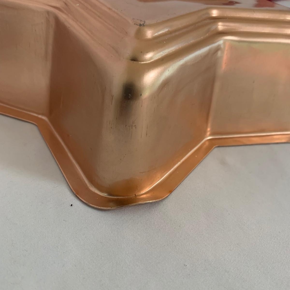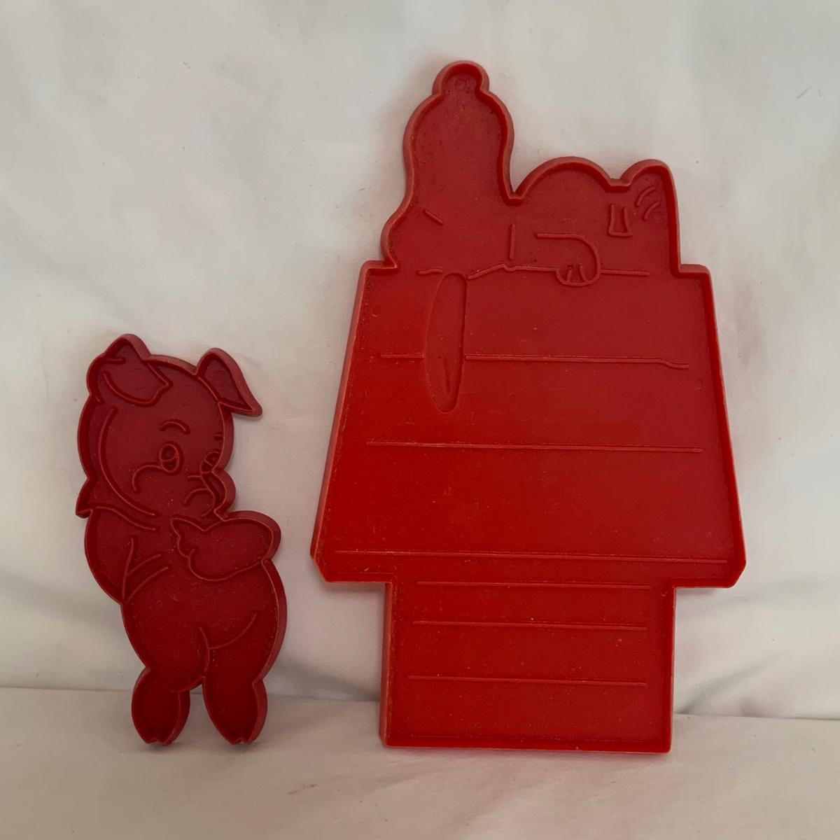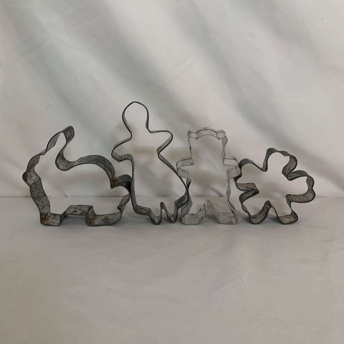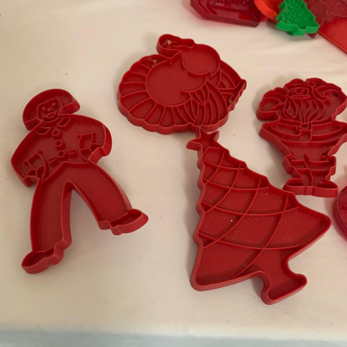 Three Christmas-themed Brown Bag Cookie Art molds in good condition, with signs of gentle use. Four copper-toned jello/cake molds, in good condition, though they have some signs of use, see photos. They have hooks to hang on the wall as decor. The corn shaped mold measures approximately 10” x 5.5” x 2.75”. 20+ plastic cookie cutters with various holiday themes, plus Snoopy and Porky Pig! There are 10 metal cookie cutters with handles, with Christmas and animal themes - the animals are very small at about 1.5”. And there are 11 open metal cookie cutters that are a bit tarnished.