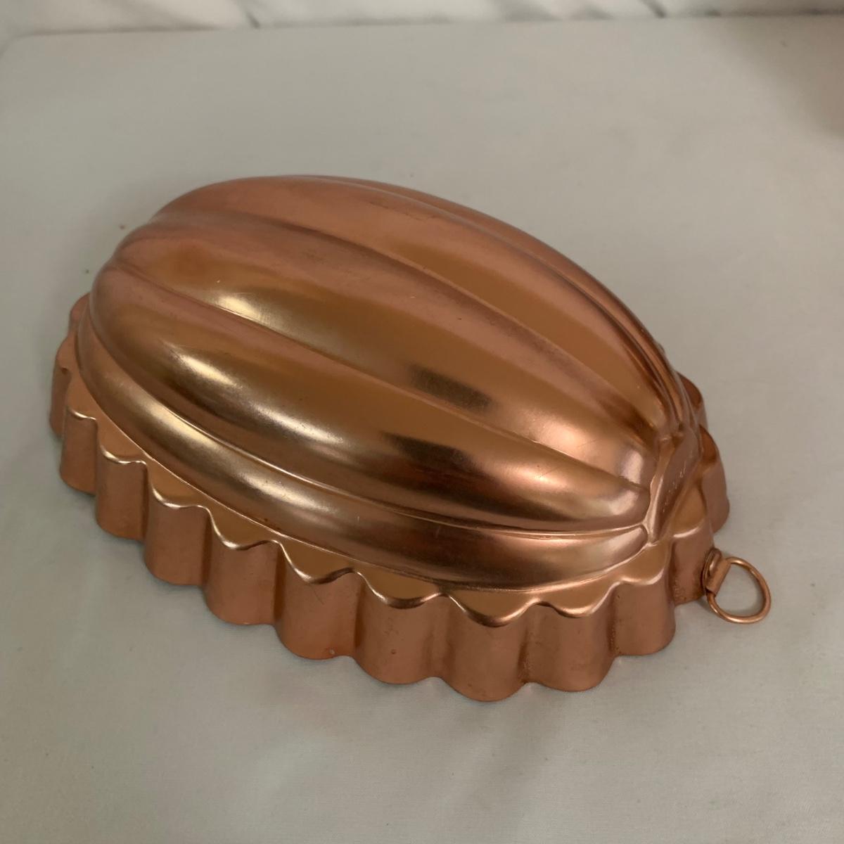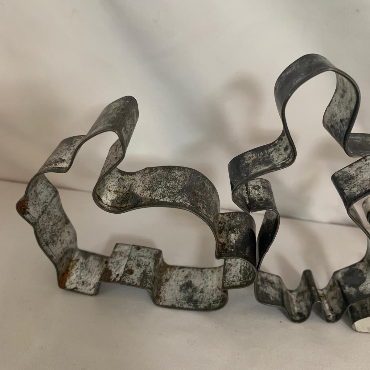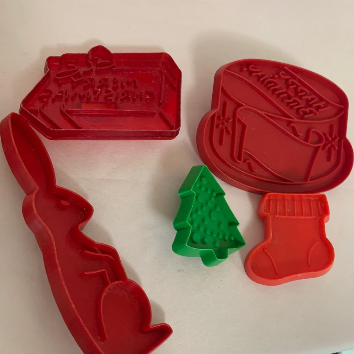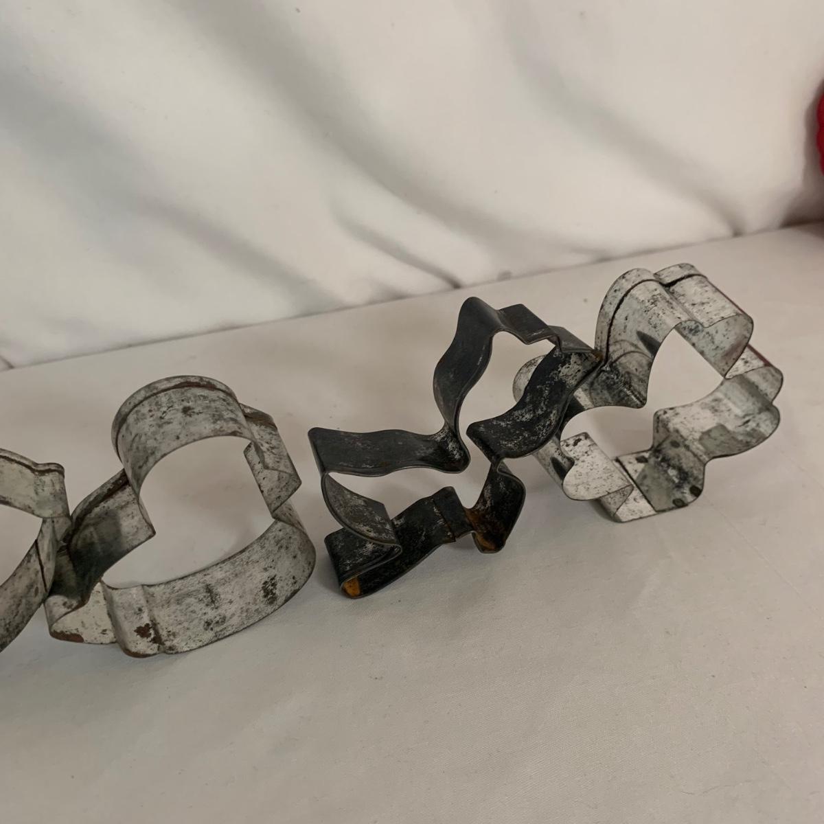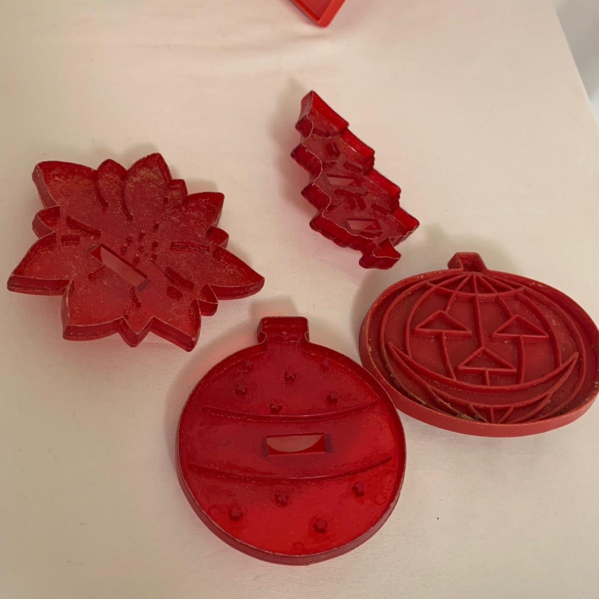 Three Christmas-themed Brown Bag Cookie Art molds in good condition, with signs of gentle use. Four copper-toned jello/cake molds, in good condition, though they have some signs of use, see photos. They have hooks to hang on the wall as decor. The corn shaped mold measures approximately 10” x 5.5” x 2.75”. 20+ plastic cookie cutters with various holiday themes, plus Snoopy and Porky Pig! There are 10 metal cookie cutters with handles, with Christmas and animal themes - the animals are very small at about 1.5”. And there are 11 open metal cookie cutters that are a bit tarnished.