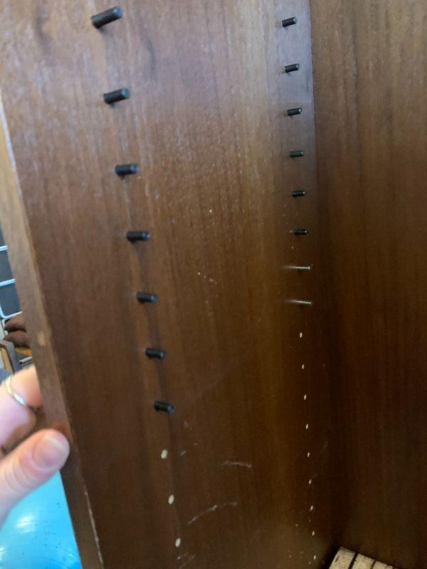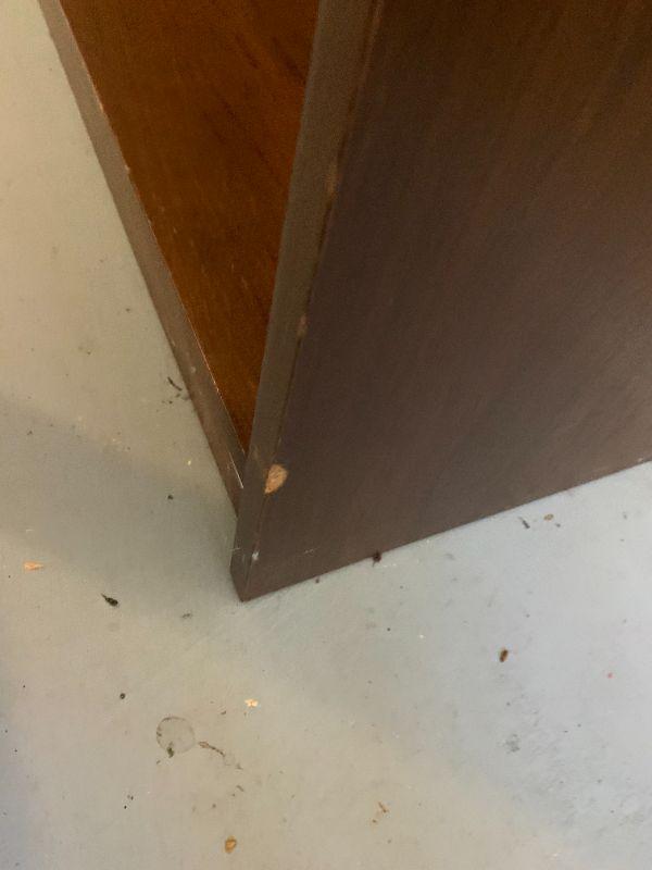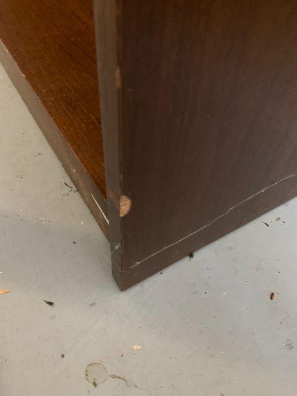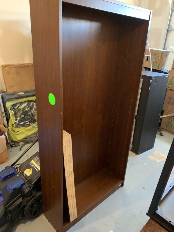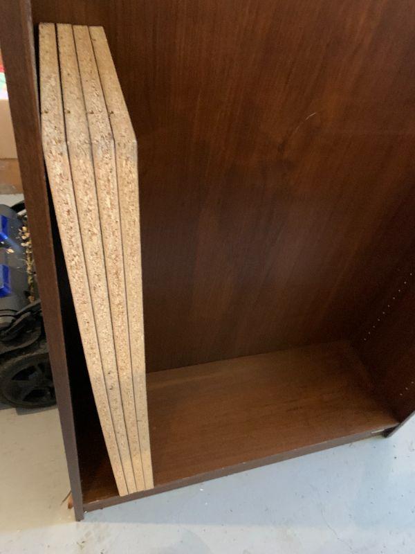 Brown pressed wood bookcase. Has a few knicks as pictured but includes all hardware and four adjustable height shelves.