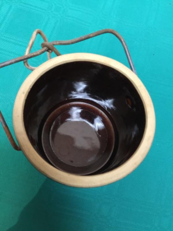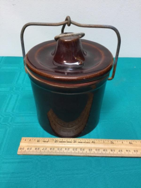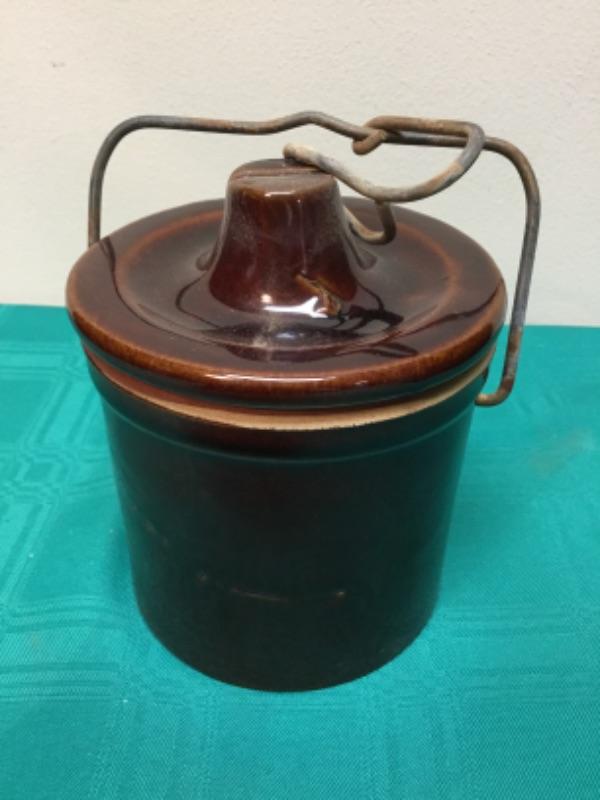 Cute dark brown butter crock made of ceramic. Has a metal hinge closure and rubber O-ring seal. No chips or cracks. Very good condition.