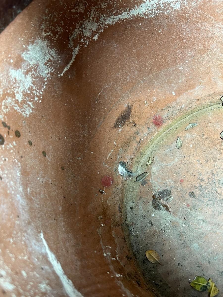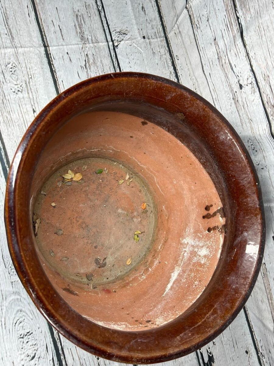 Brown Ceramic Garden Pot Planter With Attached Saucer, there is some light wear, but there is no significant damage and is in good useable condition. About 10" size. Check pictures for more details and for sizing.