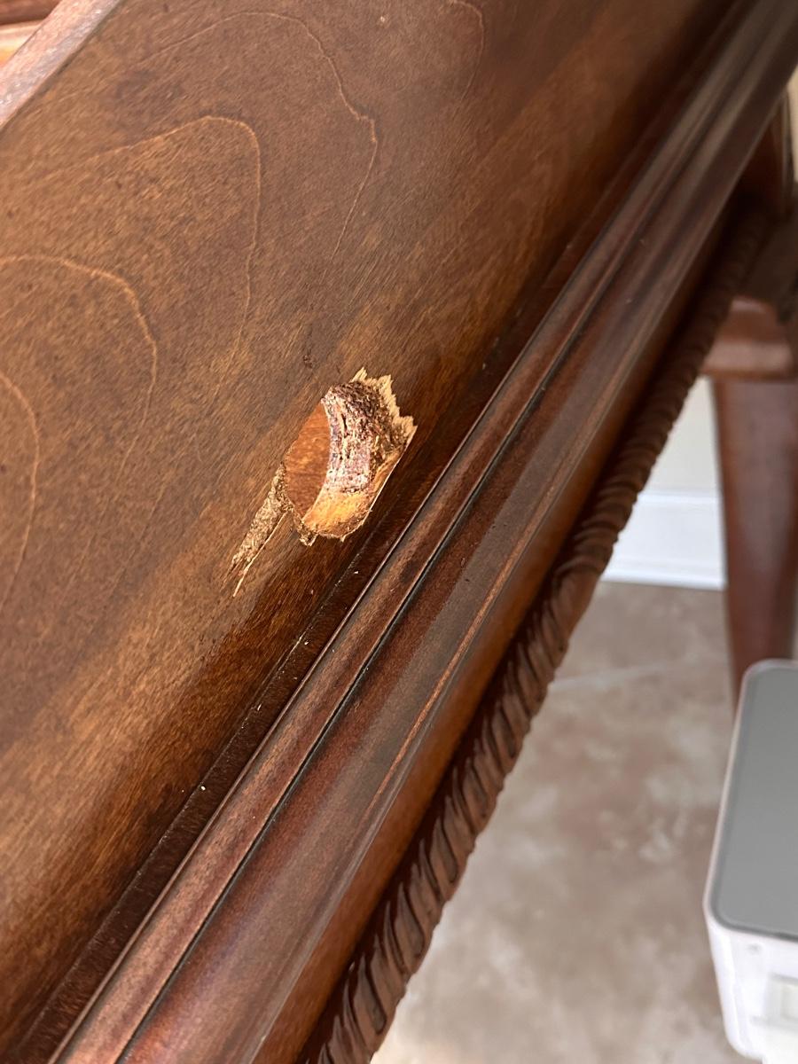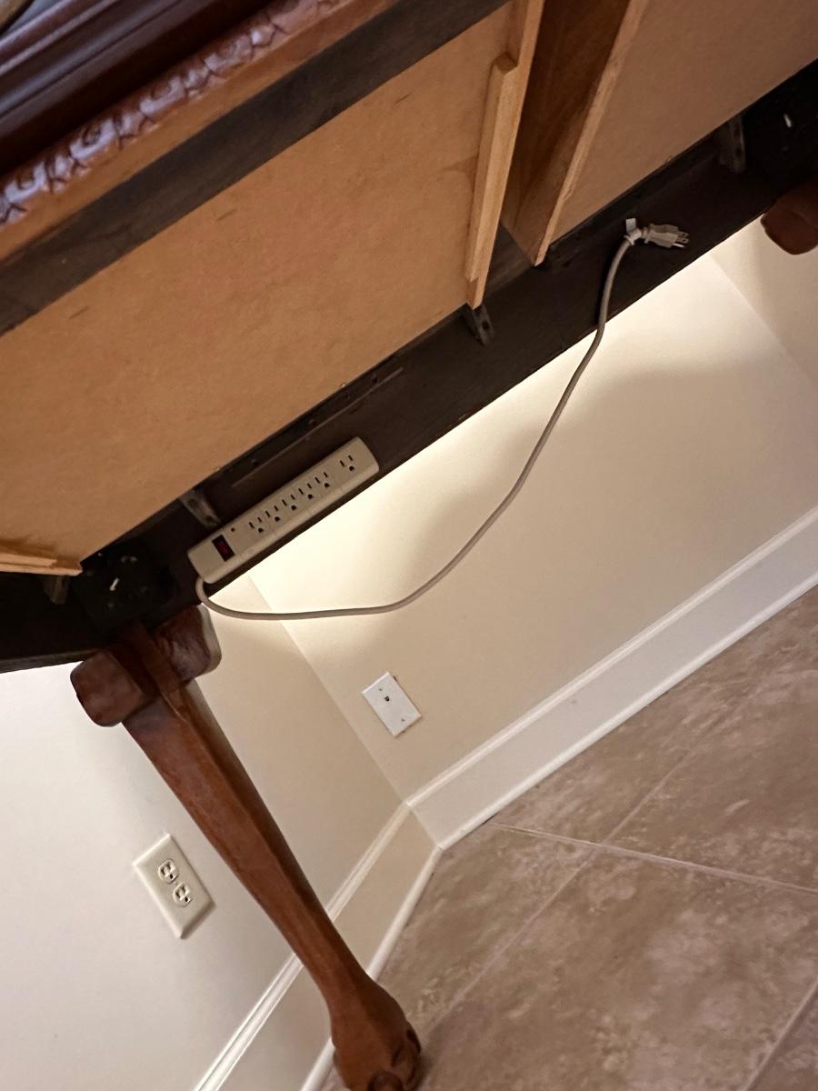 Sturdy, super nice ~ Client added a power strip underneath ~ desk has some little flaws I’d like to share. ~ the little 8 drawers need new pulls (hardware) ~ client drilled a hole on each side for cords, however, it created some damage on the outside of the desk (see photos) ~ No brand ~ 51” H x 50” W x 31” D