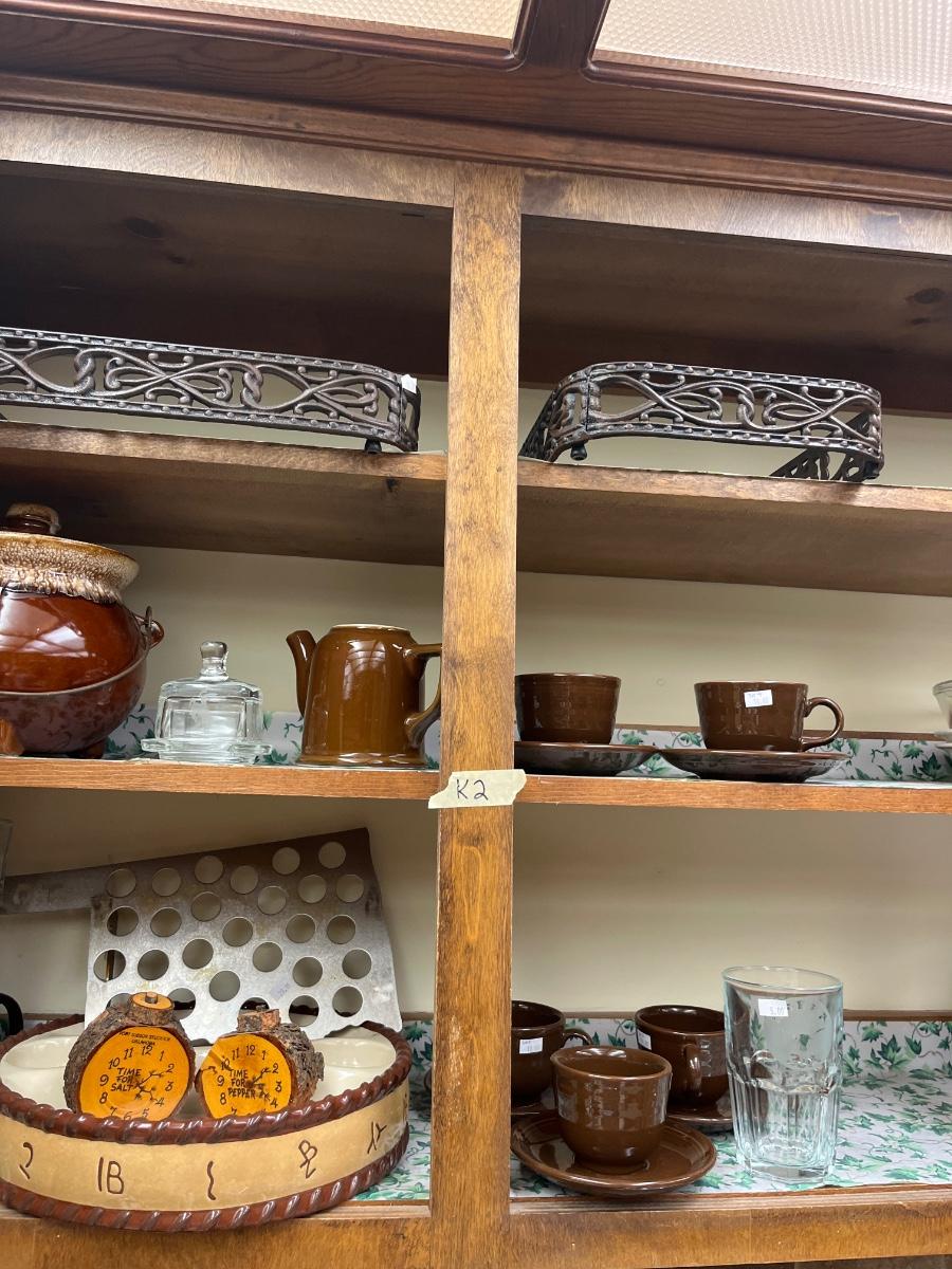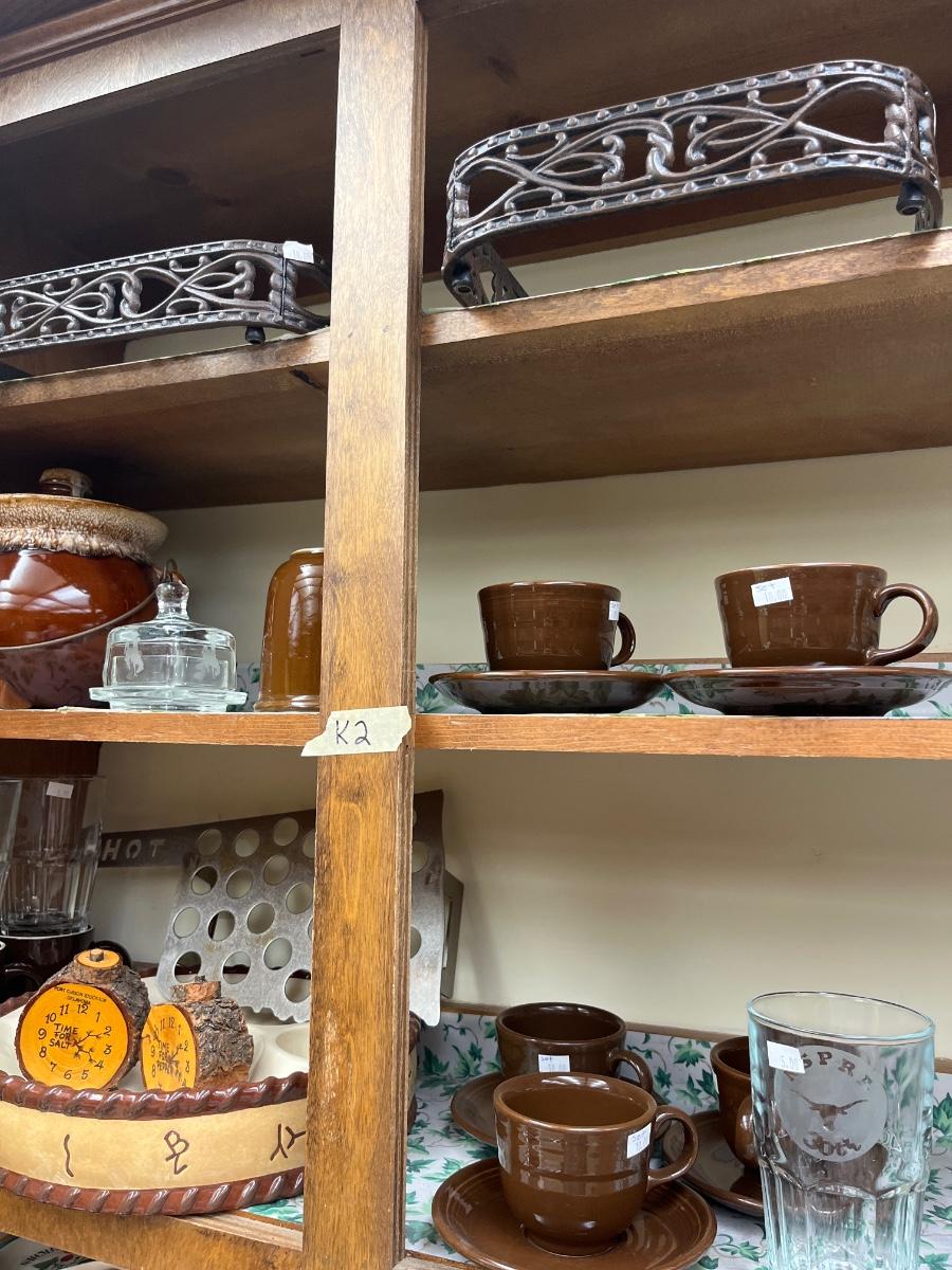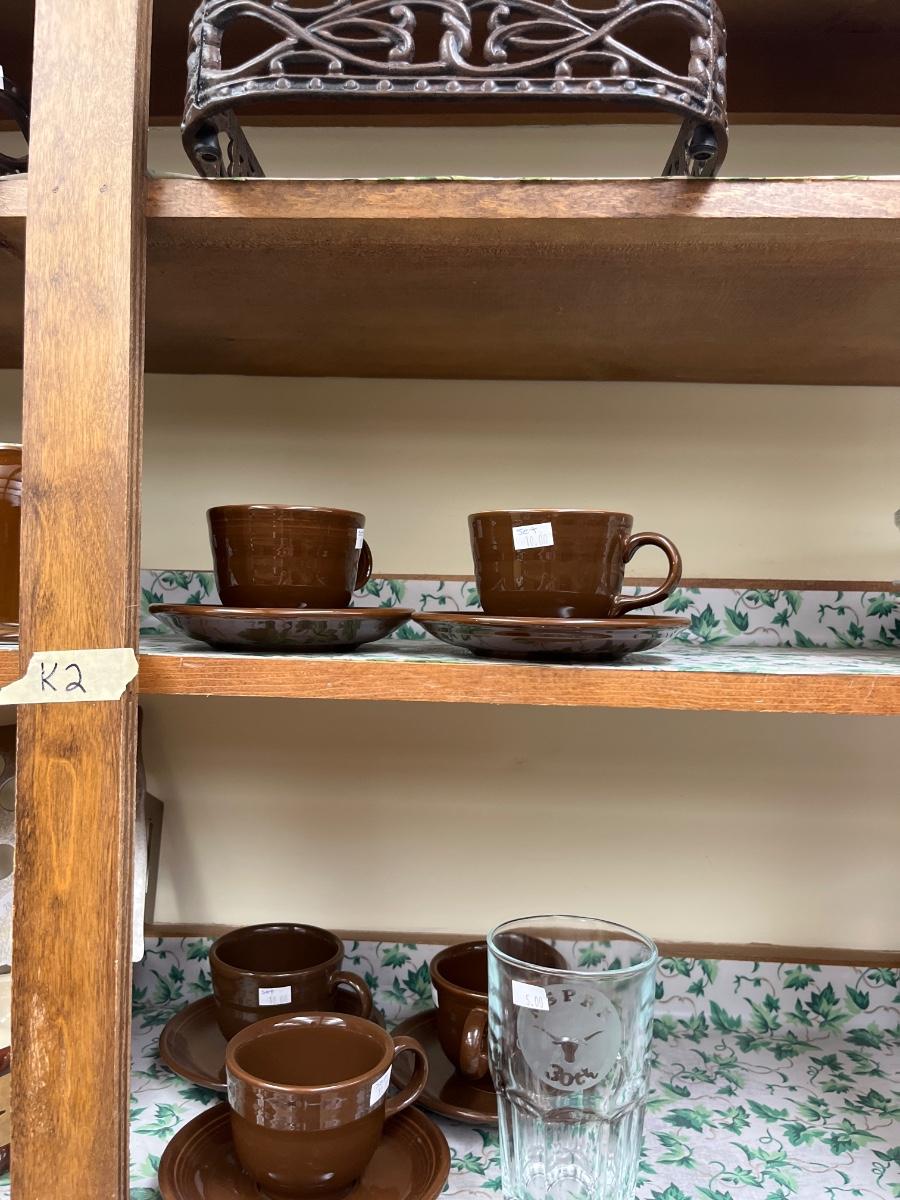 Fiesta Cups and saucers, cowboy serving dish.Bean crock, two casserole holders.