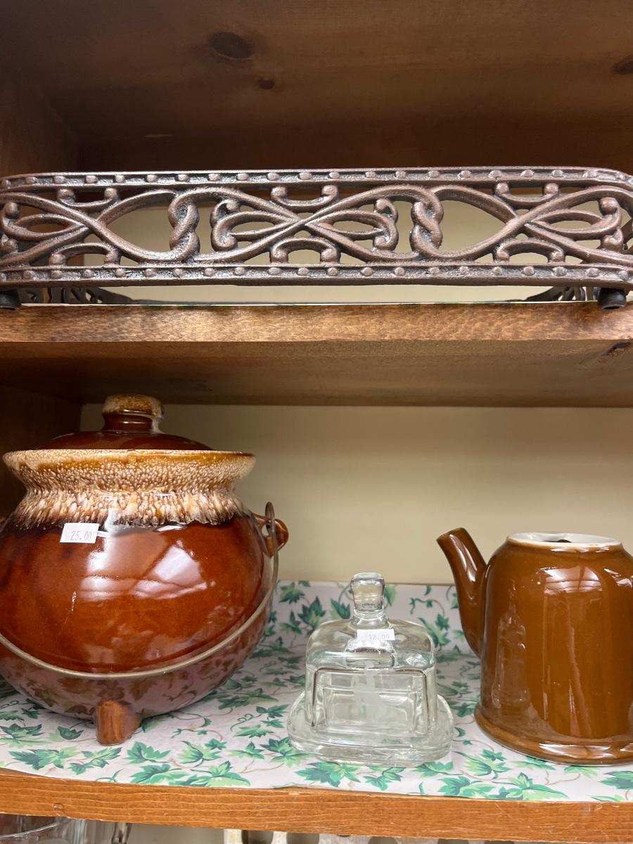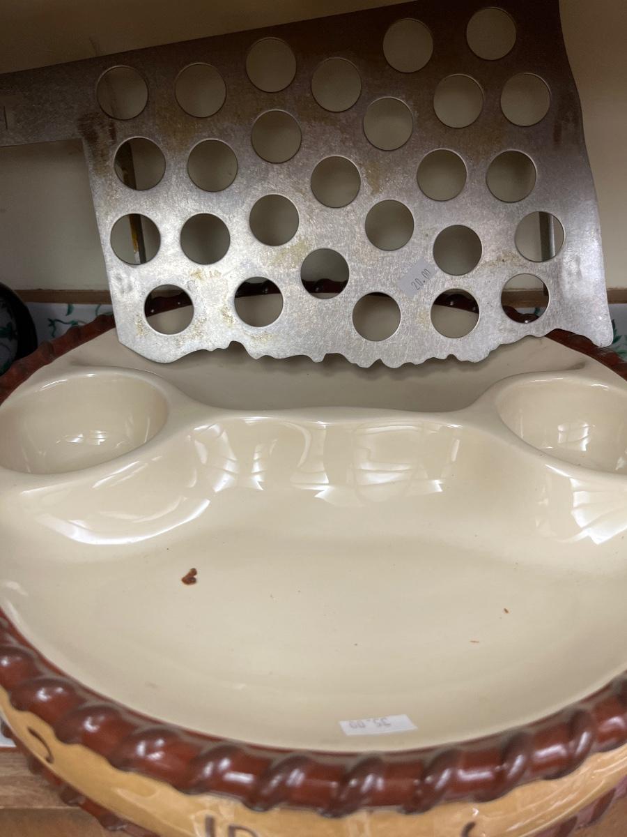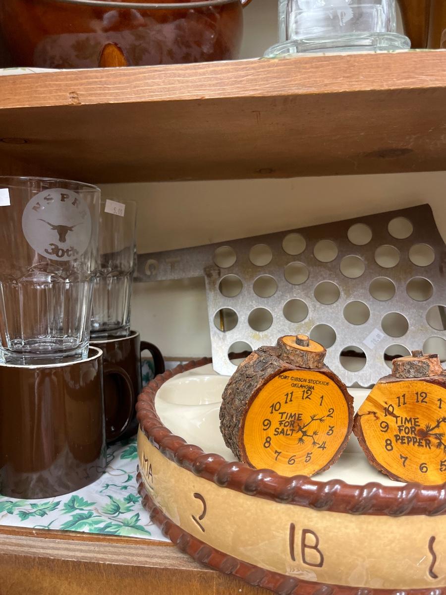 Fiesta Cups and saucers, cowboy serving dish.Bean crock, two casserole holders.