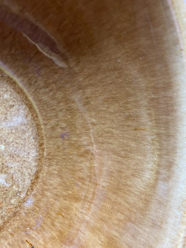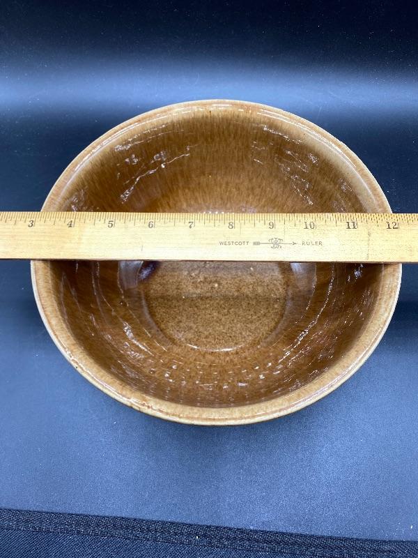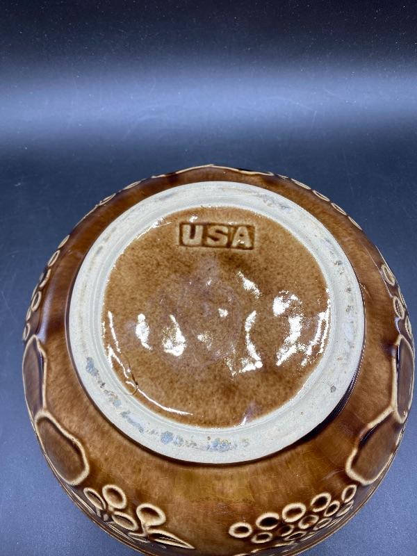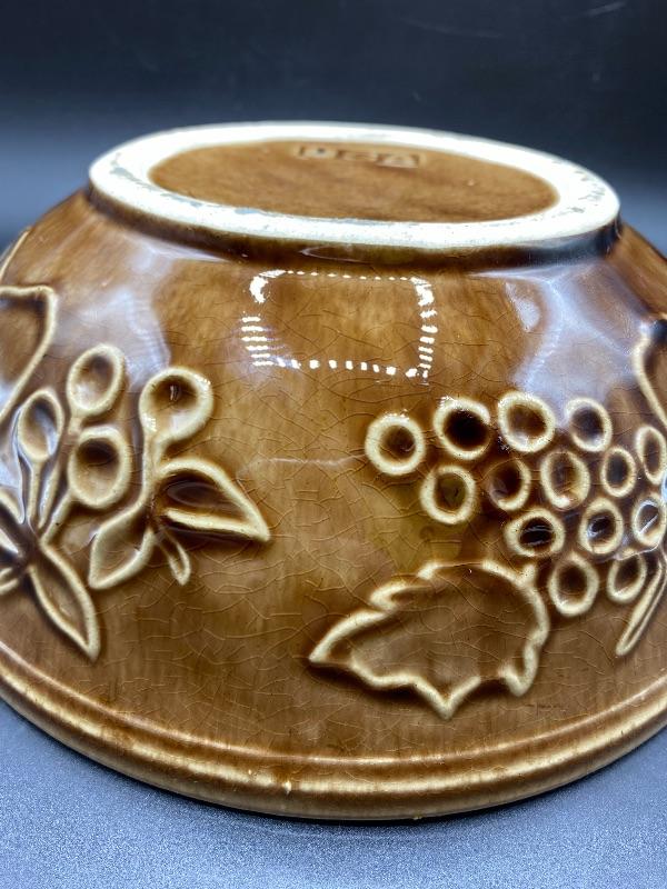 Brown dripware mixing bowl. Fruit embossed pattern. Stamped USA on the bottom. Crazing to the glaze but no chips. 9" across.