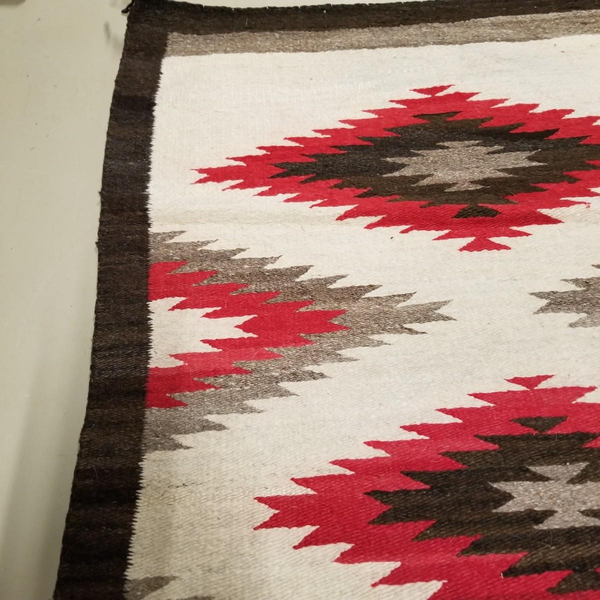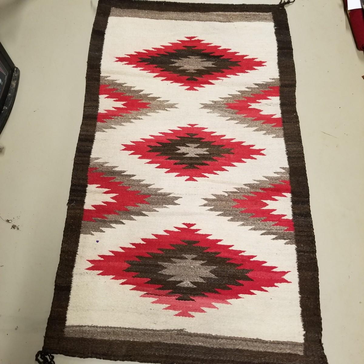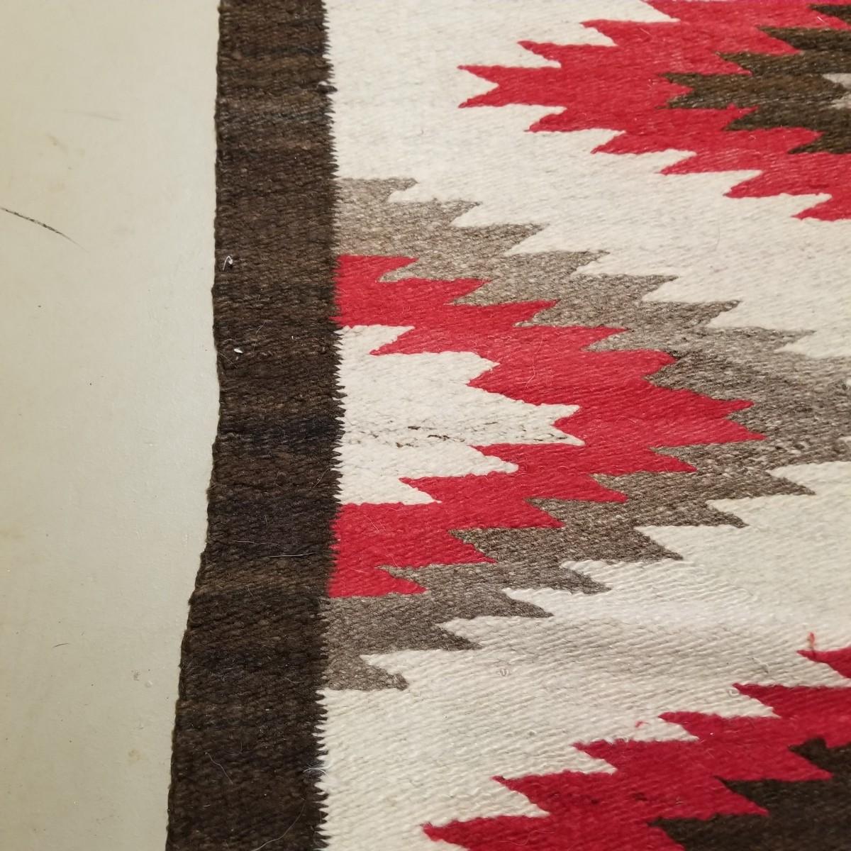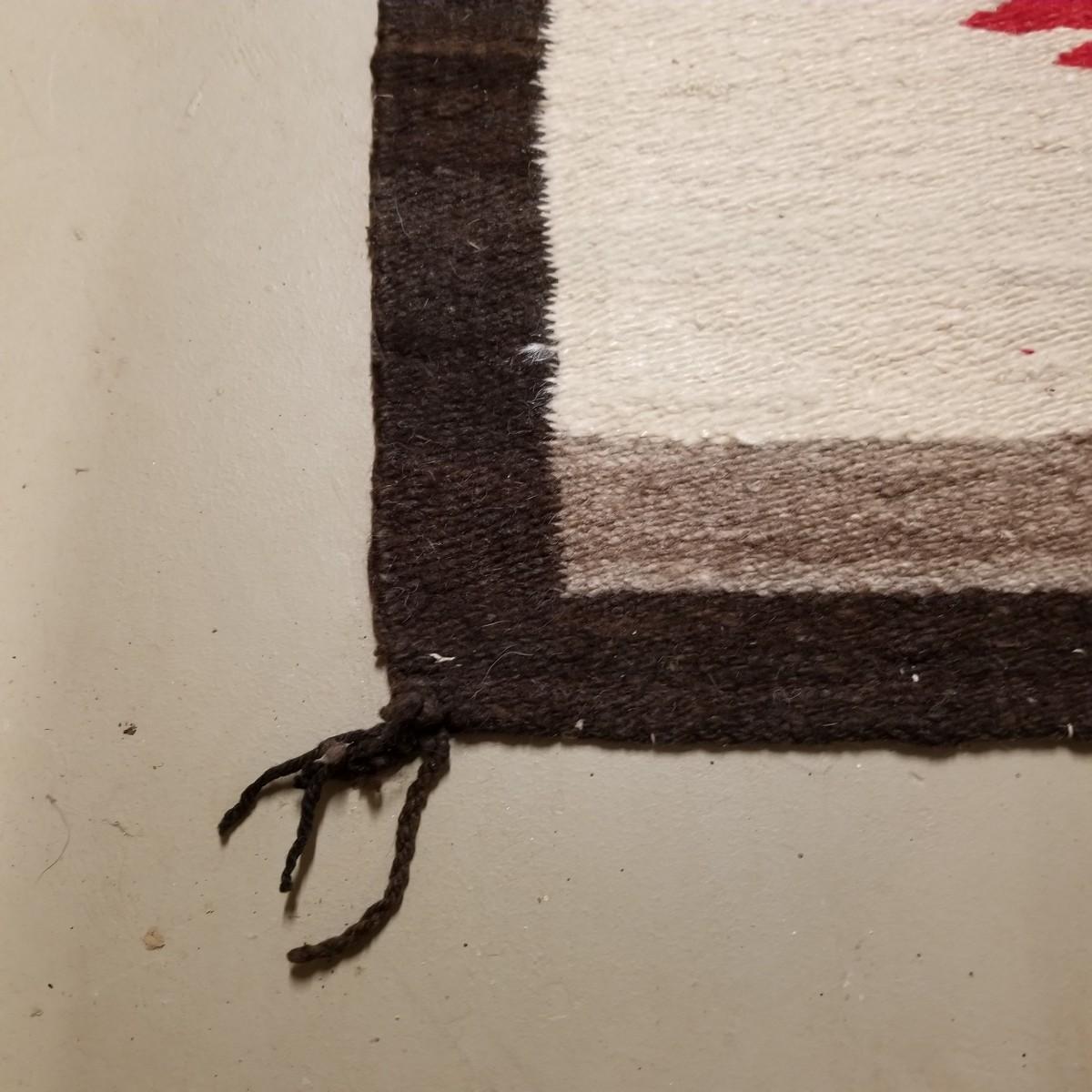 Rectangular rug with 2" brown border, measures 57.5" x 33.5. Has red, brown and tan geometric designs. Shows normal wear except for one corner, see photos. This textile has Navajo traits and appears to be hand woven. Local pickup only.