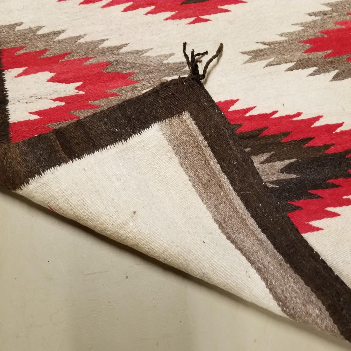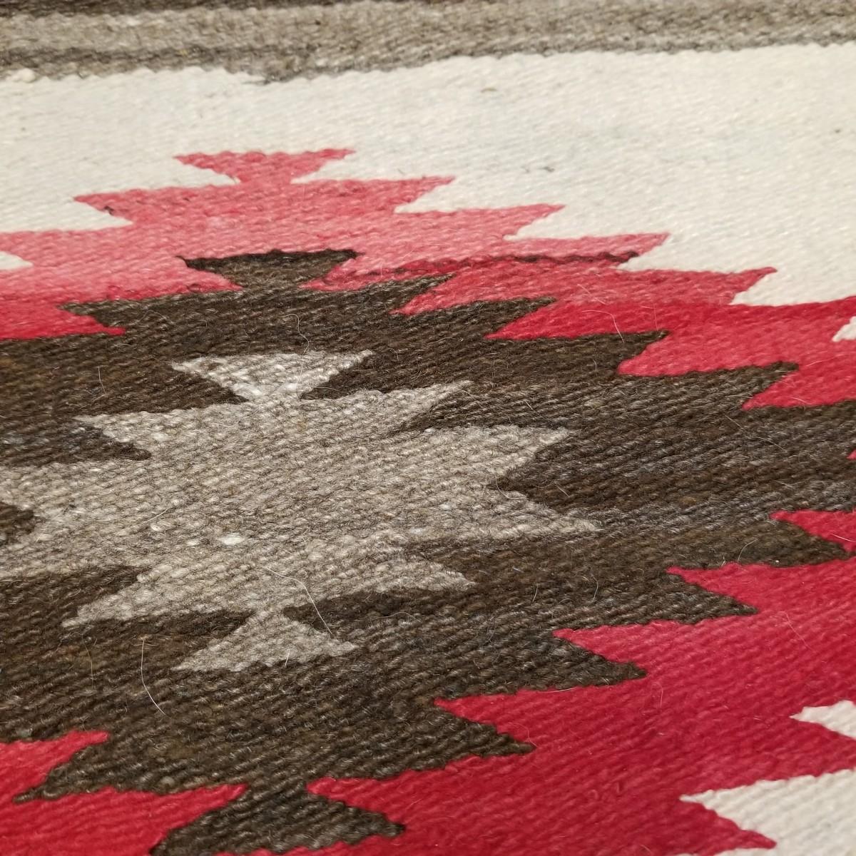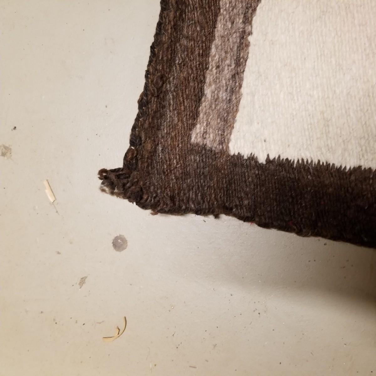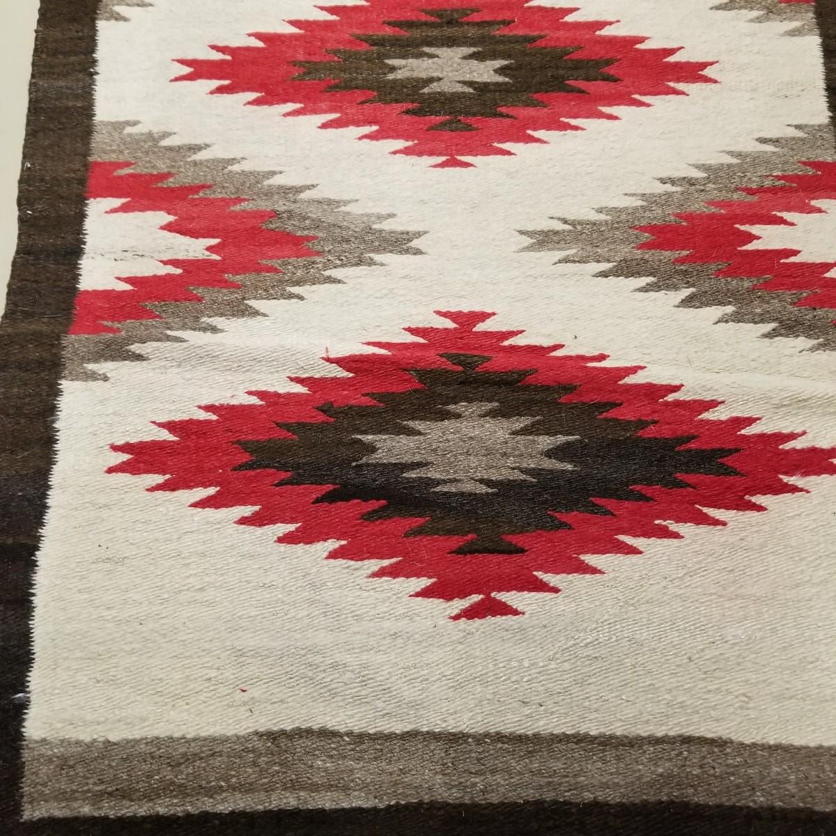 Rectangular rug with 2" brown border, measures 57.5" x 33.5. Has red, brown and tan geometric designs. Shows normal wear except for one corner, see photos. This textile has Navajo traits and appears to be hand woven. Local pickup only.
