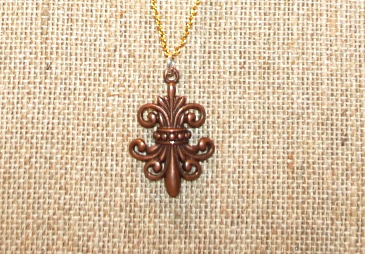 Brown "Fleur-de-Lis" Style PENDANT (1¼" x 1") on a Gold Tone Necklace Chain 18" L
