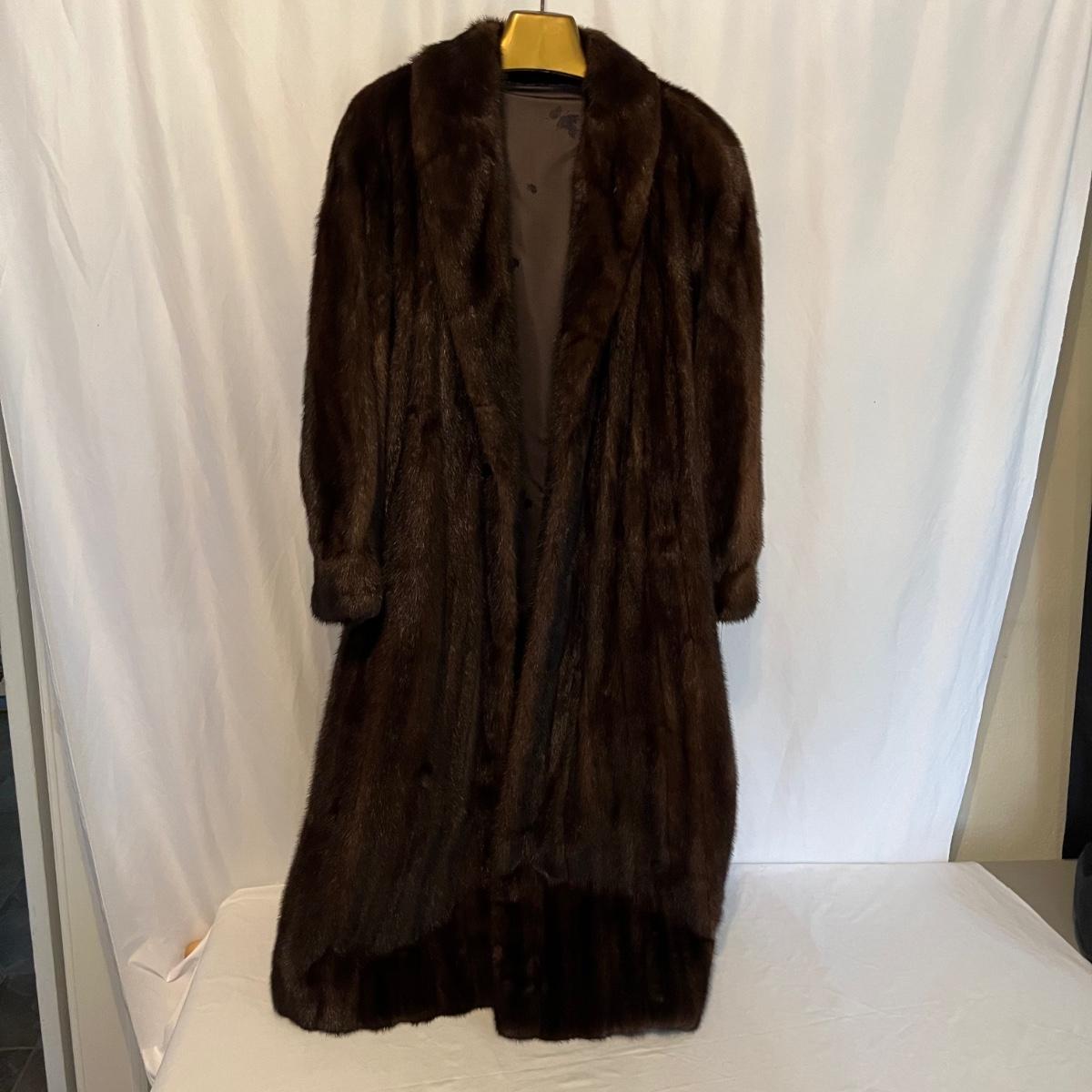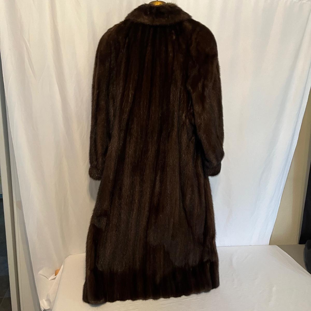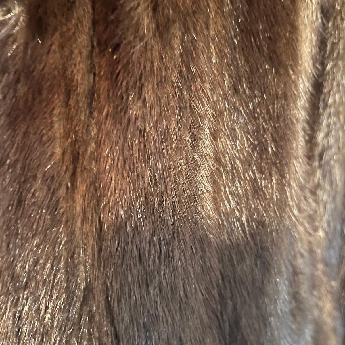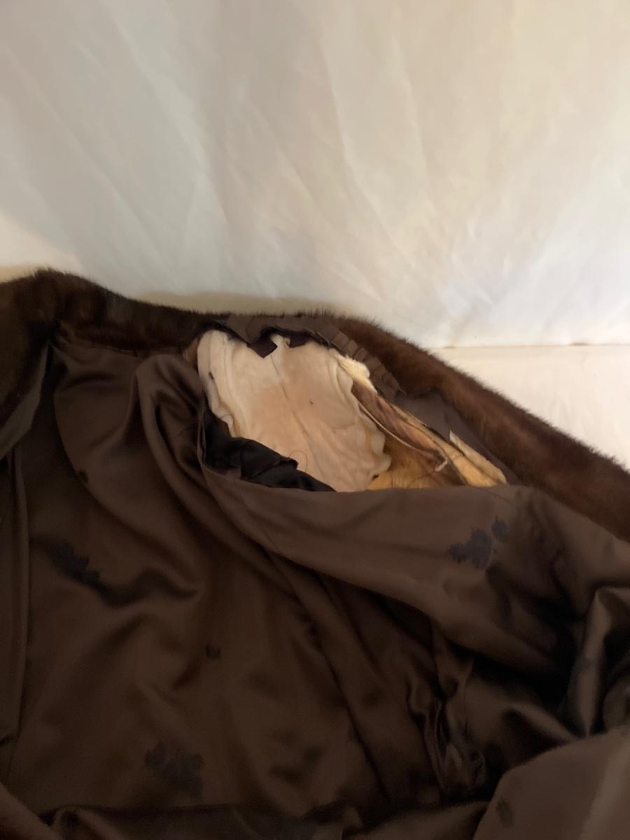Lot includes a long brown fur mink coat that is 50” long. The Left shoulder has lining that is unstitched. This coat is heavy and has two deep outside pockets. Note the stitching on the inside liner and the “Josephine” trademark on the inside. There is no size label yet it seems as if it is a size 14.