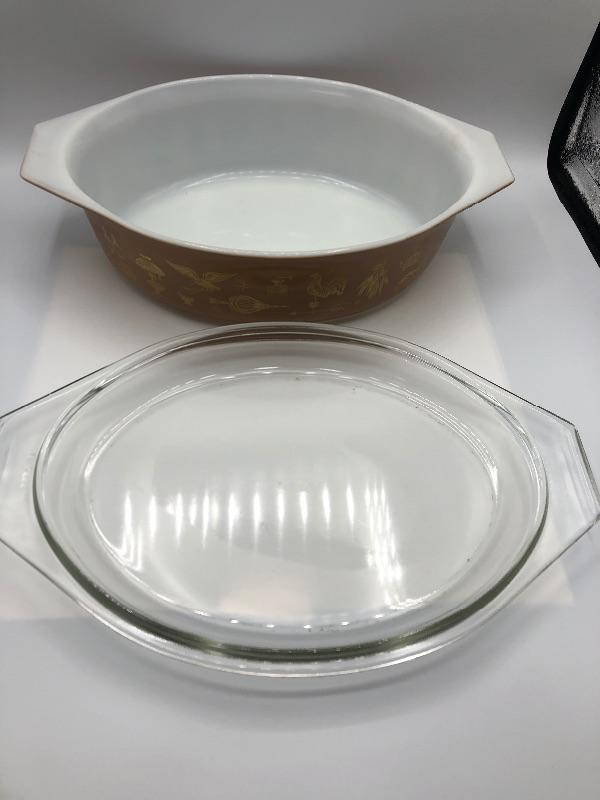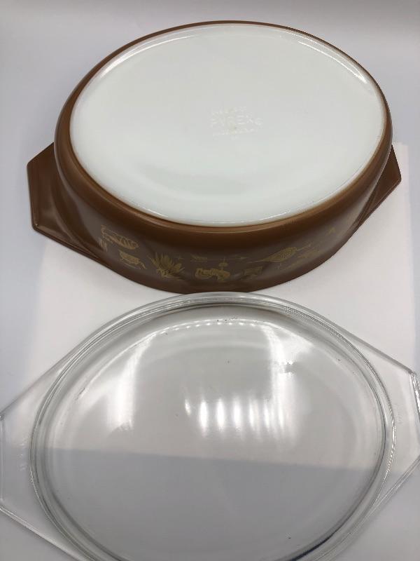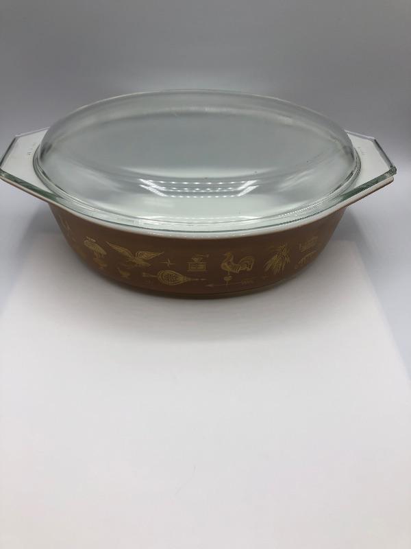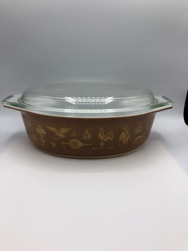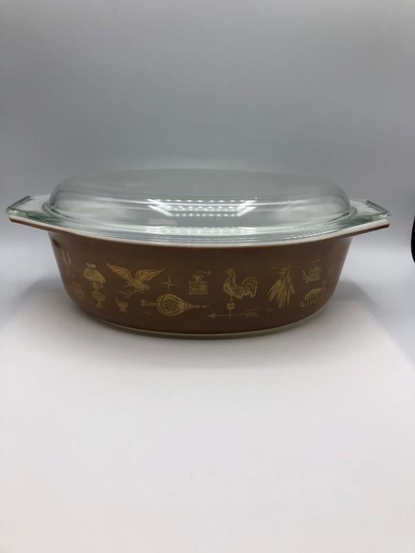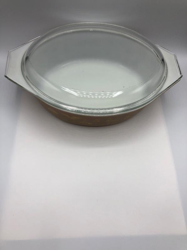 Pyrex Casserole Dish with lid. "Early American" brown & gold pattern. 2 1/2qt size. Previously used but in good condition.