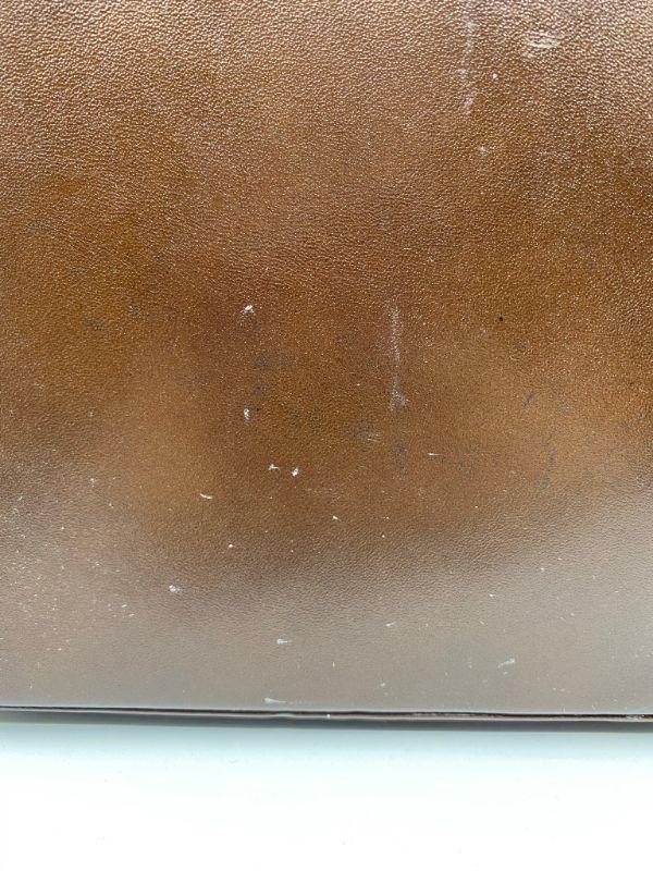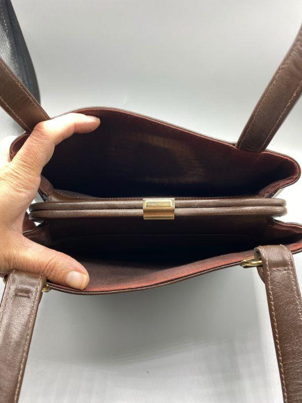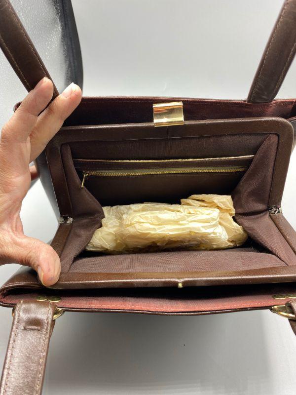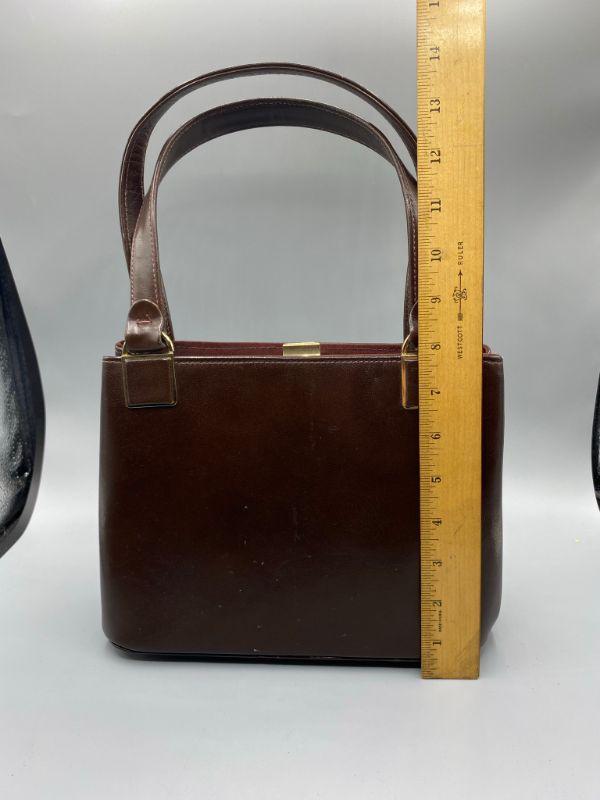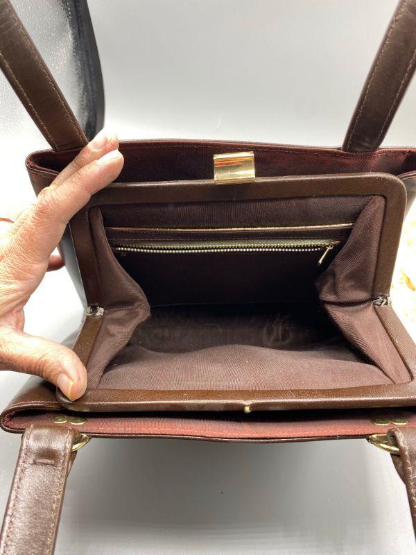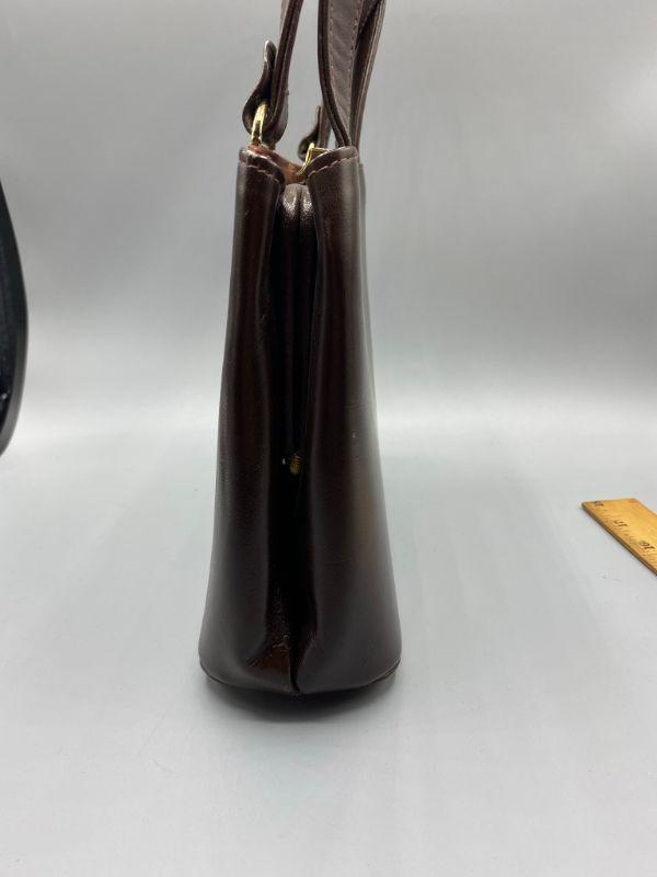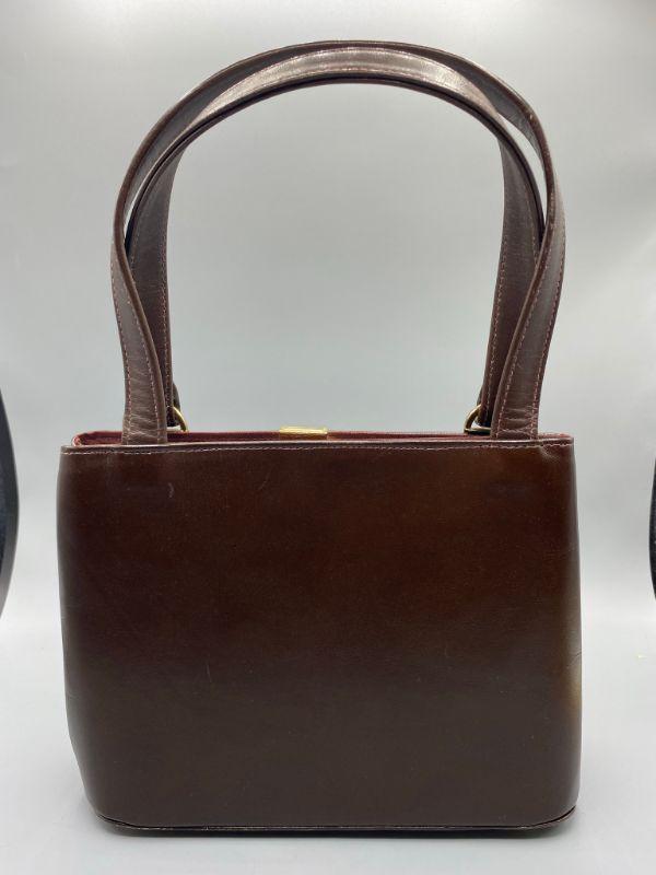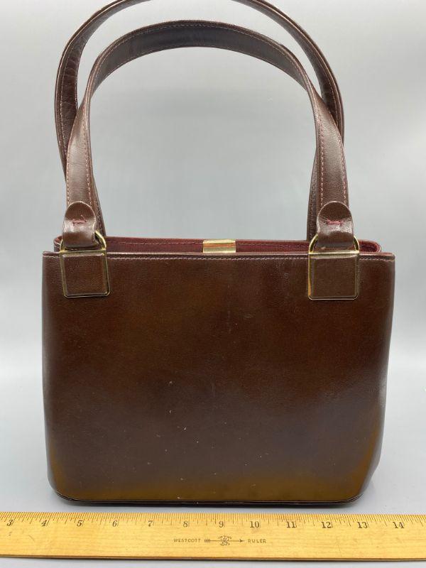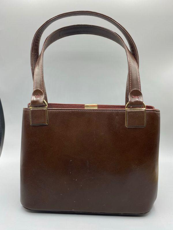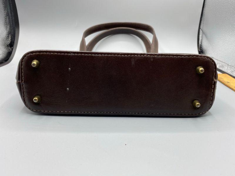 Rich medium brown handbag. Double strap handle. Multiple inside pockets. There is a faint white splatter on one side. Not sure if it will come off with some cleaning, see photo.