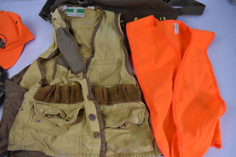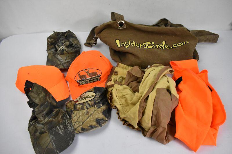 Brown "InsidersCircle.com" Tote with 5 Hunting Hats & 2 Hunting Vests