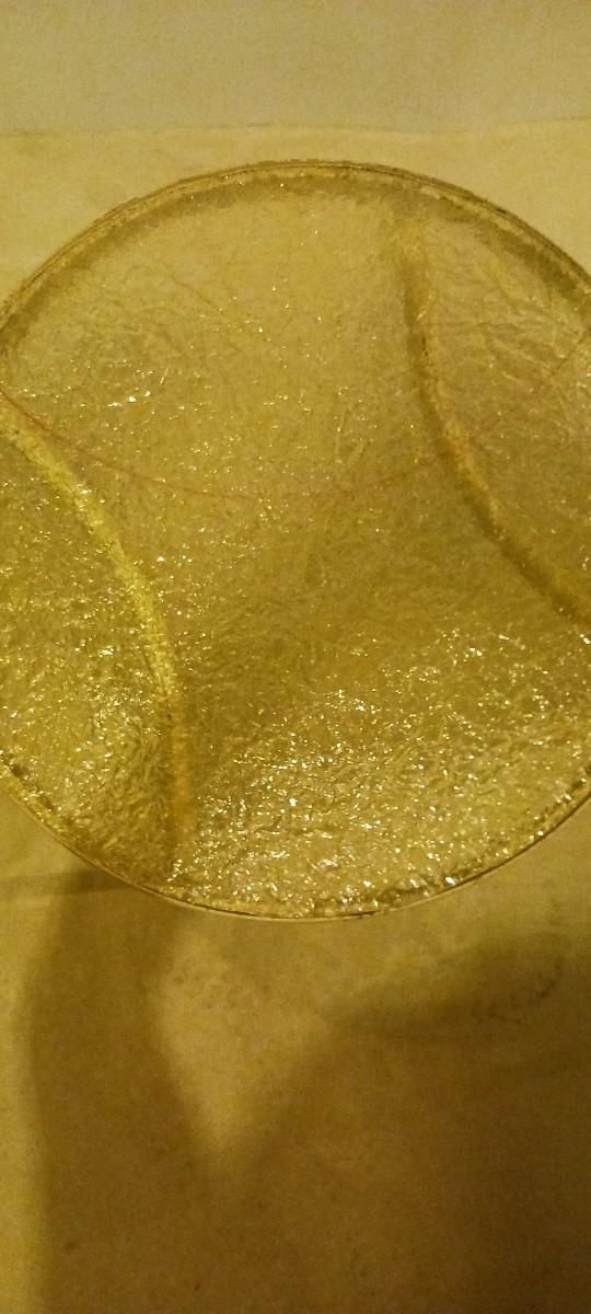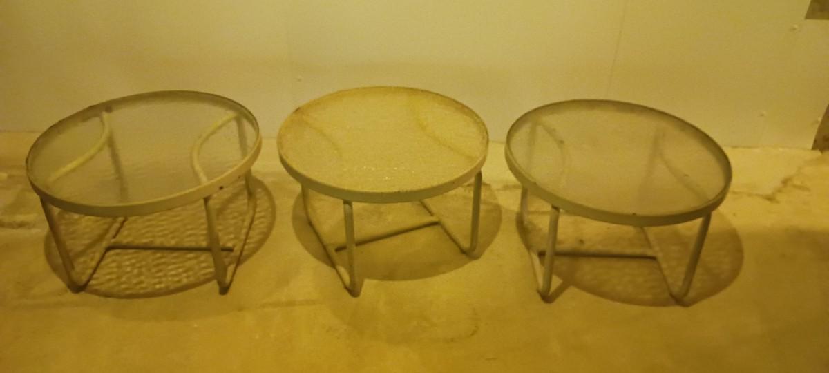 Metal is Putty in color. Glass is slightly textured for slippage prevention.. Set of 3 small tables 24" diameter 15" tall. Condition fair.