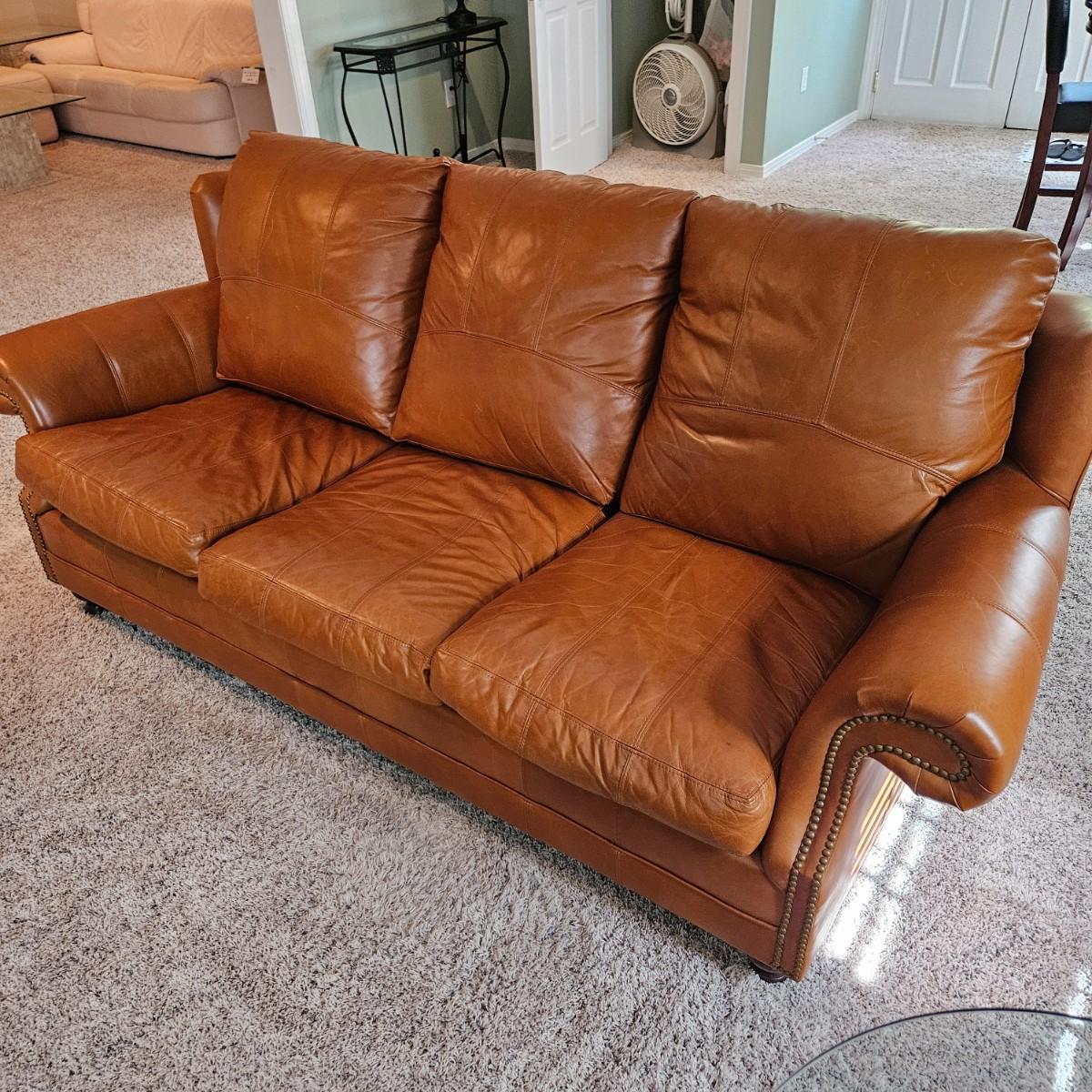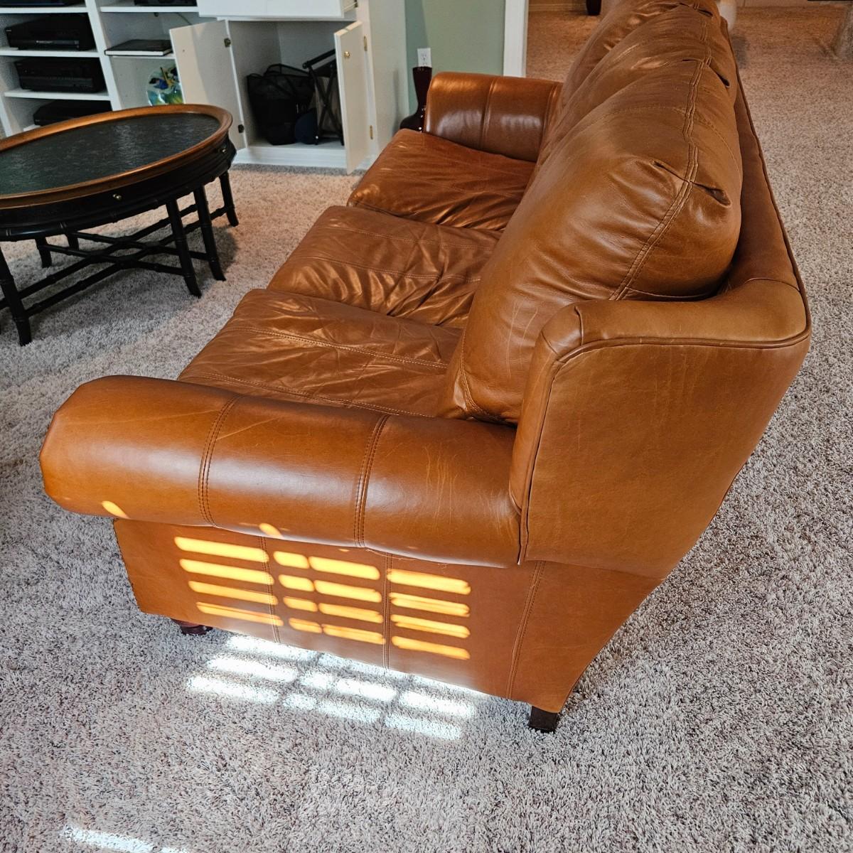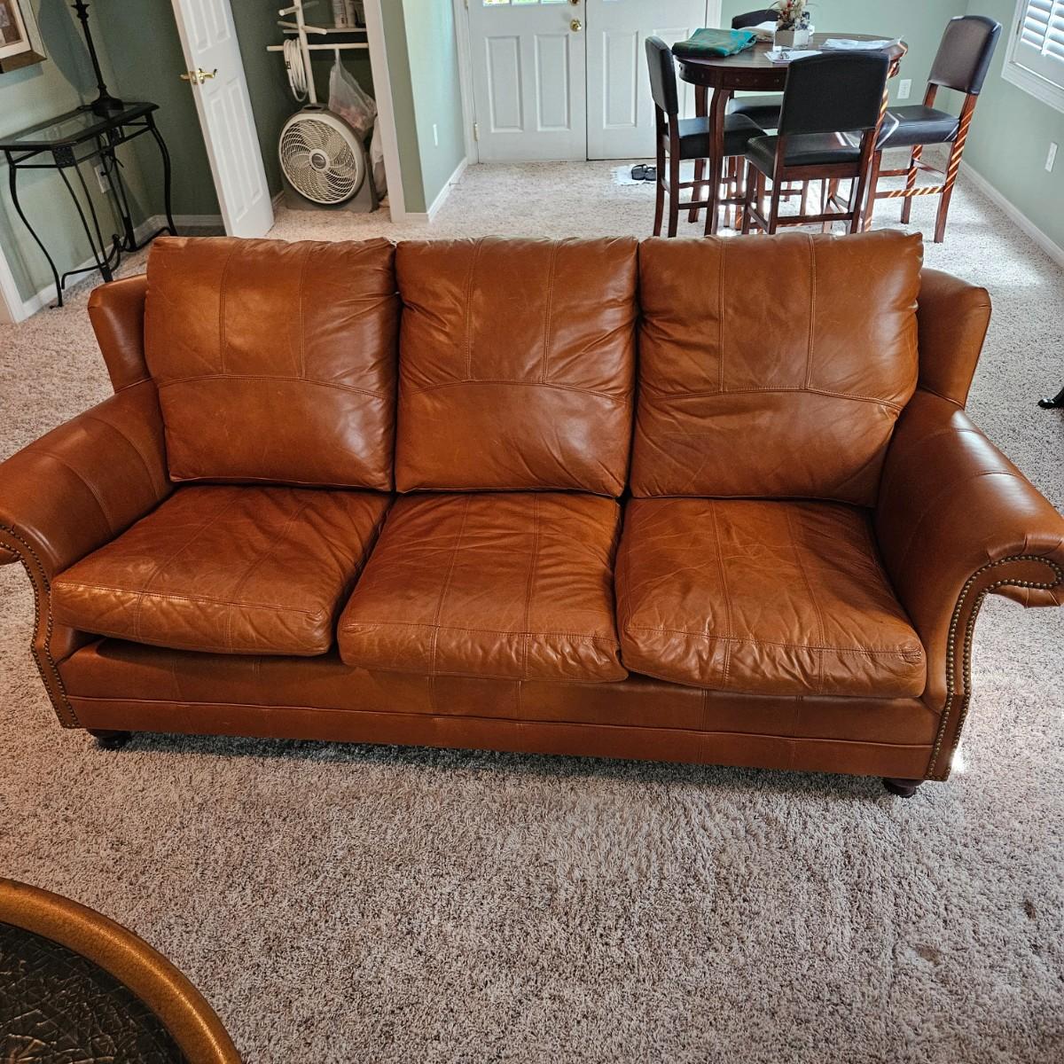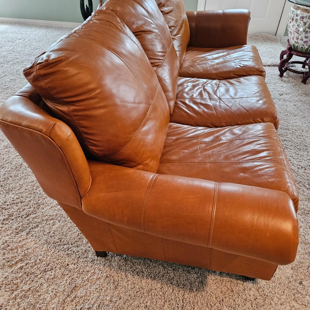 A medium brown leather couch that measures approximately 88" x 38" x 38" with a seat height of 18". This couch has a matching chair and ottoman in this auction. Local pickup only. Winning bidder must bring assistance to help move and load this item due to its weight and/or size.