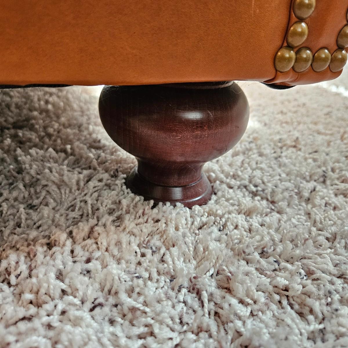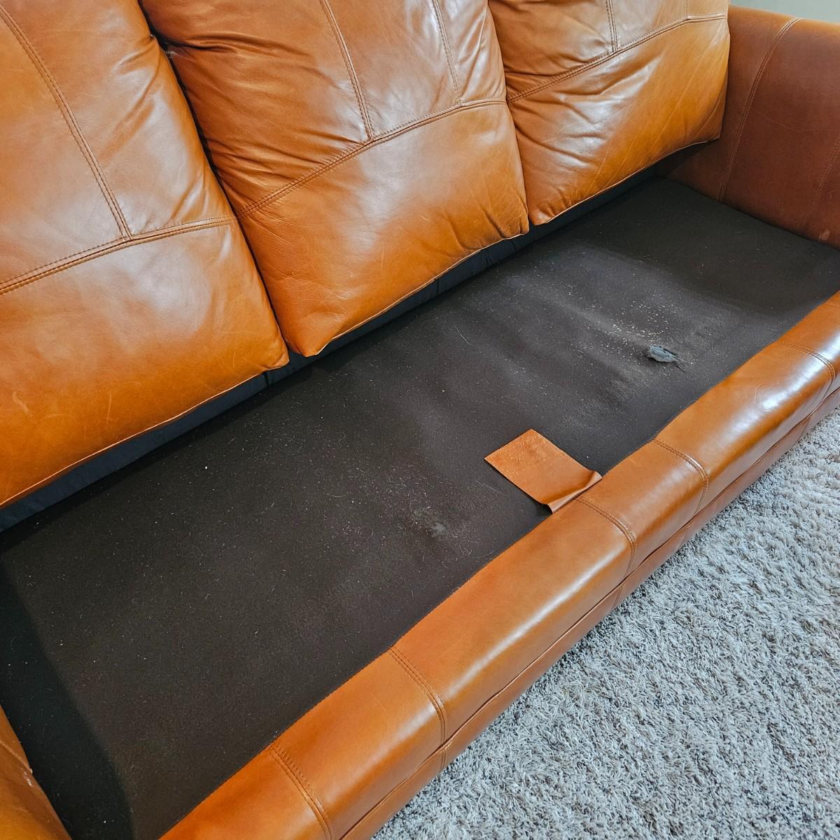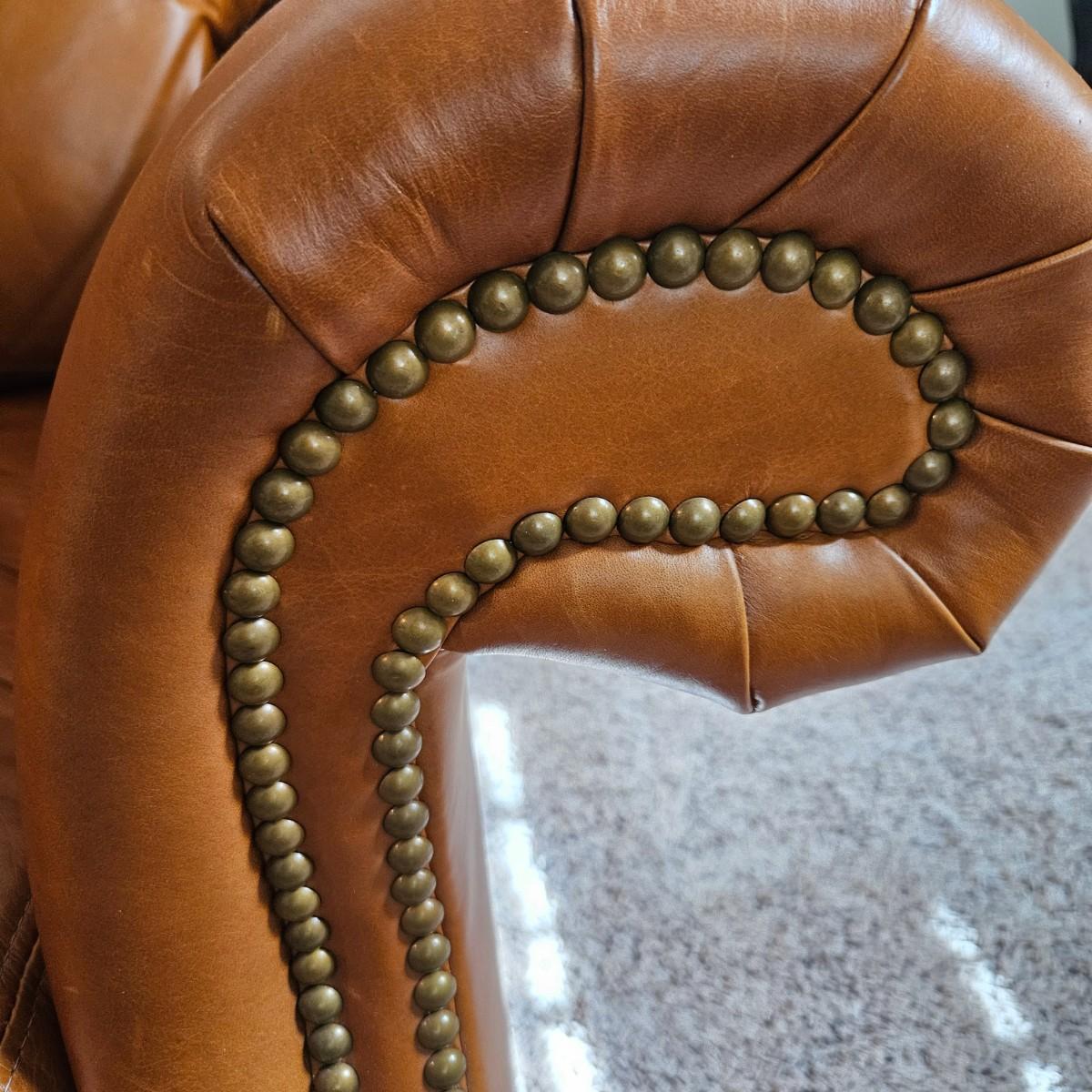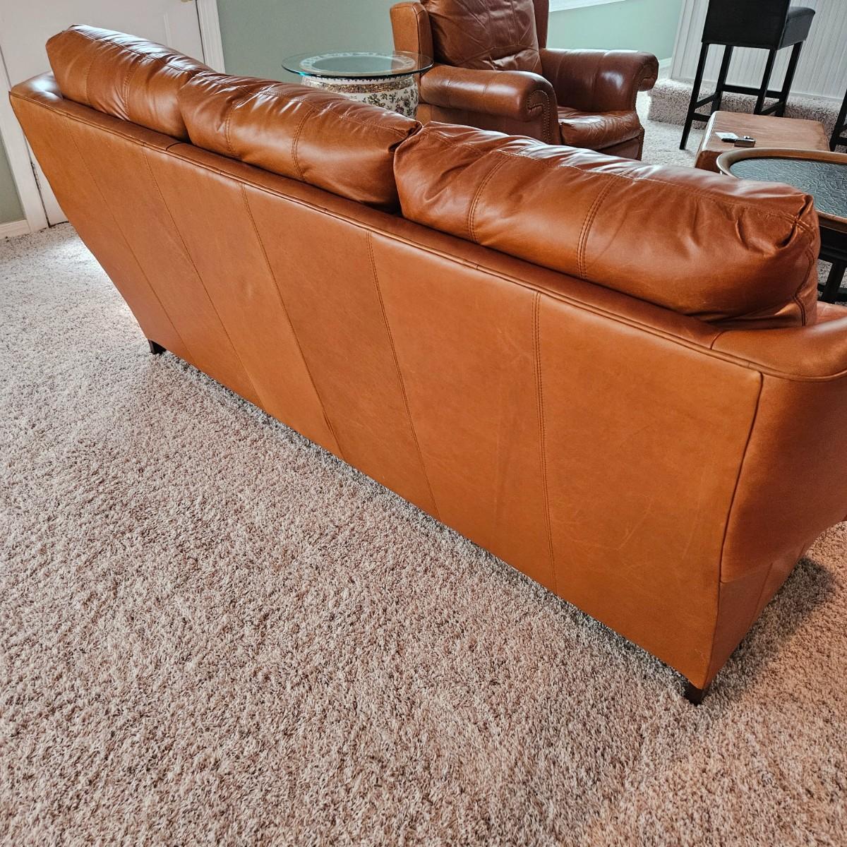 A medium brown leather couch that measures approximately 88" x 38" x 38" with a seat height of 18". This couch has a matching chair and ottoman in this auction. Local pickup only. Winning bidder must bring assistance to help move and load this item due to its weight and/or size.