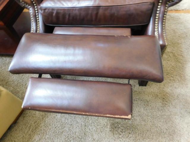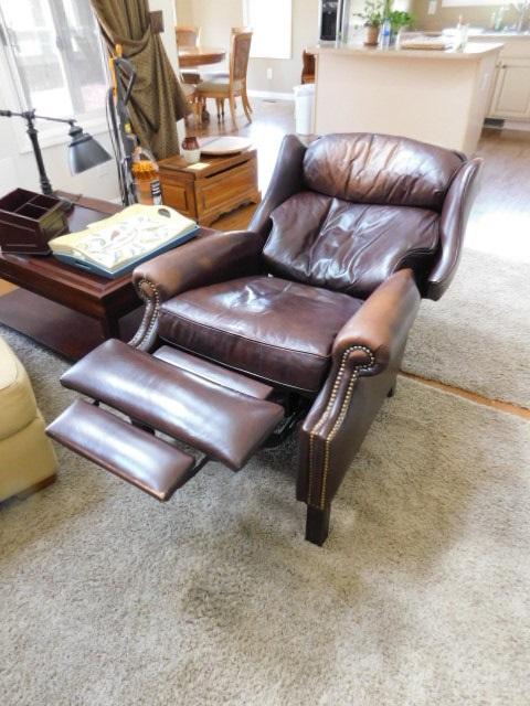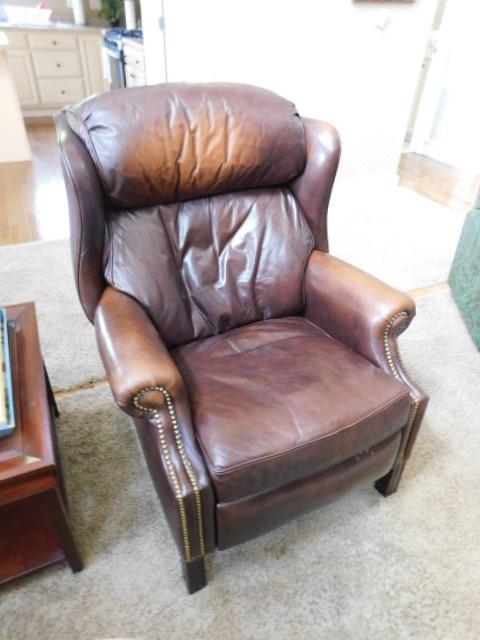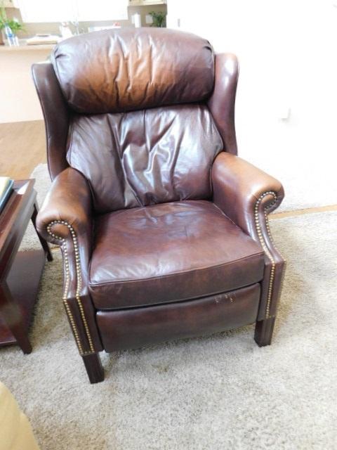 Brown Leather Manual Recliner by Hancock and More 30"w has some color fading and scratches as pictured. Main floor