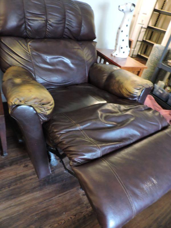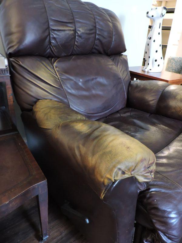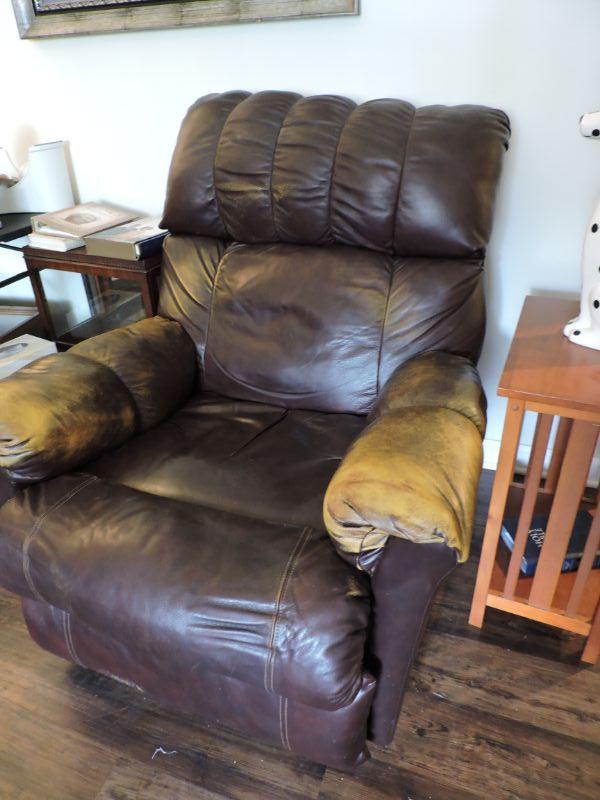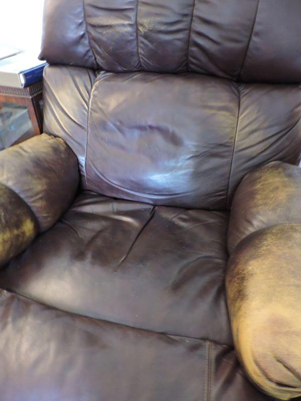 Brown leather recliner. In good condition, but faded on the arms. **Please read Terms and Conditions before placing a bid. Pick up is Thursday, August 15, 2019 from 4pm to 7pm or Sunday, August 18 from 11am-2pm in Mullica Hill. All sales are final. All sales are as is, where is. Please review all photos. Any props included in photos are not included in listing. All measurements are approximate.