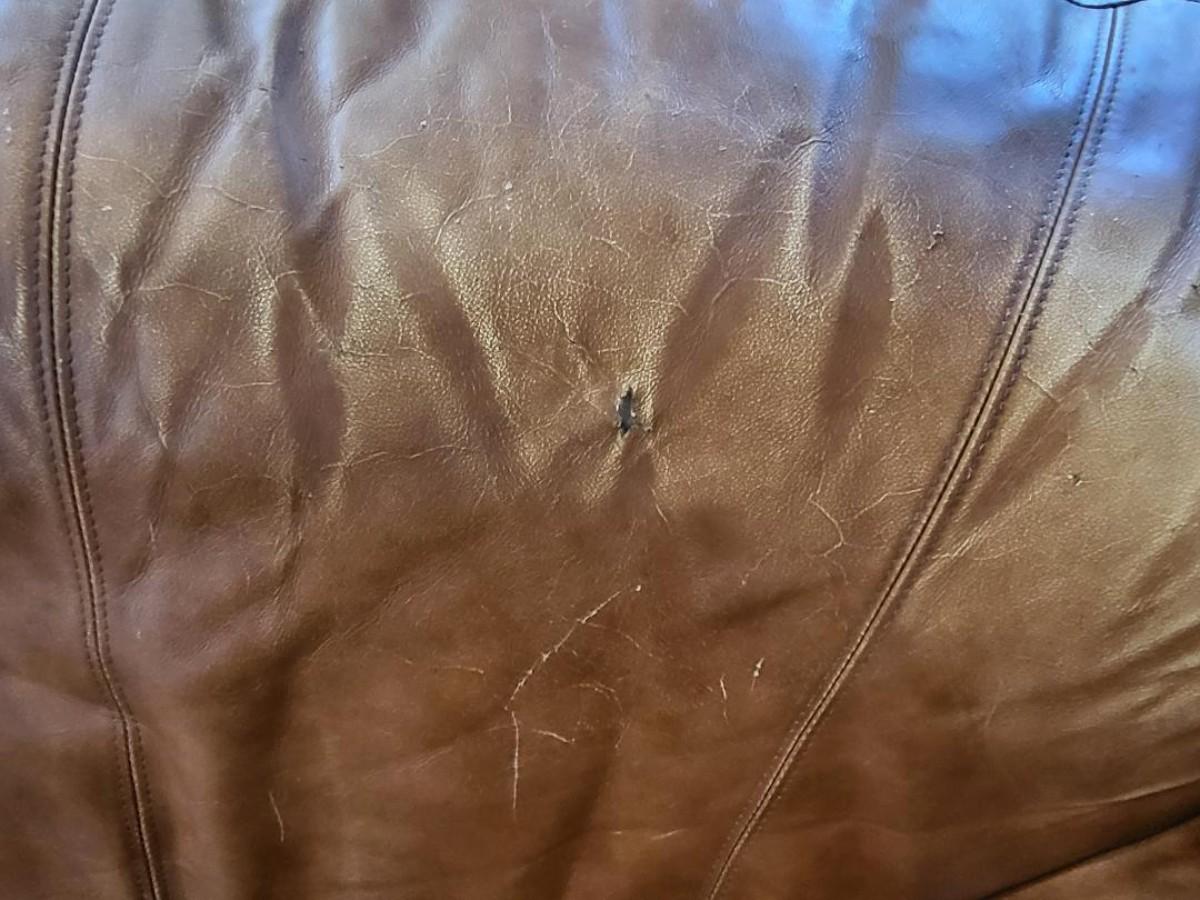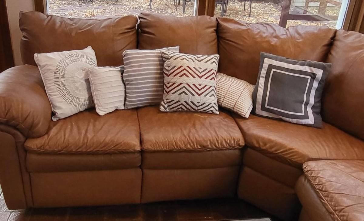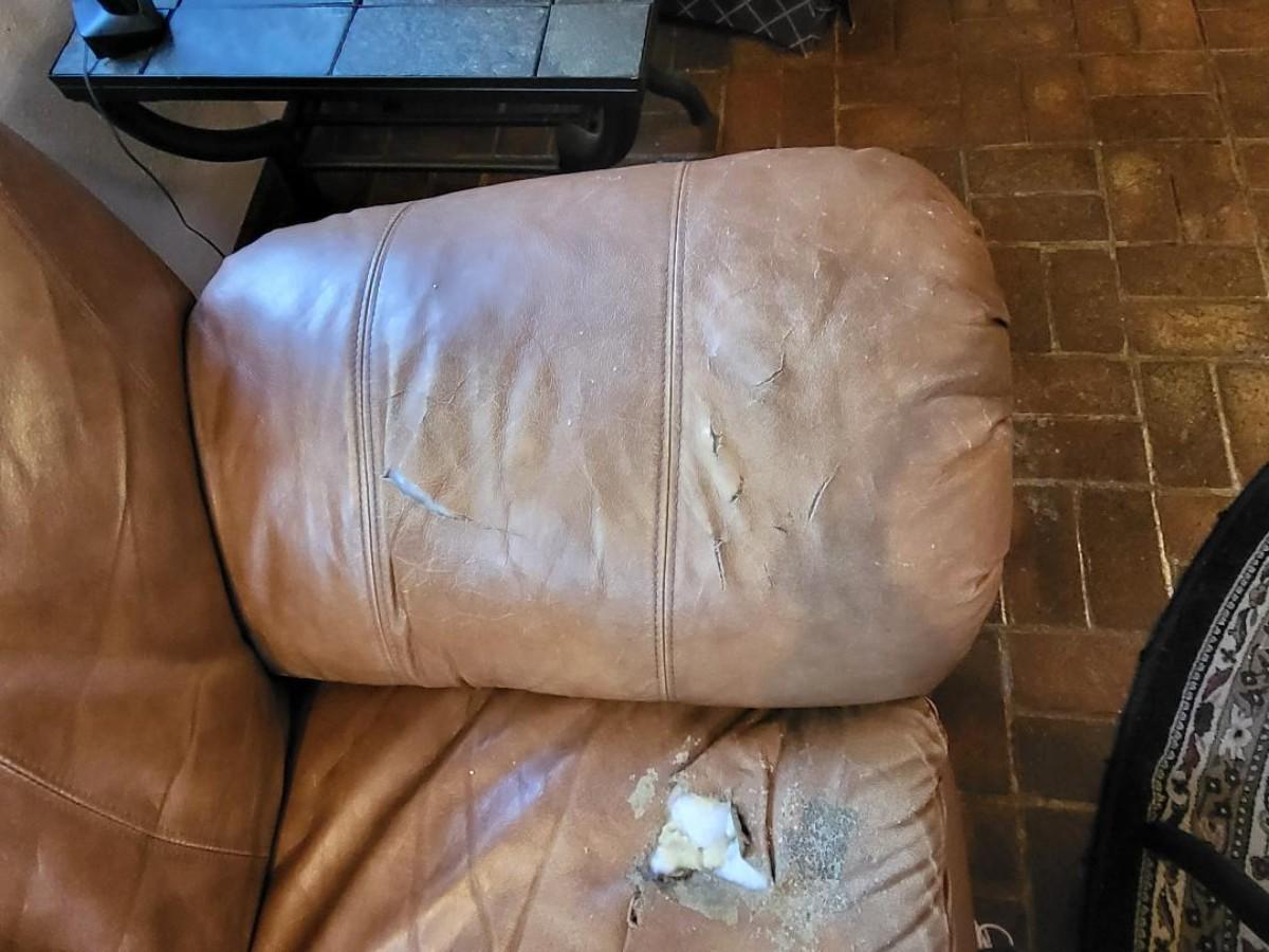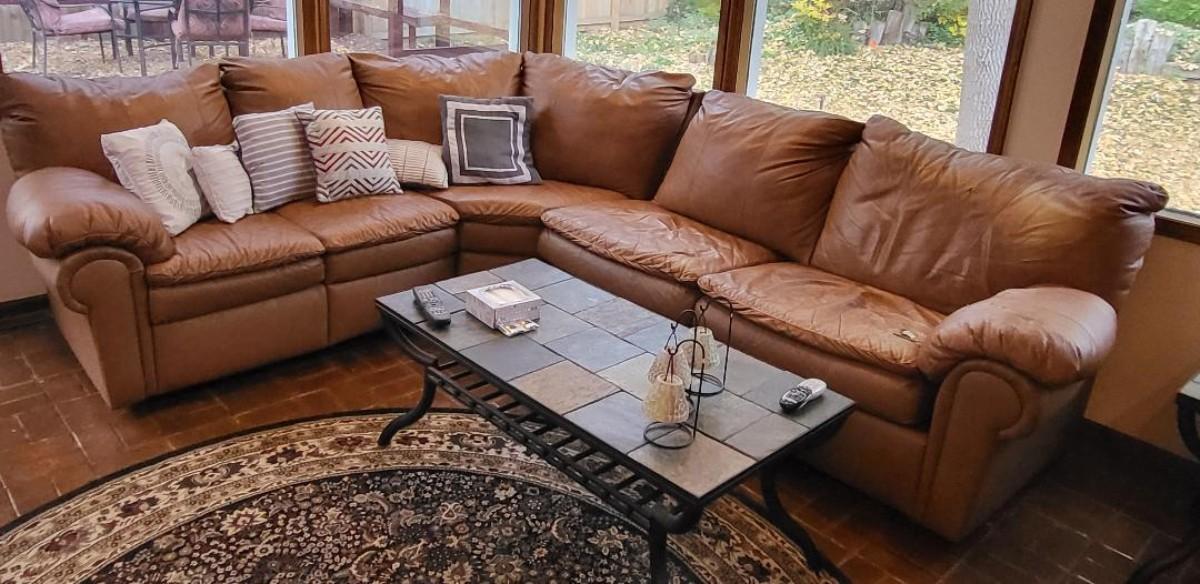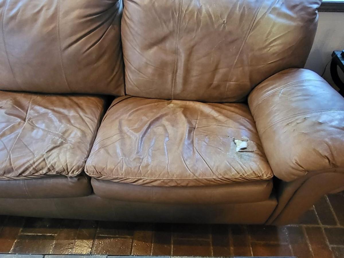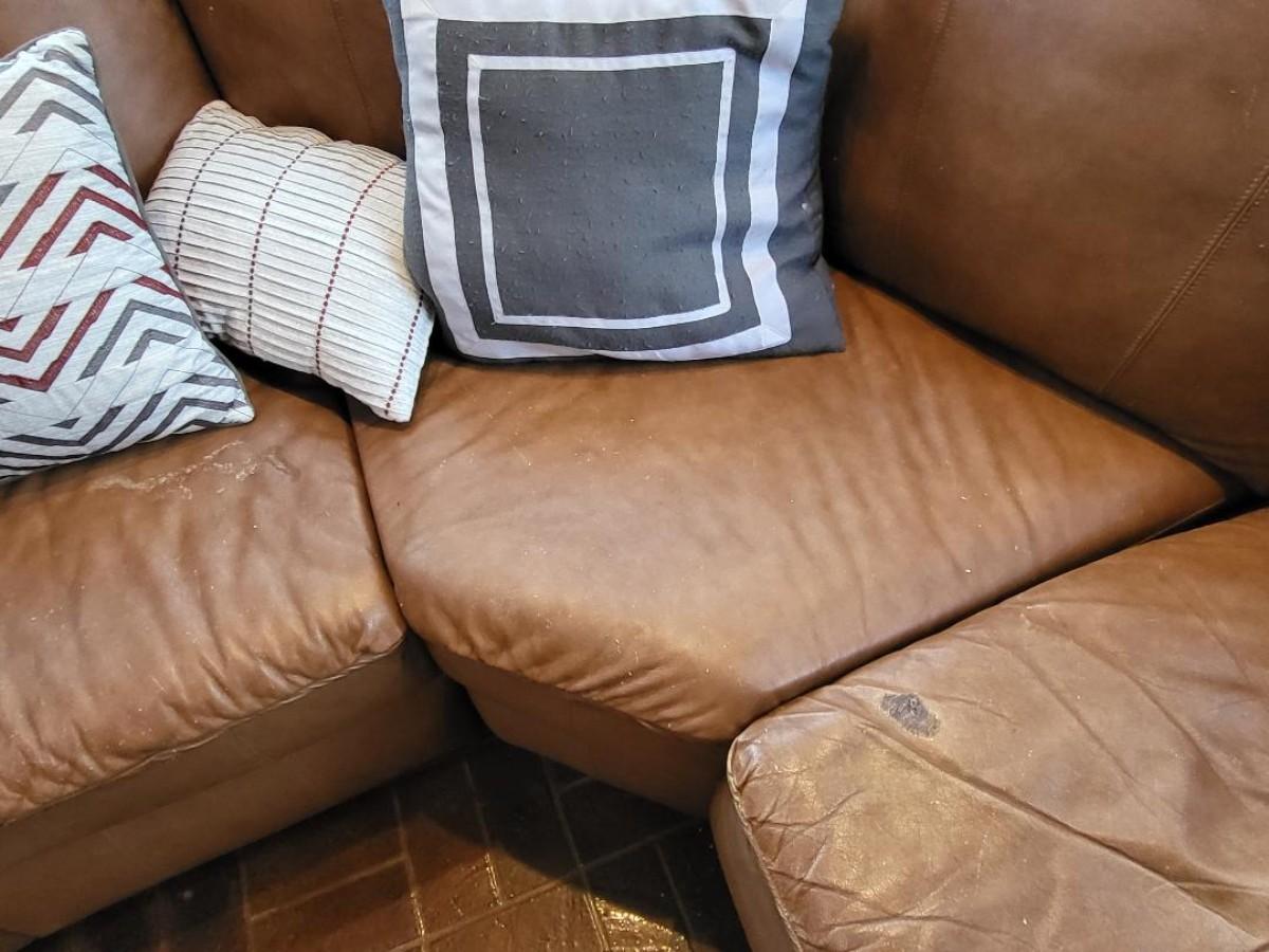 Comfy leather sectional with wear and tear (see pics for damage). Cat-friendly home.