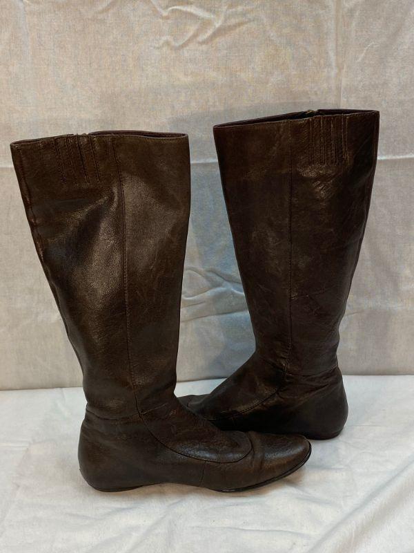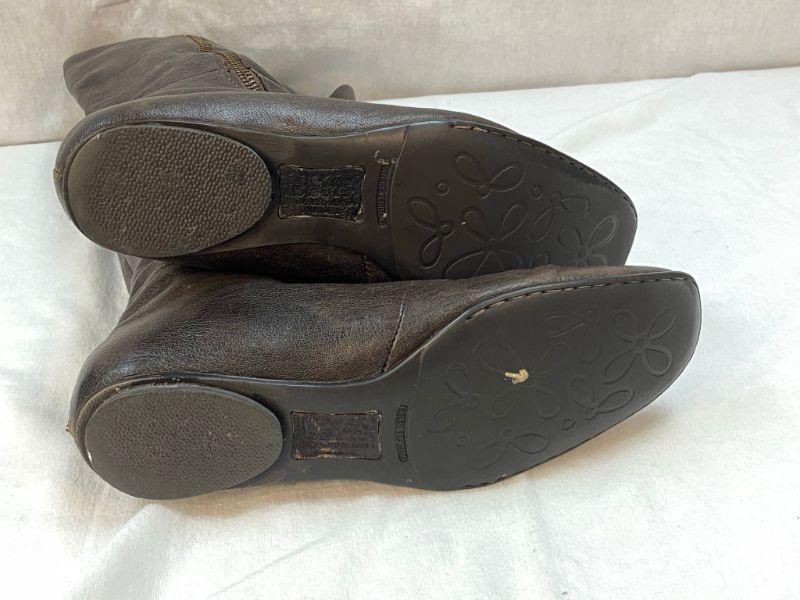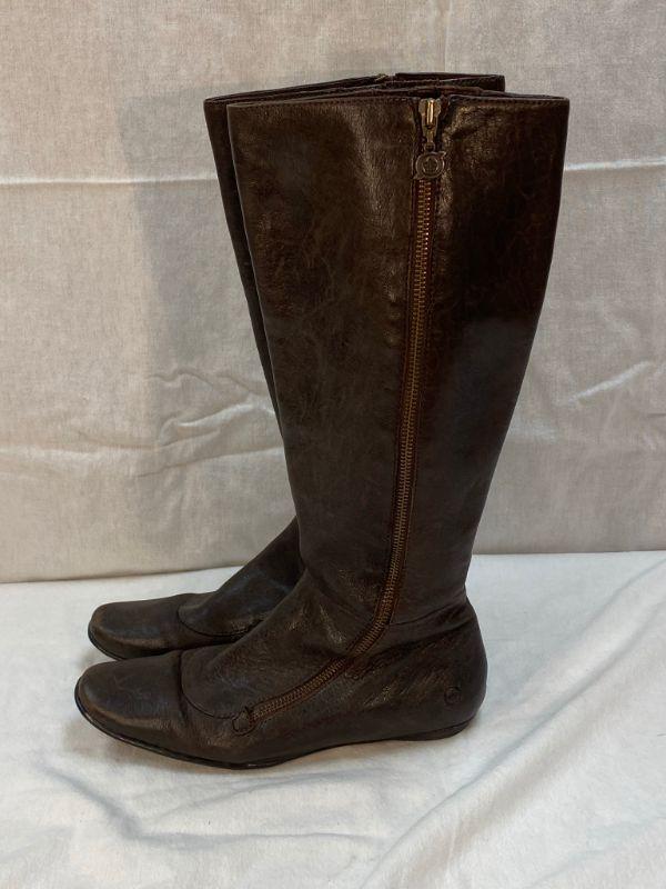 Dark brown leather side zip boots by Born. Zipper is on the outside. Gently used. Size 8.5M. Knee high length.