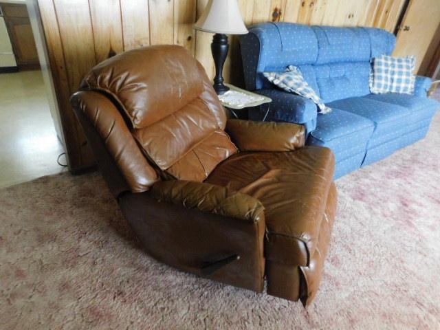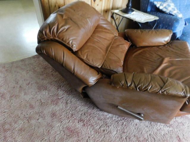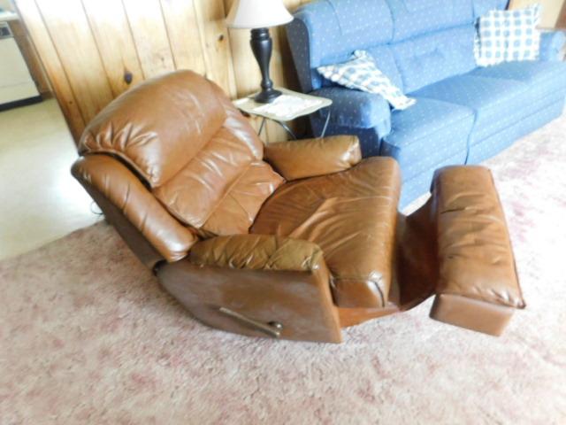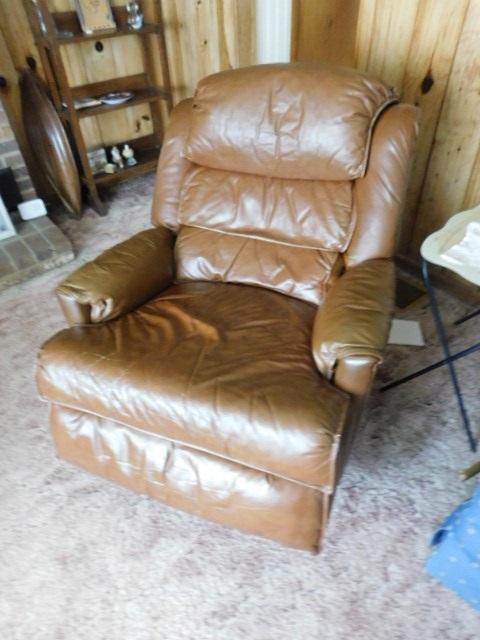 Brown Leather Swivel Rocker Recliner has some wear and picks. Attention: The chair leans back to almost horizontal.