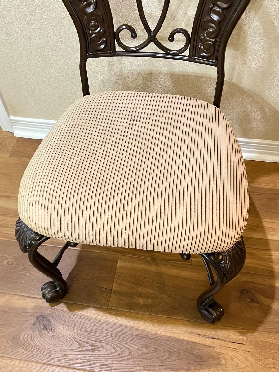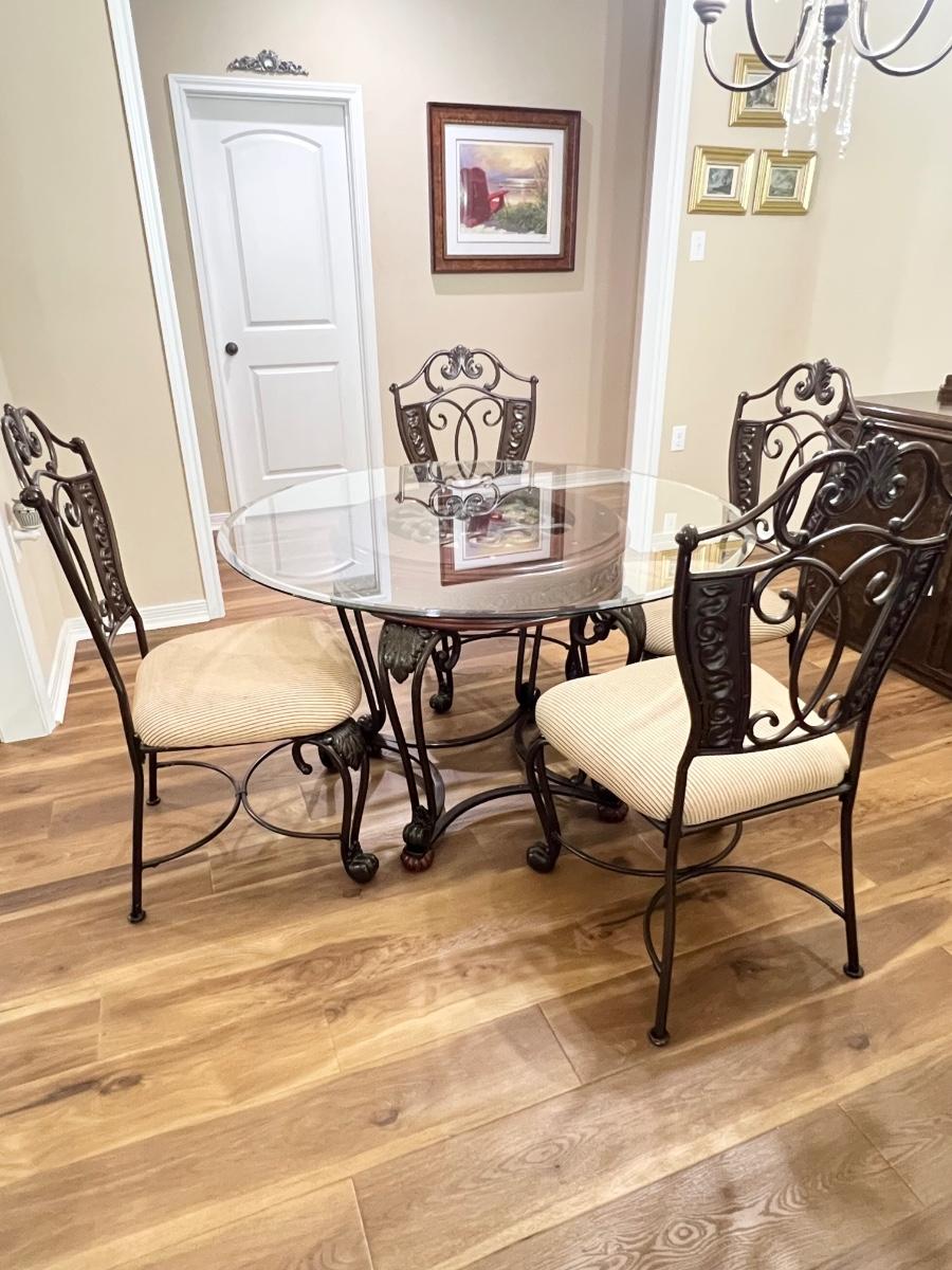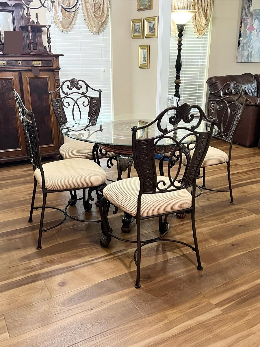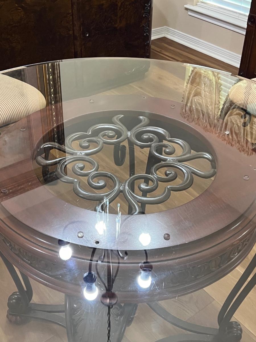 Glass table top has minor scratches due to use ~ Seats have been deodorized, sanitized, & disinfected ~ Seats have a couple of minor spots that may need cleaning, see photos ~ Table = 29.25” H x 48” Round ~ Chairs = 41.75” H x 23” W x 23” D