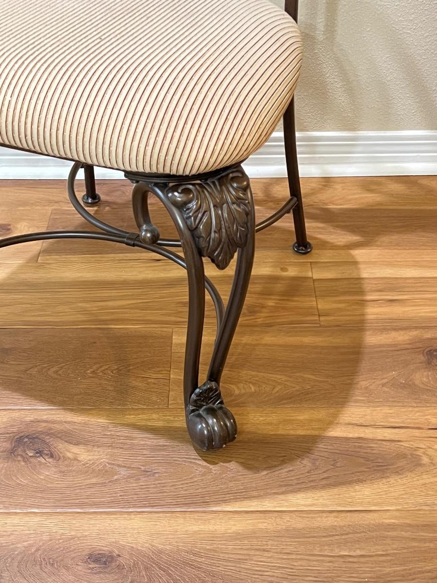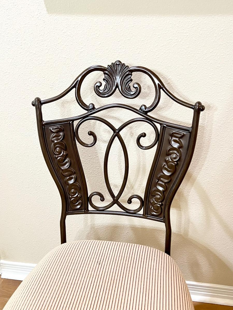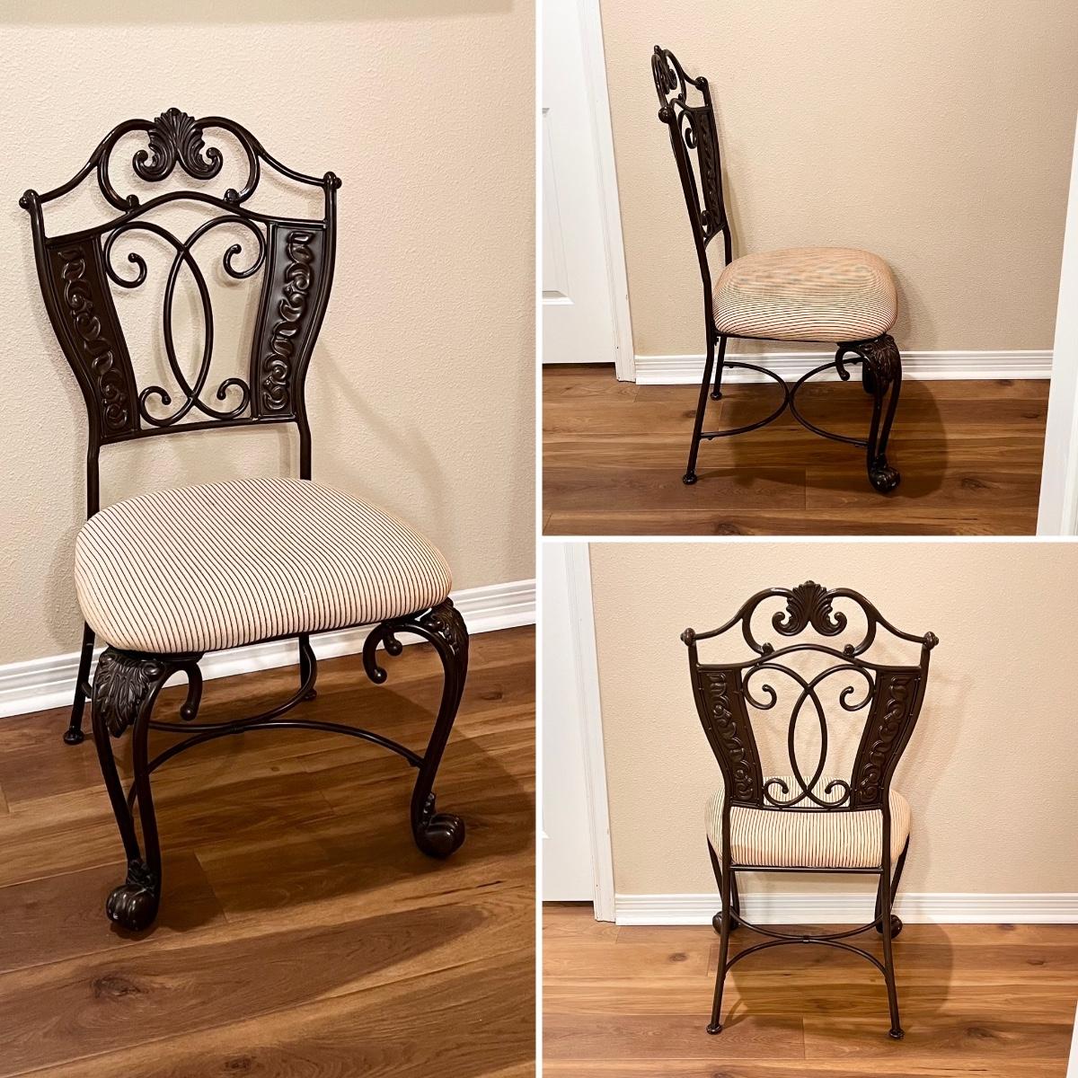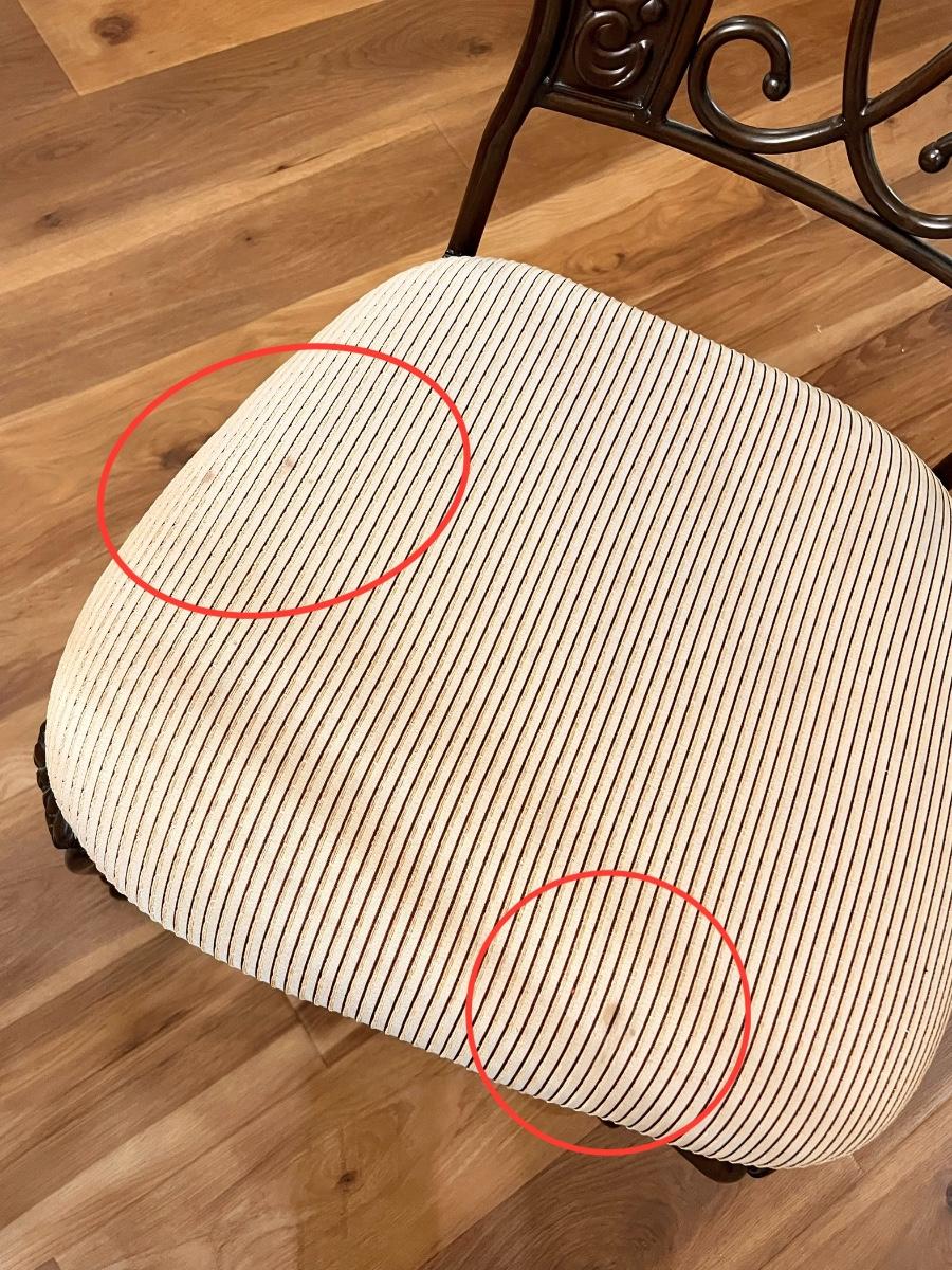 Glass table top has minor scratches due to use ~ Seats have been deodorized, sanitized, & disinfected ~ Seats have a couple of minor spots that may need cleaning, see photos ~ Table = 29.25” H x 48” Round ~ Chairs = 41.75” H x 23” W x 23” D
