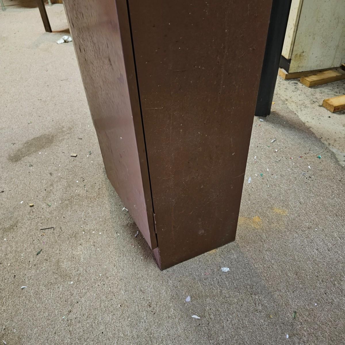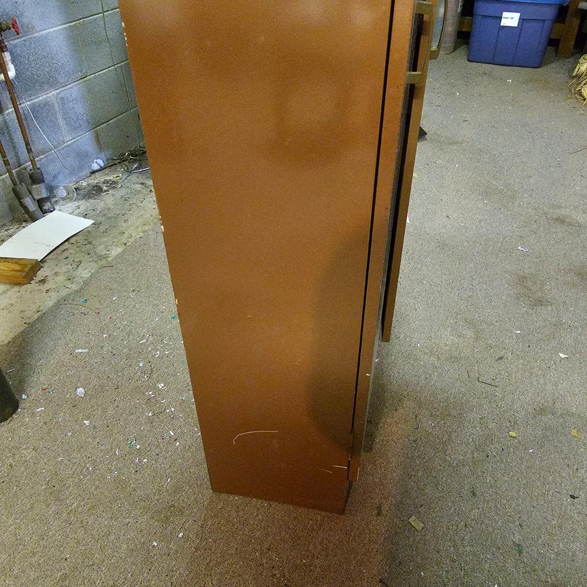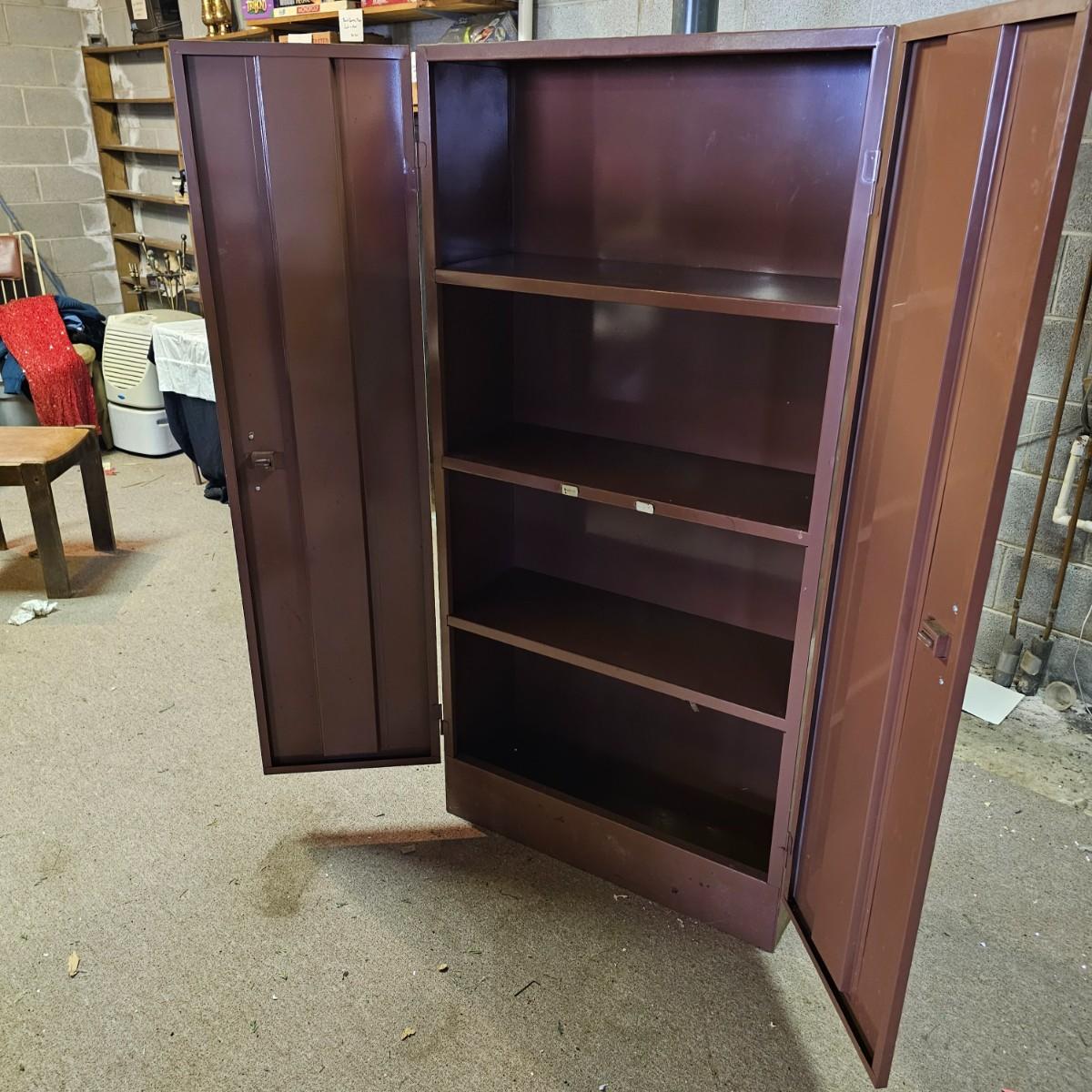 One storage cabinet in brown metal. Unit has three attached shelves and a deeper area at bottom. Unit measures 30" x 12" x 60"h. Stickers, tape and scratches on outside, see photos for details. Local pickup only.