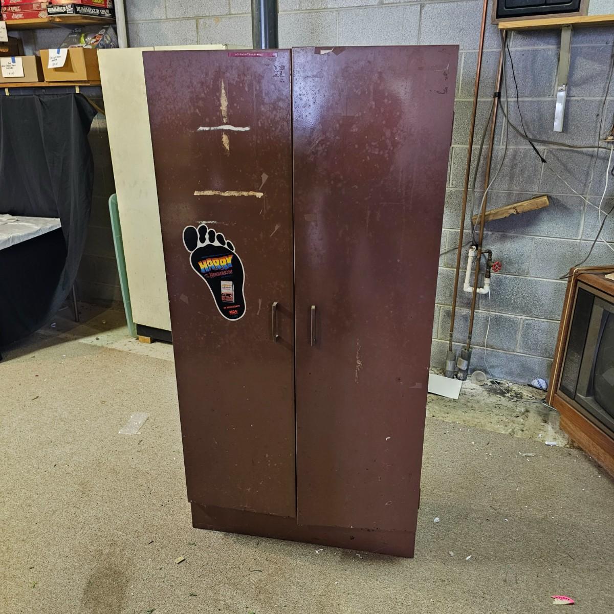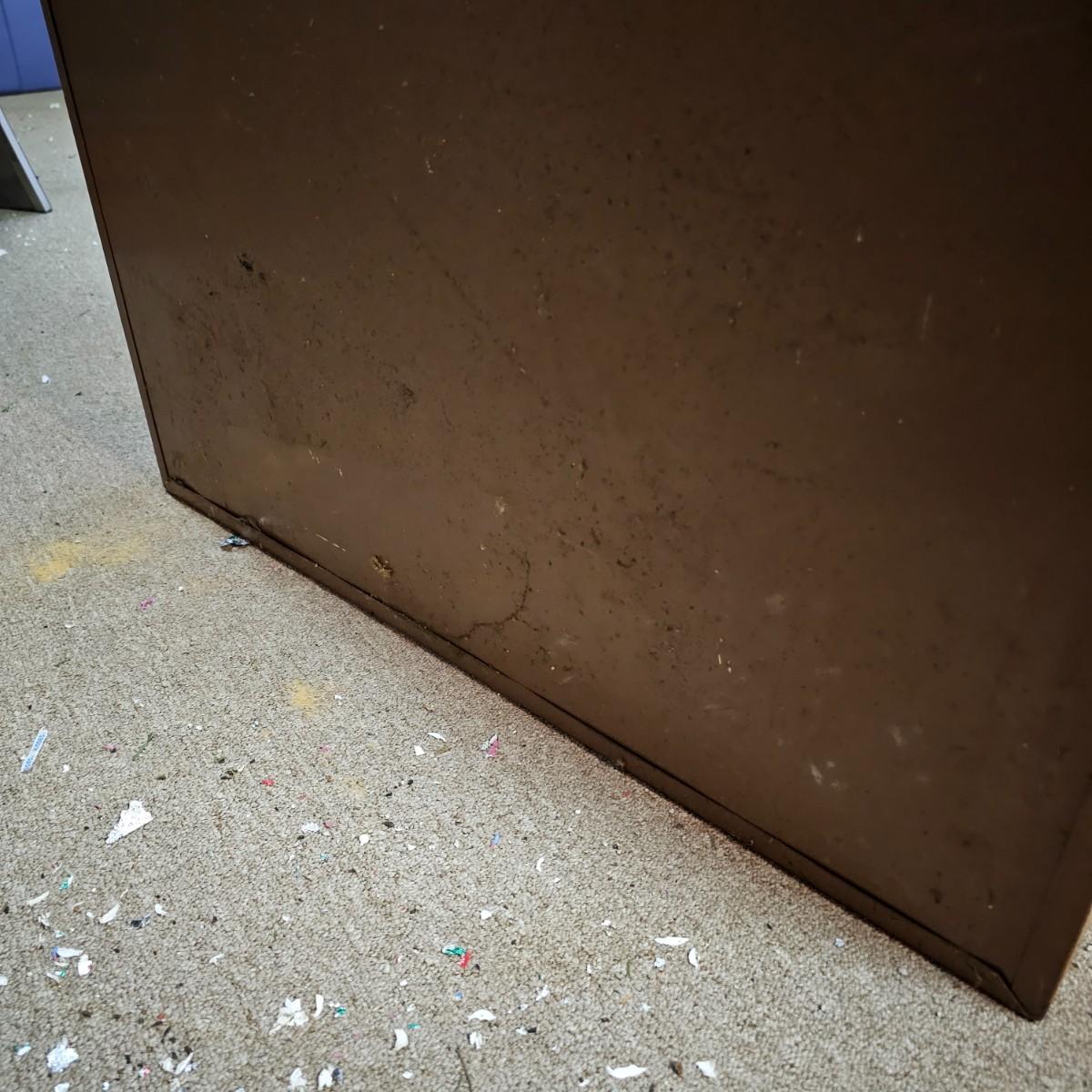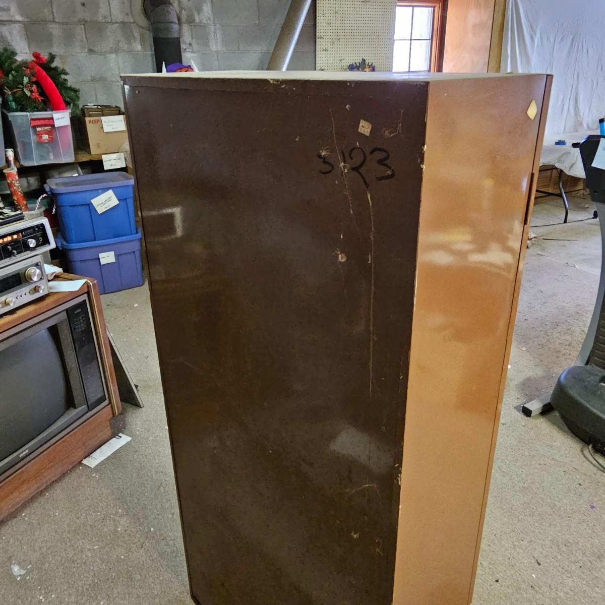 One storage cabinet in brown metal. Unit has three attached shelves and a deeper area at bottom. Unit measures 30" x 12" x 60"h. Stickers, tape and scratches on outside, see photos for details. Local pickup only.