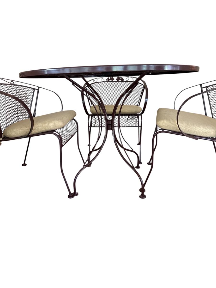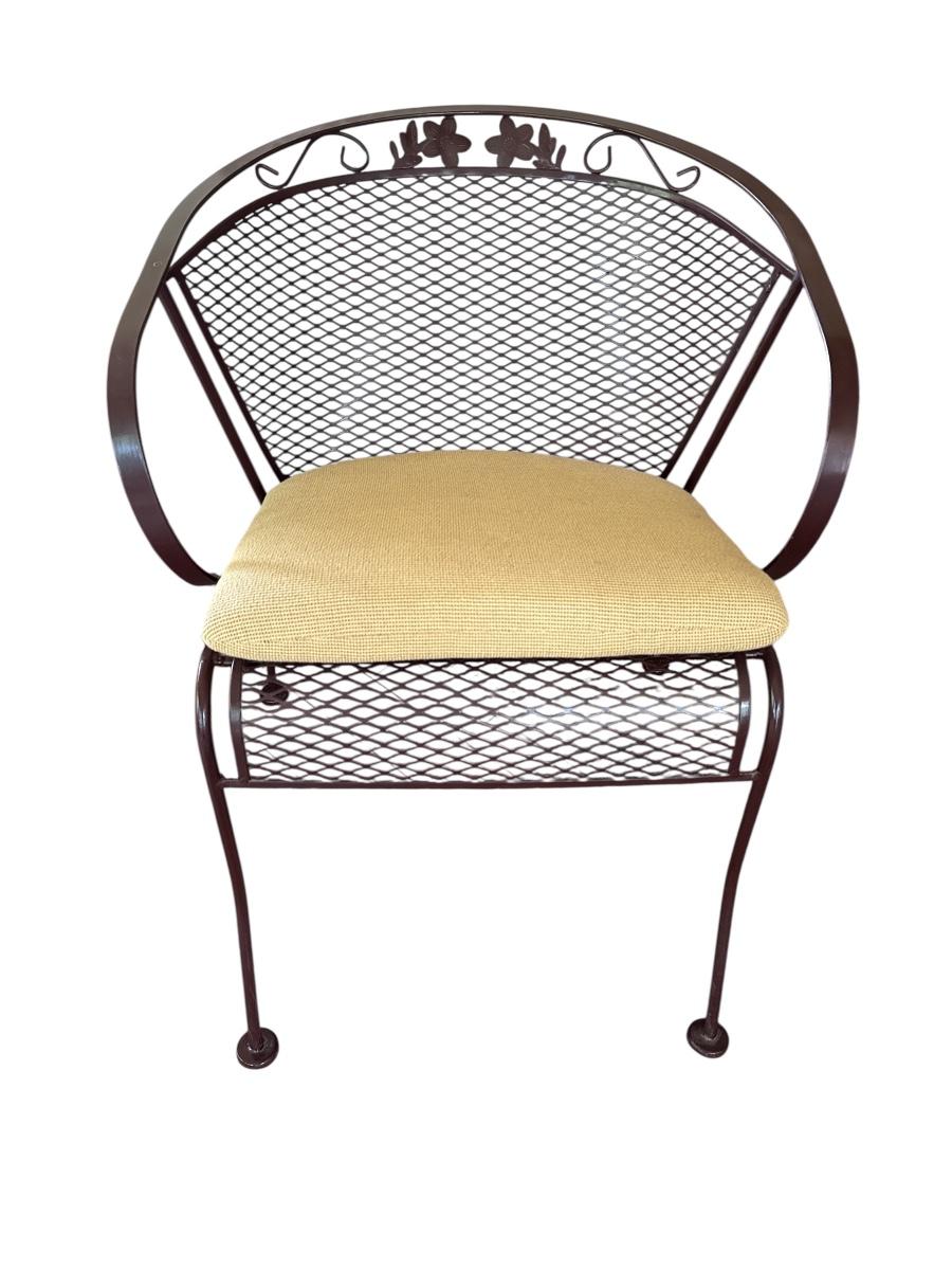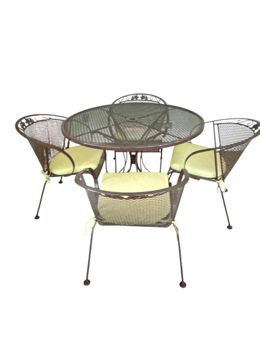 Charming 5-piece vintage-style wrought iron patio set with a 42” round mesh-top table and four coordinating chairs. The sturdy metal frames feature floral scrollwork details and curved lines for a decorative touch. Chairs include removable pale yellow seat cushions for added comfort. Durable and weather-resistant—perfect for outdoor dining or garden seating.