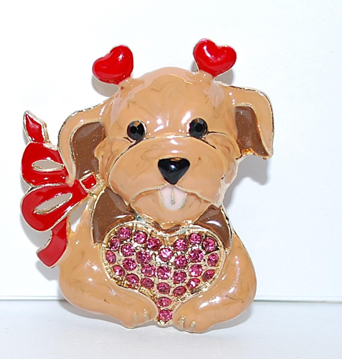 Brown PUPPY BROOCH (1¾" x 1¾") with a Pink Stone "Pave" HEART and Red-Heart Ears & Bow and Gold Tone Setting
