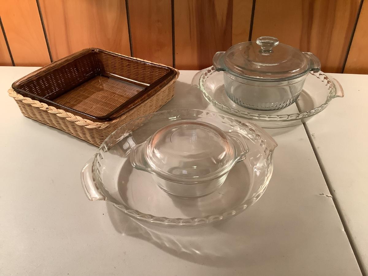 Brown Pyrex w/basket, Anchor Hocking bowl lid lot
