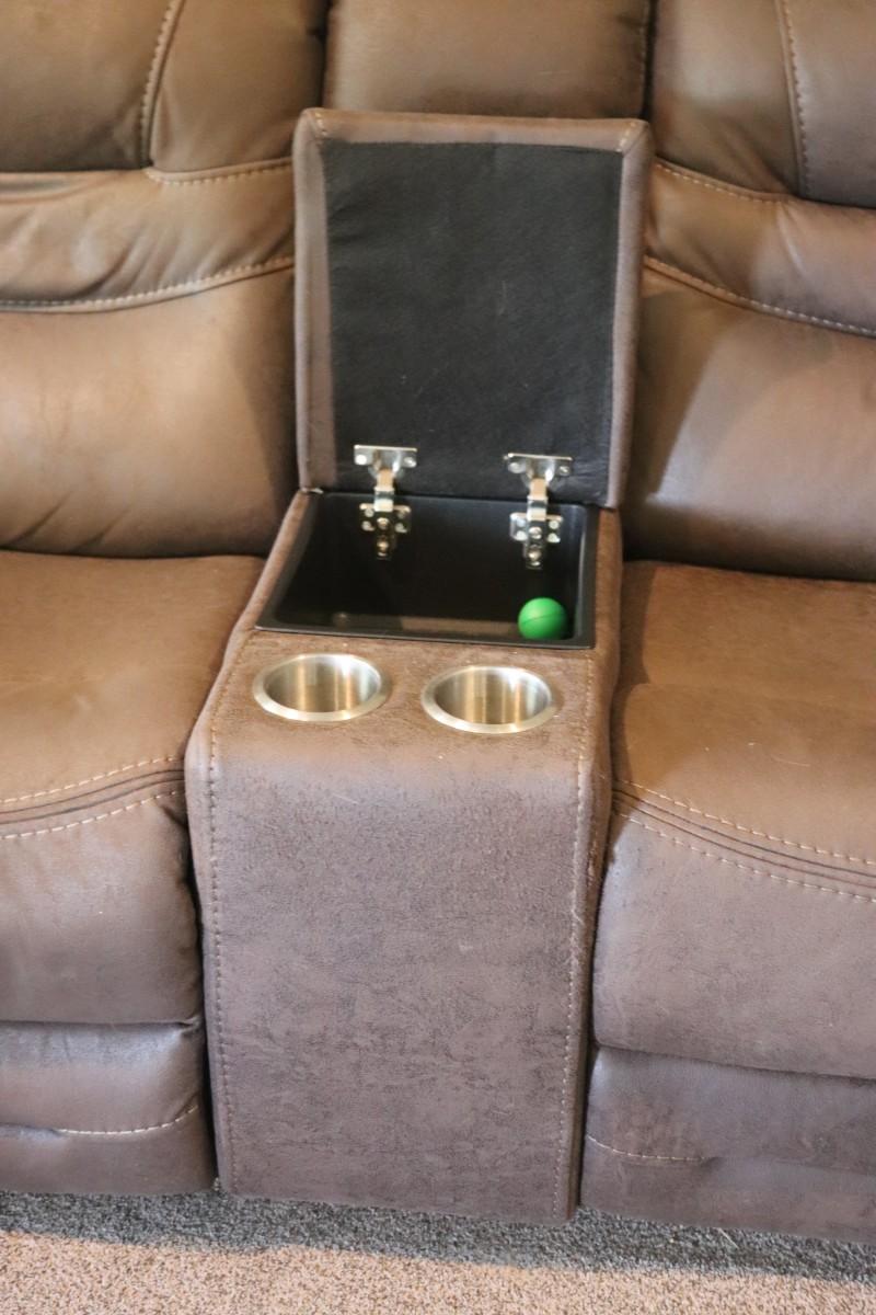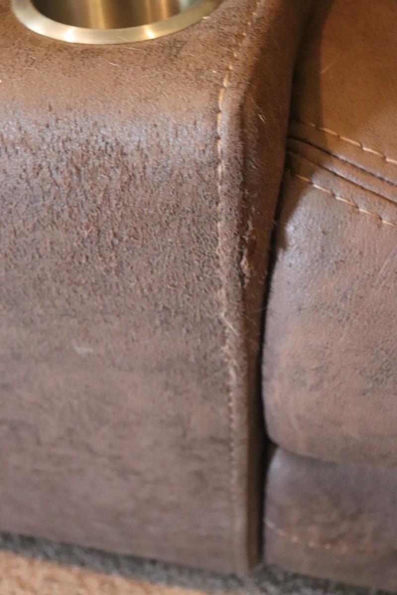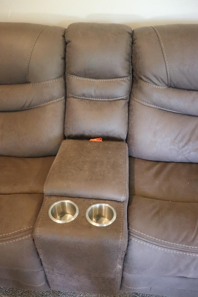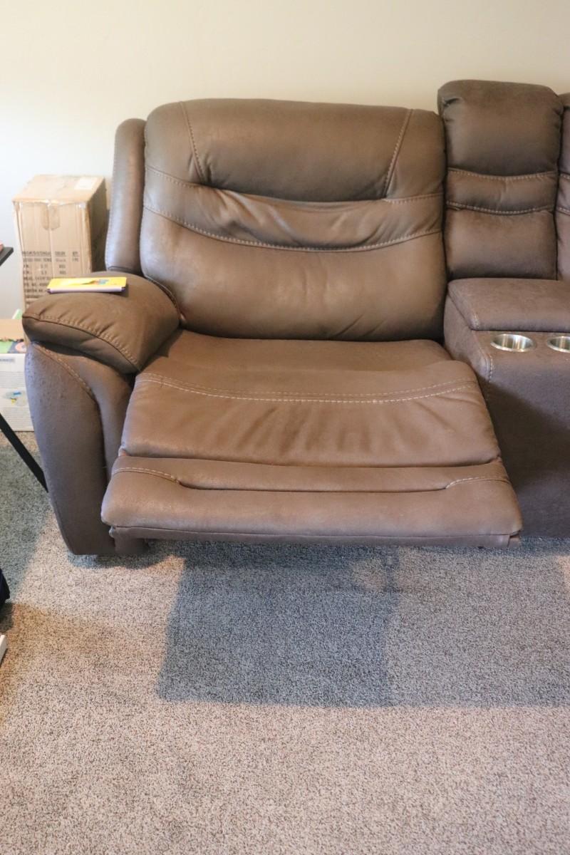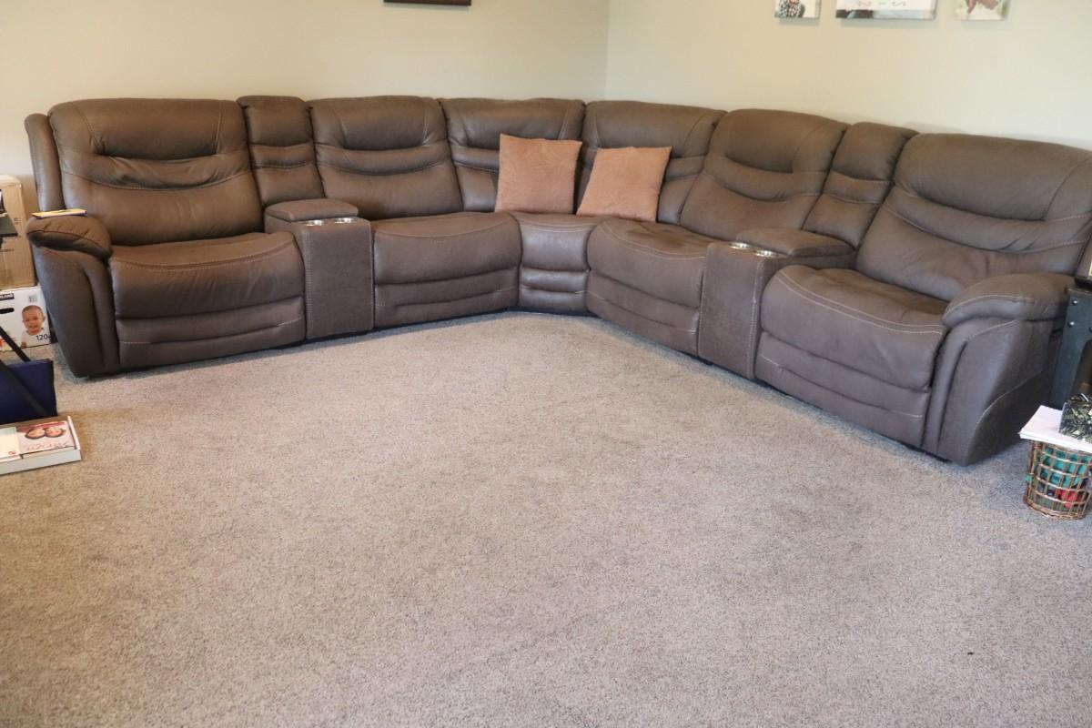 This lot features a three-piece sectional reclining couch designed to comfortably seat six people. The couch comes in a rich brown color, adding warmth and style to your living space. Perfect for family gatherings or movie nights, it offers both comfort and functionality with its reclining feature. Ideal for anyone looking to enhance their home with a spacious and inviting seating option.