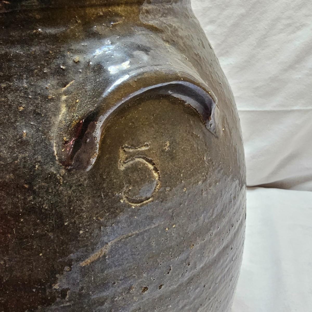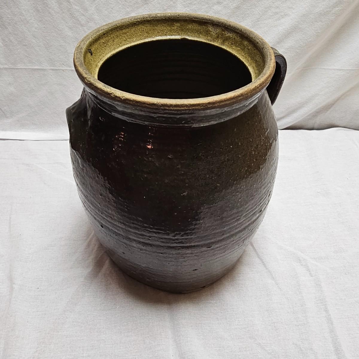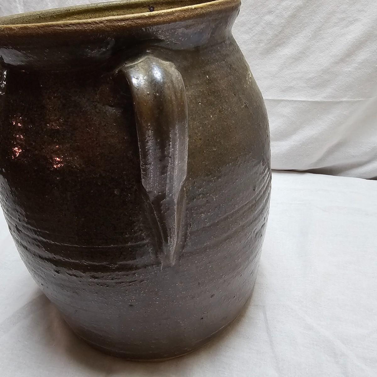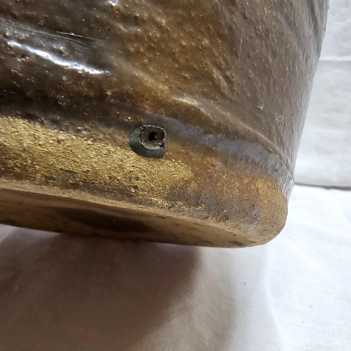 Beautiful turned pottery crock with brown pebbled finish. Crock is glazed inside and out, has finger grip handles on two sides. Crock measures 11"D x 13"H, has 7.25" opening at mouth. The number '5' is stamped below one handle and some other wording at bottom, unable to make out. Small discrepancies in outside finish and a chip and small crack in top lip. See photos for details. Local pickup only.