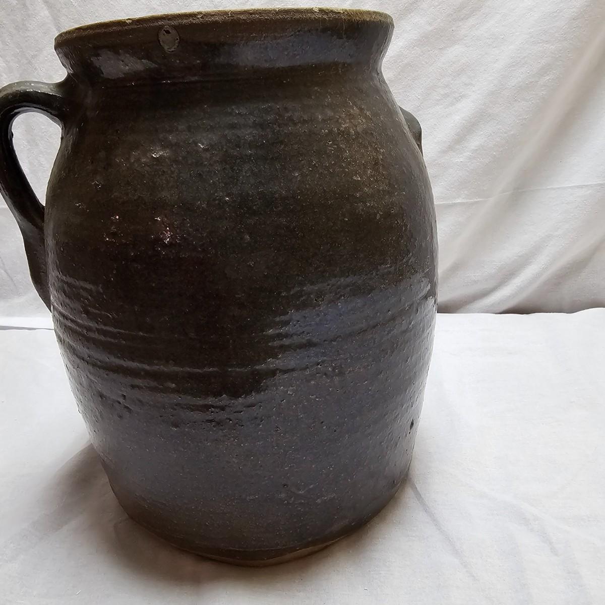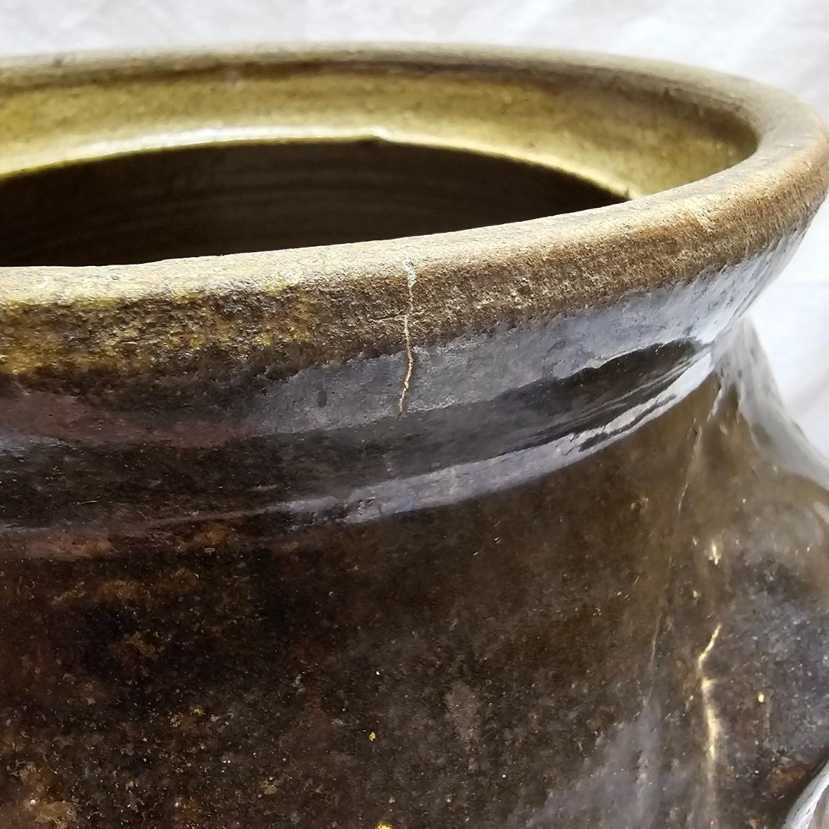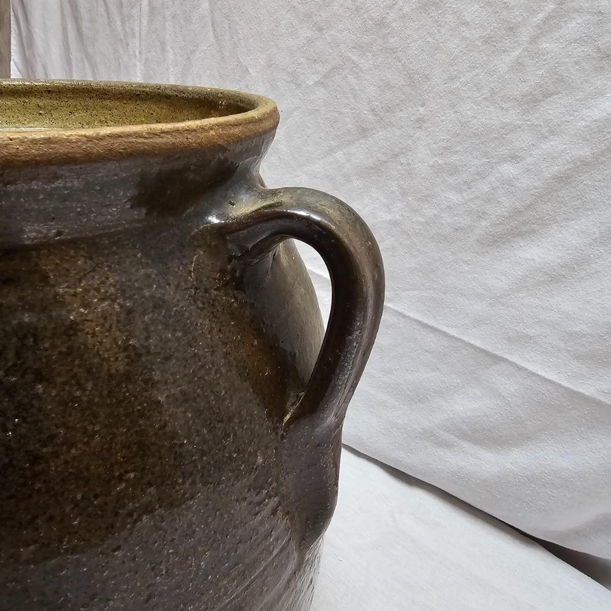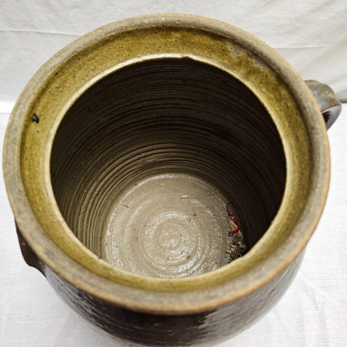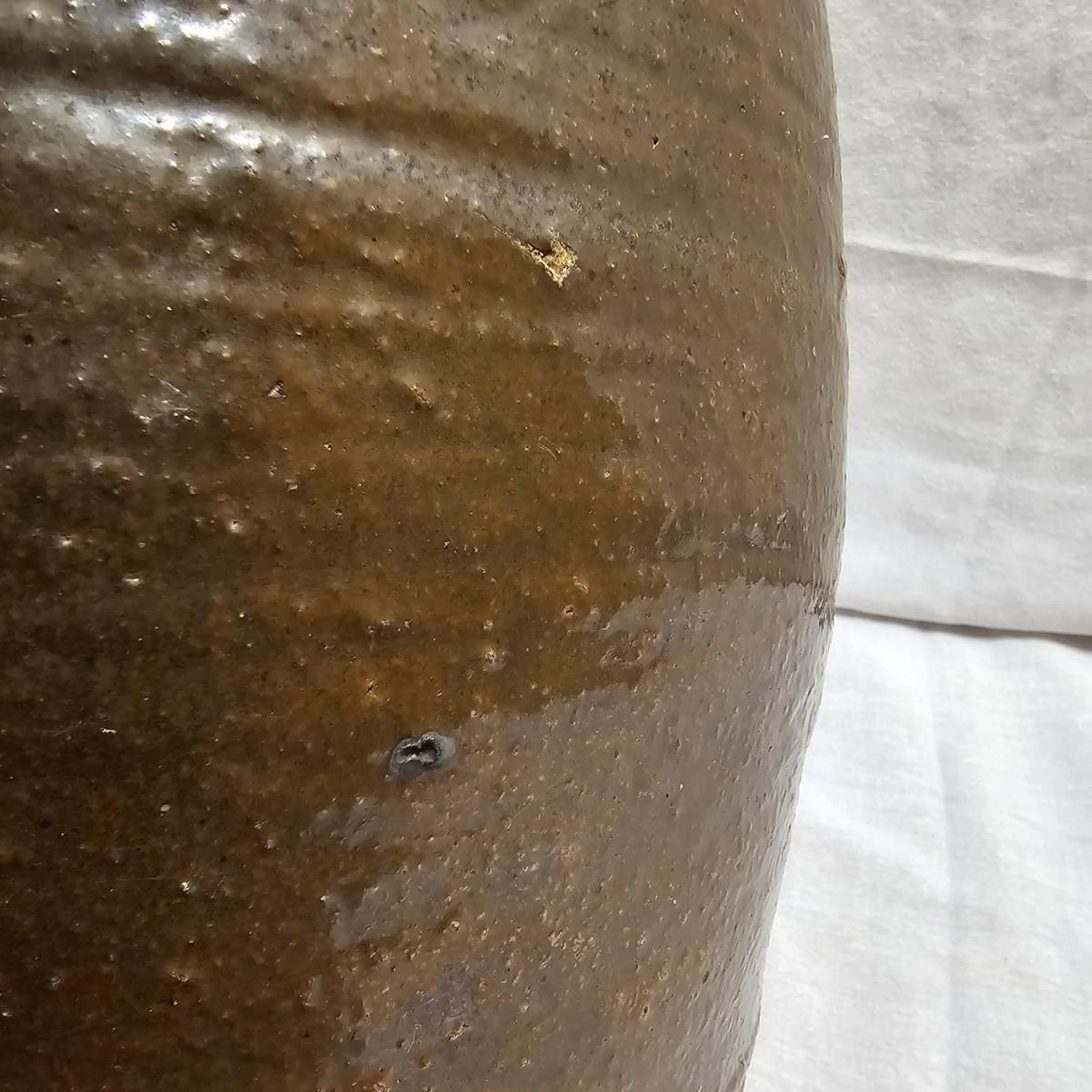 Beautiful turned pottery crock with brown pebbled finish. Crock is glazed inside and out, has finger grip handles on two sides. Crock measures 11"D x 13"H, has 7.25" opening at mouth. The number '5' is stamped below one handle and some other wording at bottom, unable to make out. Small discrepancies in outside finish and a chip and small crack in top lip. See photos for details. Local pickup only.