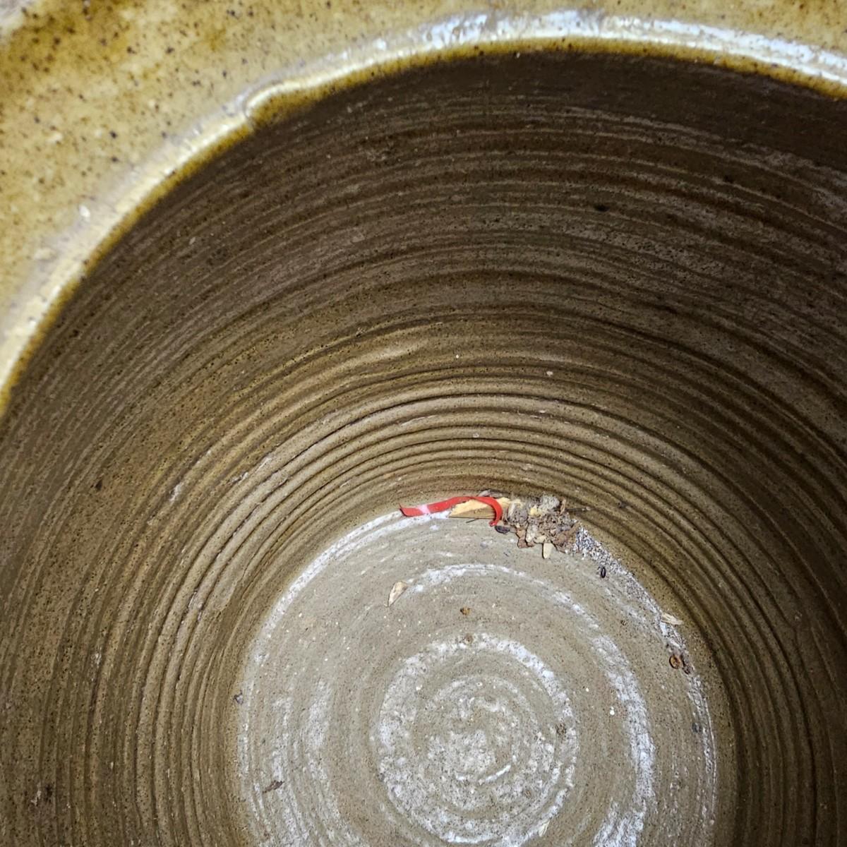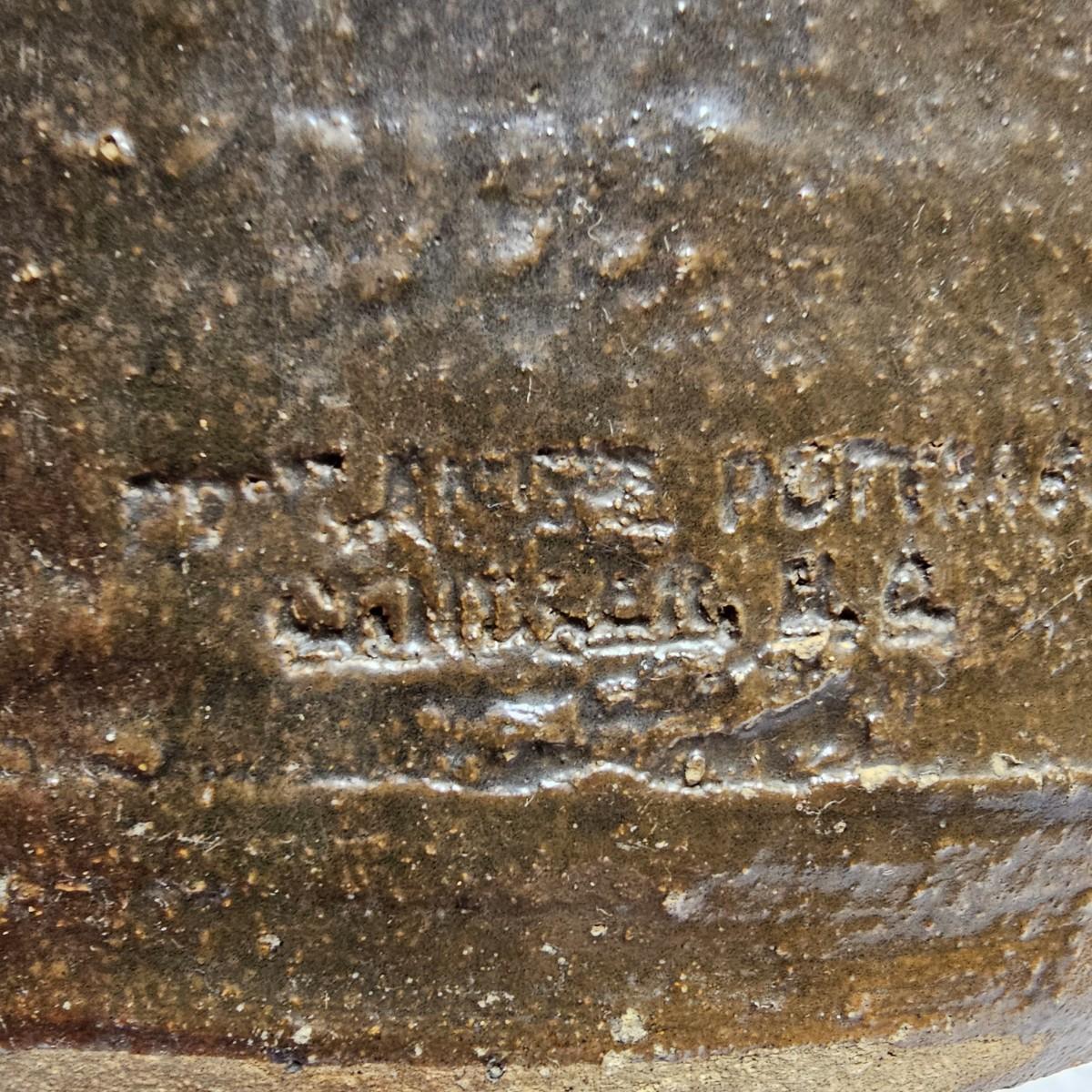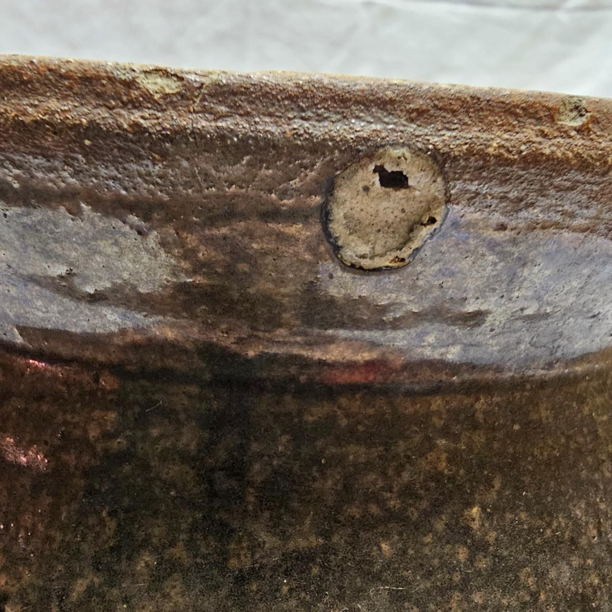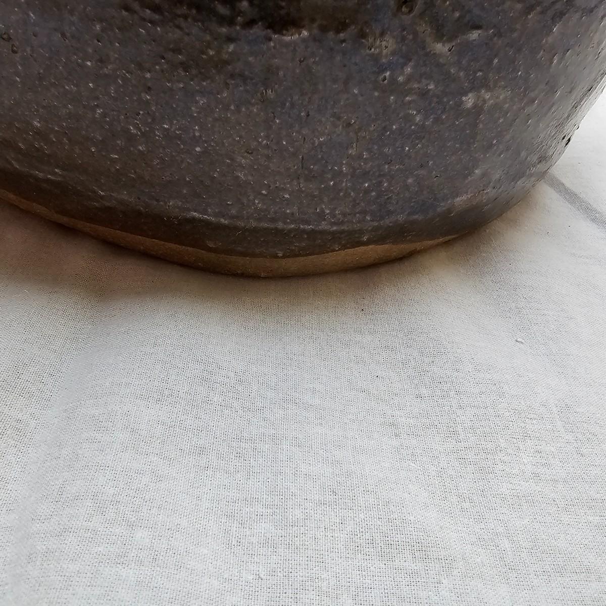 Beautiful turned pottery crock with brown pebbled finish. Crock is glazed inside and out, has finger grip handles on two sides. Crock measures 11"D x 13"H, has 7.25" opening at mouth. The number '5' is stamped below one handle and some other wording at bottom, unable to make out. Small discrepancies in outside finish and a chip and small crack in top lip. See photos for details. Local pickup only.