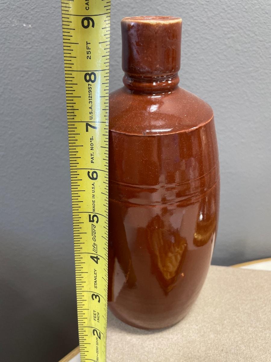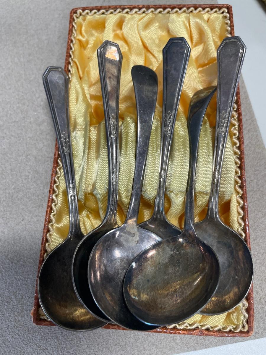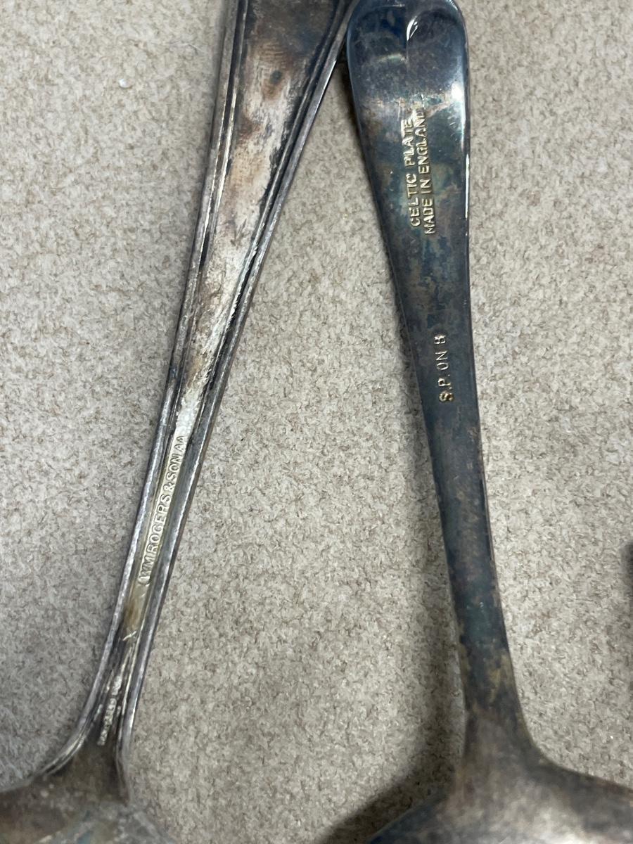 Brown stoneware vase and silver plate spoons but not all are stamped plate